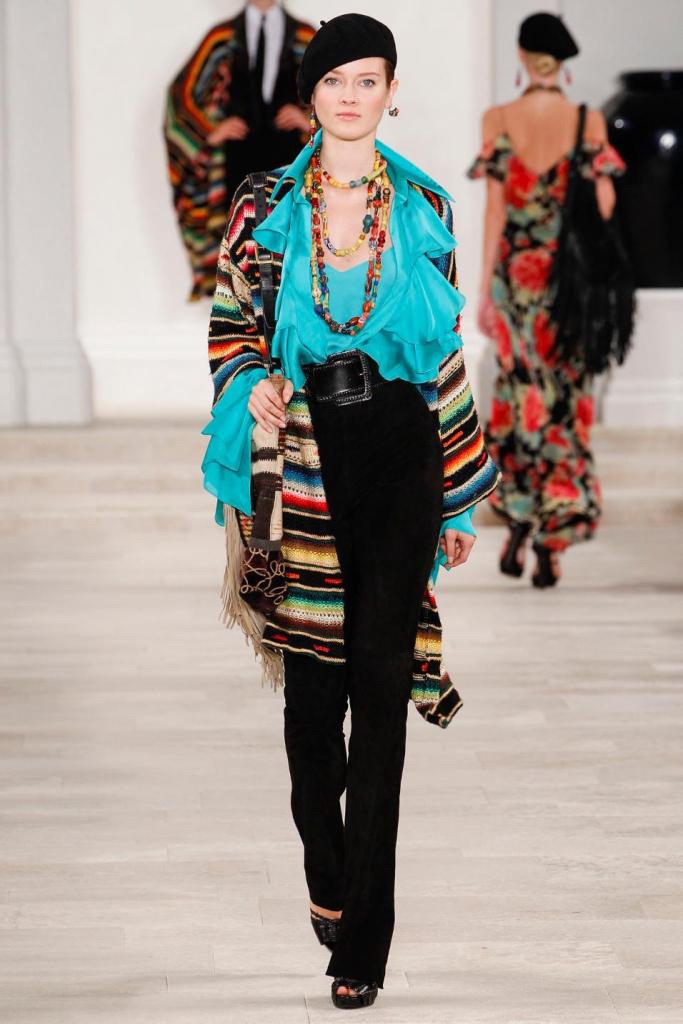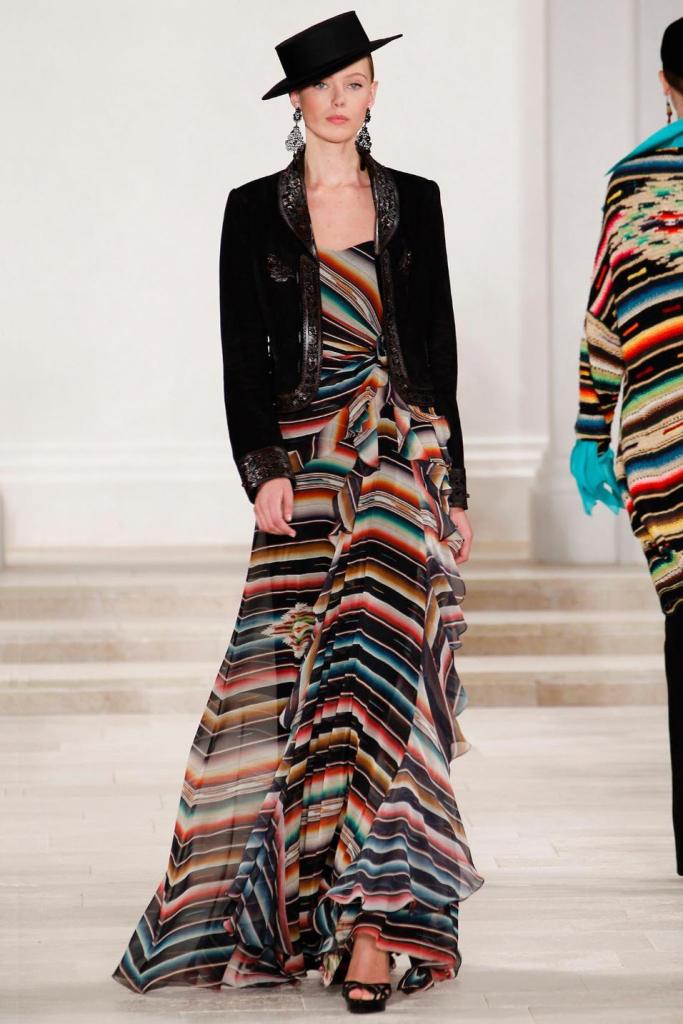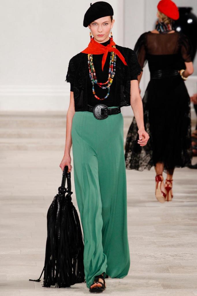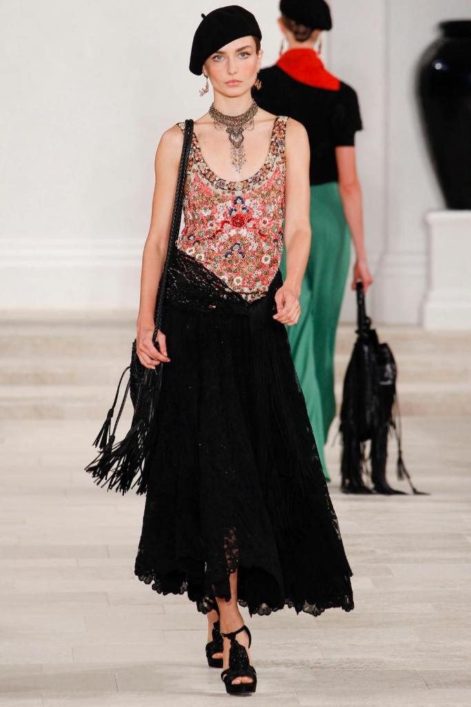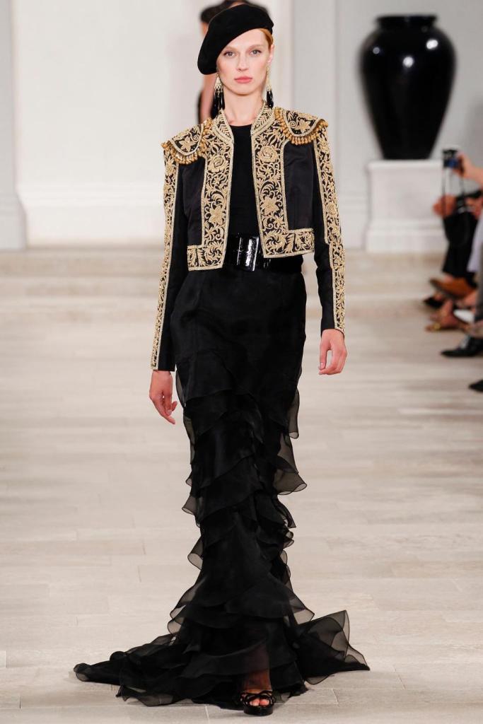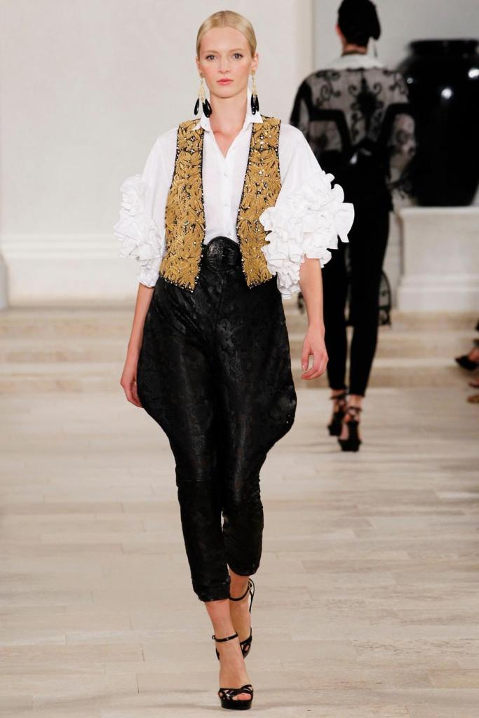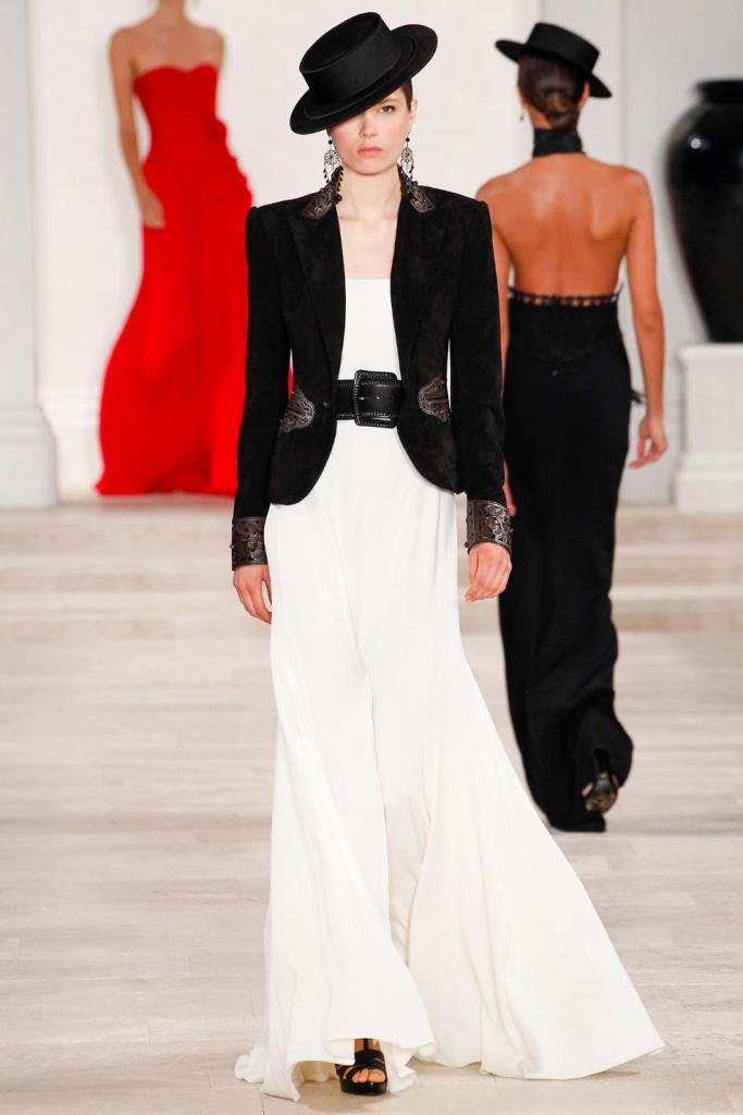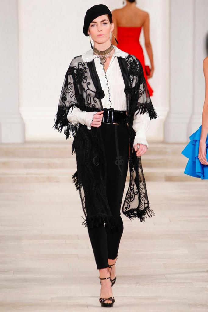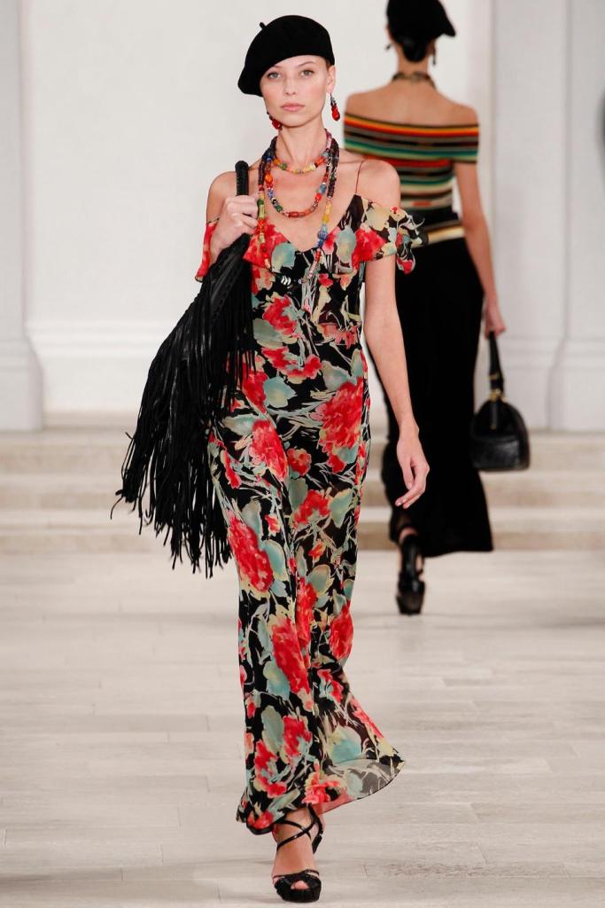 Rich references were taken from Latin America and Spain in this Ralph Lauren collection. Exquisite shades of red and turquoise complimented the classic black & white brought to life through relaxed tailoring. Crochet, embroidery, ruffles, beading, fringe and leather details made special appearances. Palazzo pants, ruffled tops, bolero jackets, vibrant dresses and floral maxis were some standouts here. Gorgeous Gorgeous slinky gowns ended the collection; models glided down the runway draped in classic American beauty.