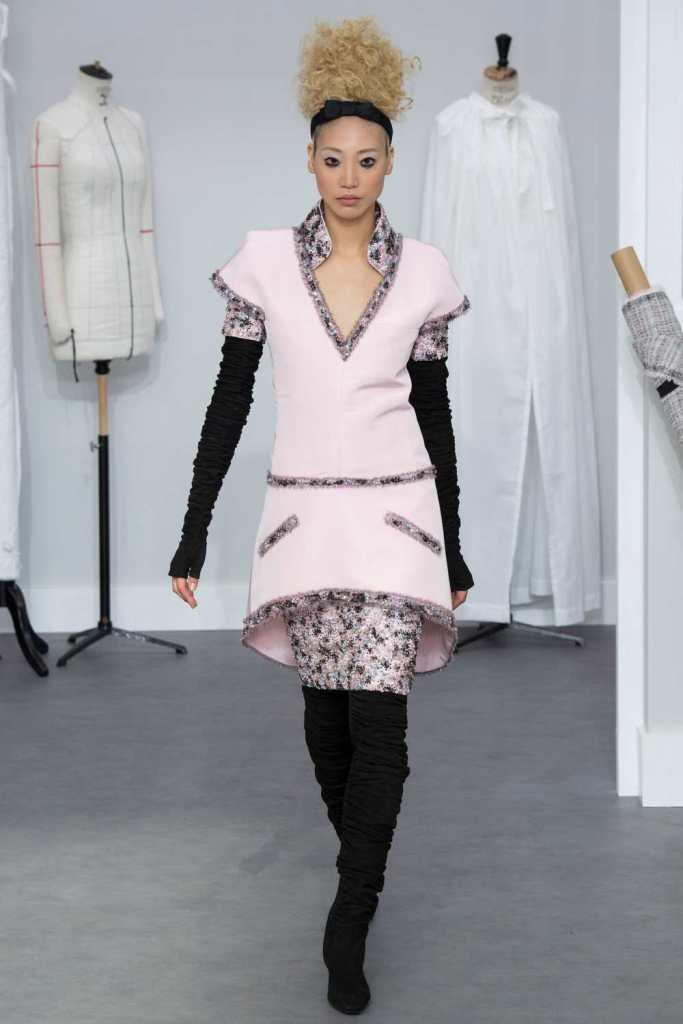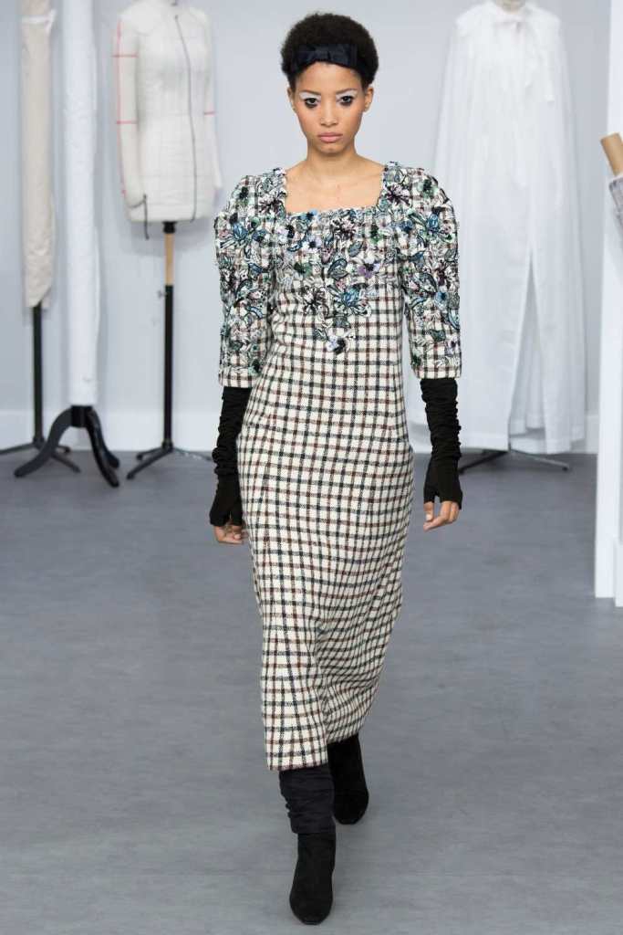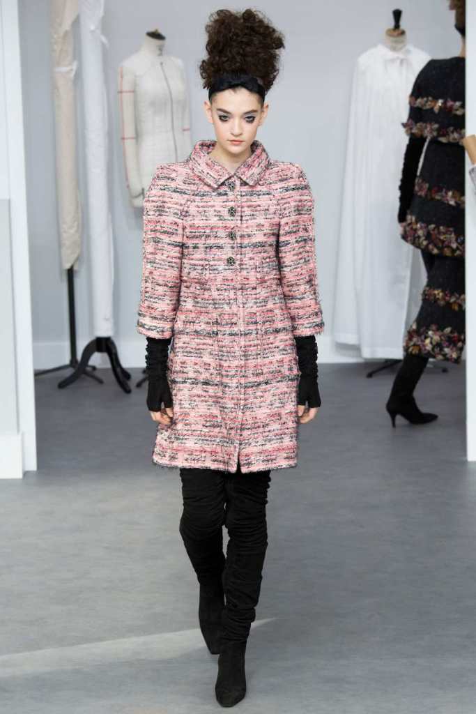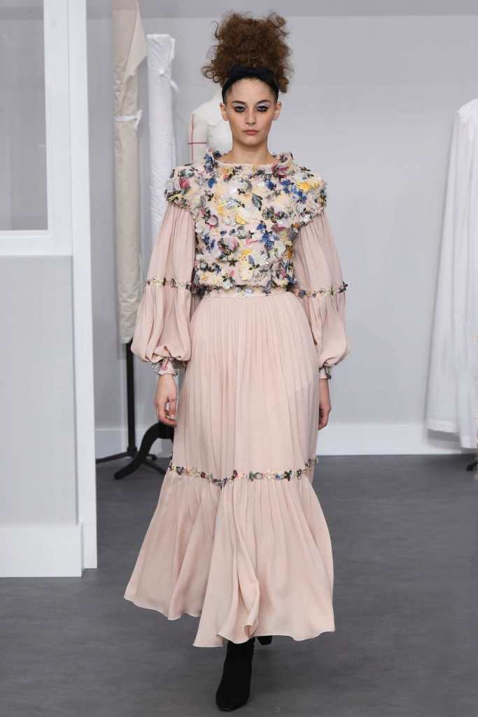 Clothes were quite heavy on tweed in restrained colors. Suits in all shapes and forms, most featuring strong shoulders. Permutations ranged not only in structure but in color and texture. Intricately embroidered skirts suits and coat dresses make up the majority of the collection; the ideal go-to look for Chanel clients. The clothes gradually moved to some gowns and then fancier gowns. The details in this collection were exquisite from the embellishments to sequins and 3D flowers to tulle flowers. Kitten heels ruched boots and fingerless gloves were paired with every look. The final bridal look was blush pink; cropped trousers, a crystal-embellished jacket and a sumptuous feather train. This was a standout collection even for Lagerfeld era Chanel.