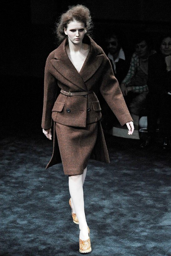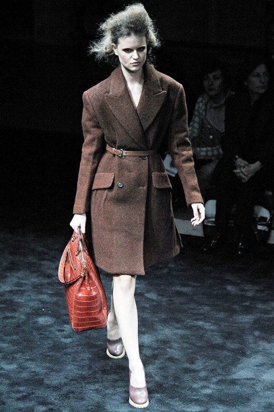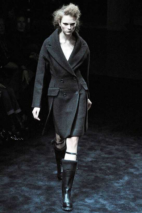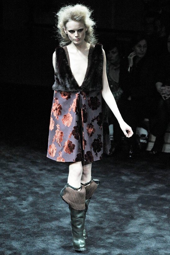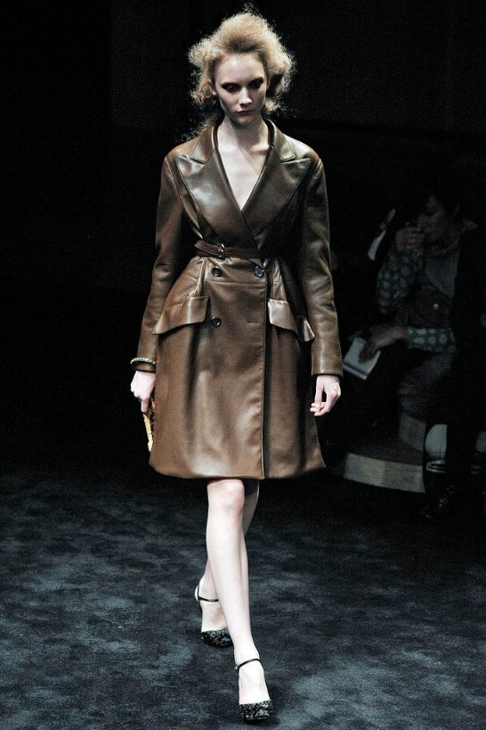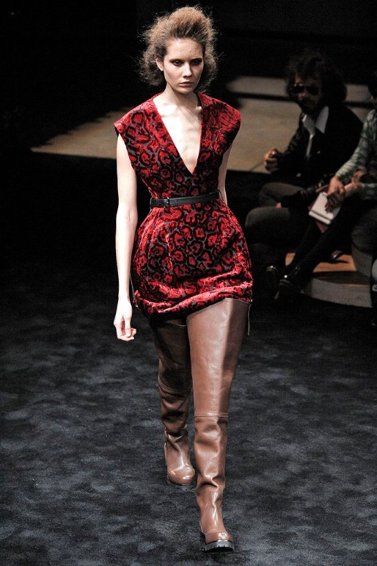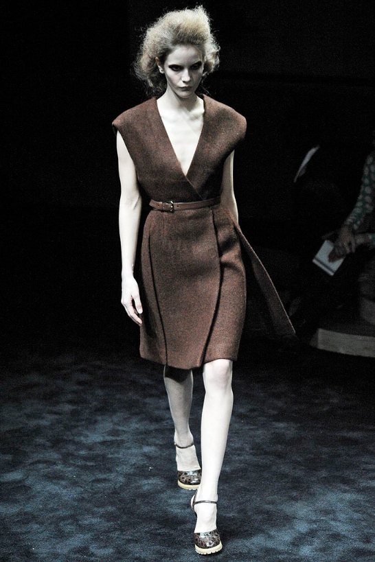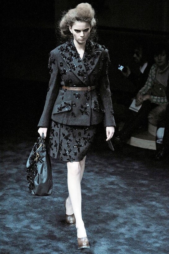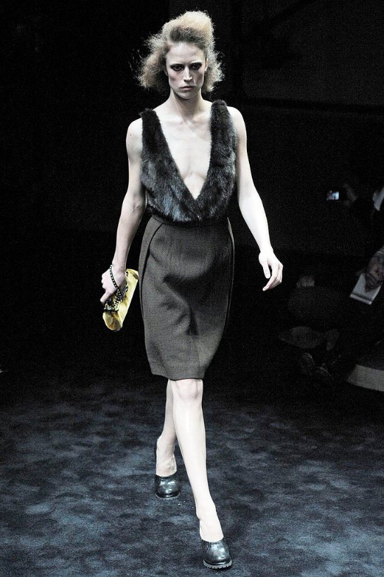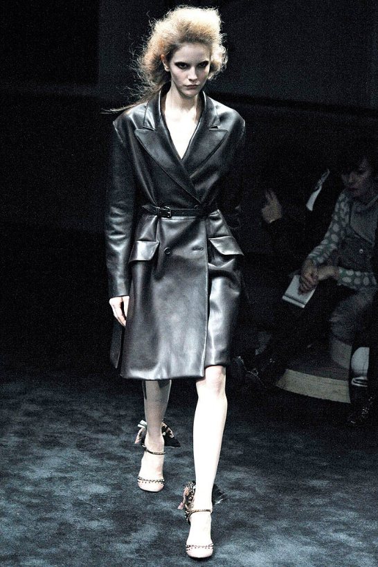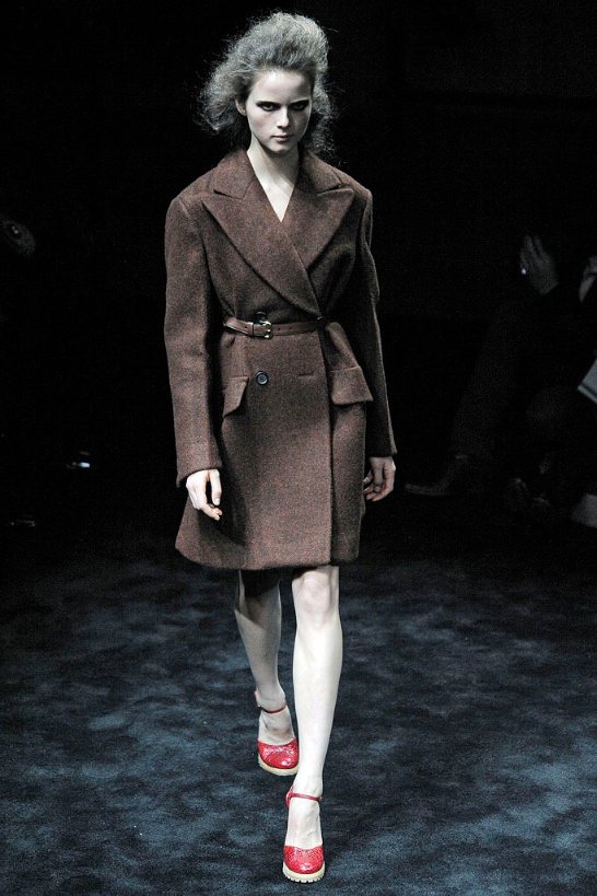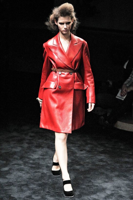Dressed in Military ready clothes with ultra frizzed hair was Miuccia Prada’s woman in this collection. The clothes were heavy on textures featuring thick wools, devoré velvet, furs, knits and lux leathers; all done in immaculate sharp tailoring. The colors were mostly brown and block with occasional red and rust appearances leaning hard into a moody gloomy winter. There were standouts not limited to flapper dresses, big boots, extra deep necklines, 50s high-waisted shorts, big jacket lapels and fur dresses. And Prada will always give us some delicious coats, this collection was no exception. The show closed with some statement embellished leather fringed dresses. The collection is balanced between 80s power suits and wilderness; clothes with just the right amount of edge. A restrained and powerful collection.