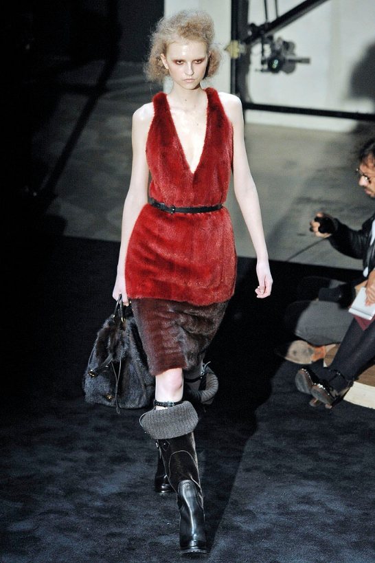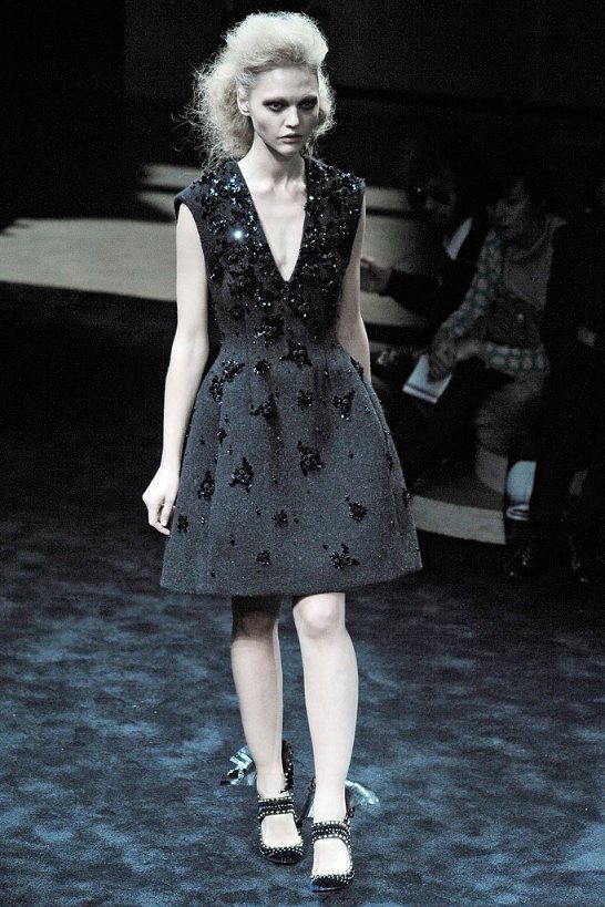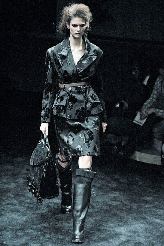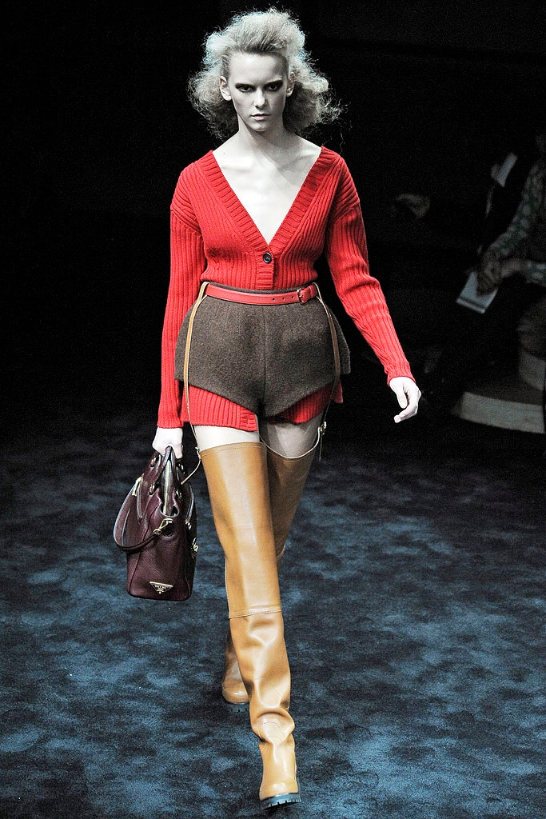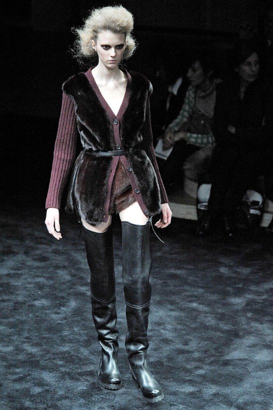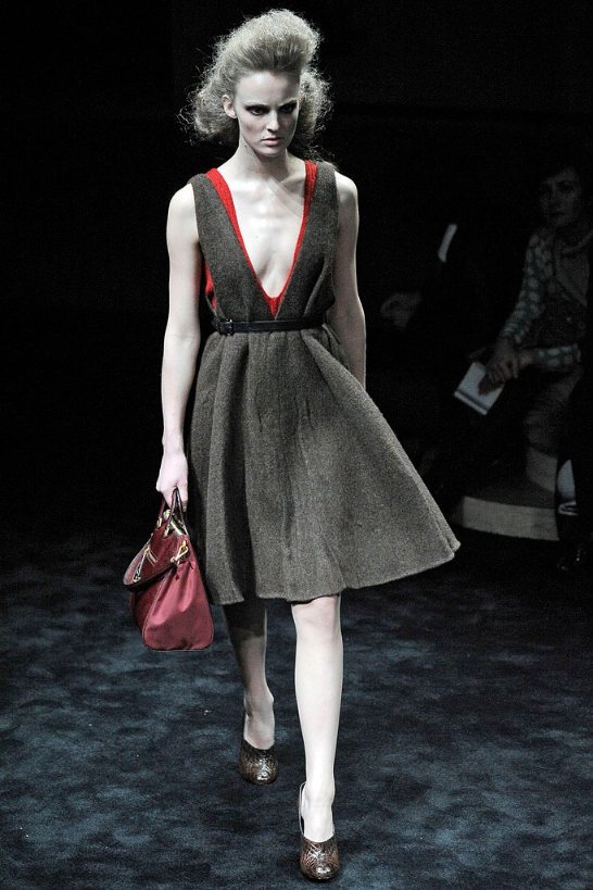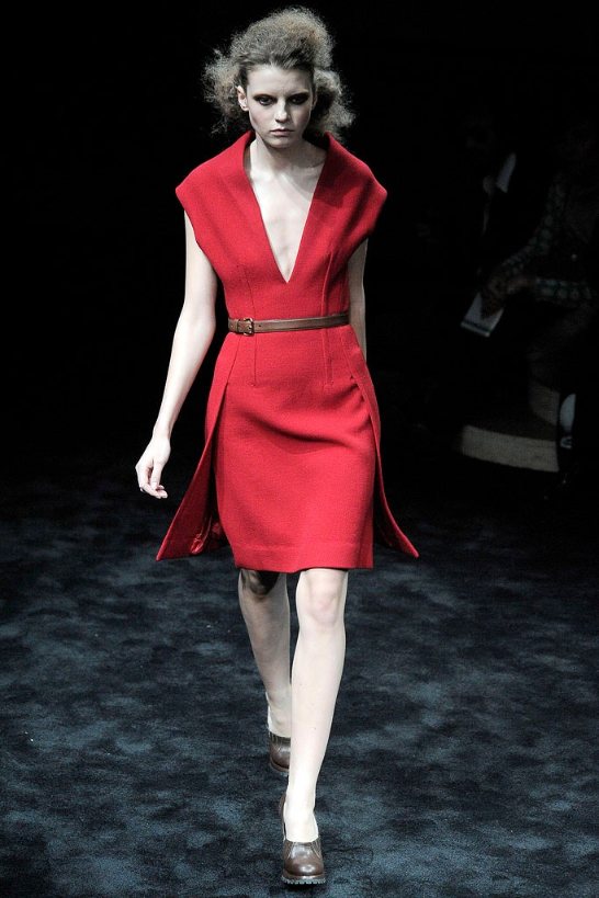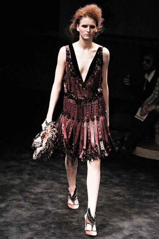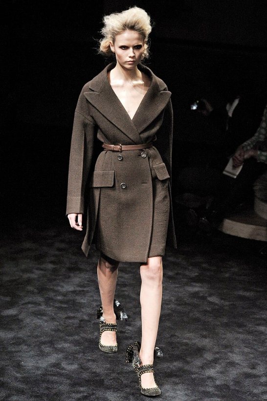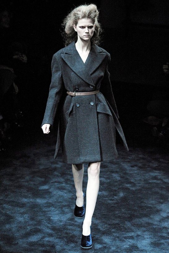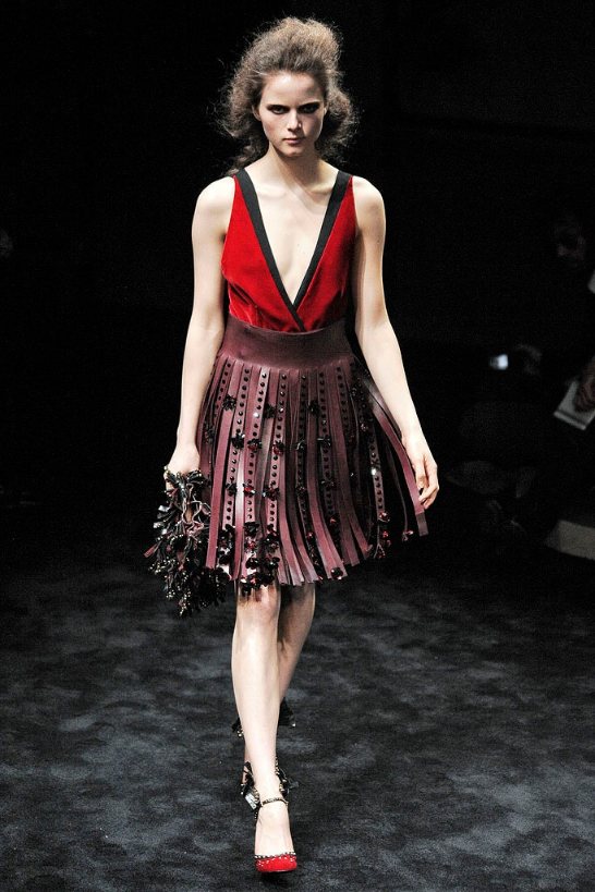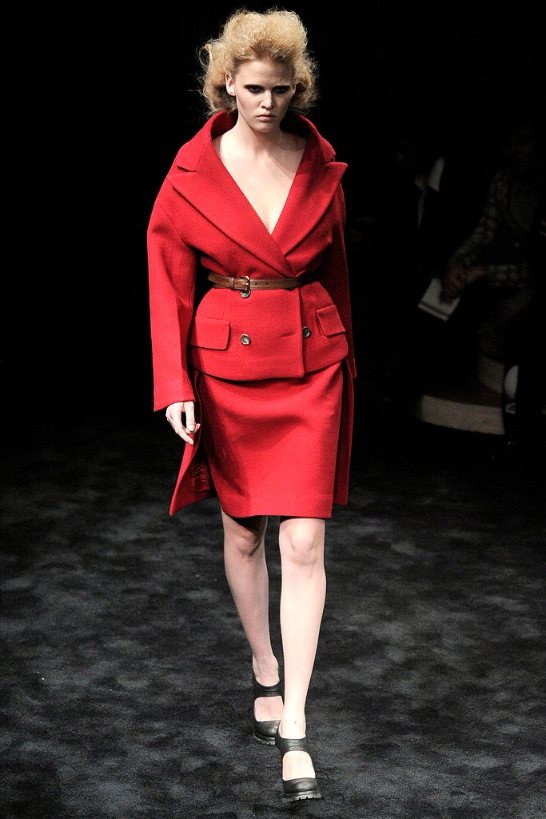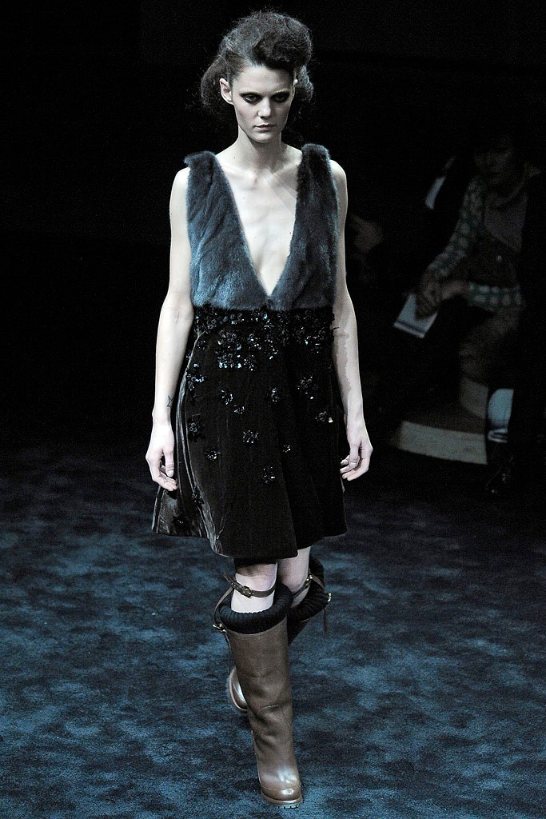 Dressed in Military ready clothes with ultra frizzed hair was Miuccia Prada’s woman in this collection. The clothes were heavy on textures featuring thick wools, devoré velvet, furs, knits and lux leathers; all done in immaculate sharp tailoring. The colors were mostly brown and block with occasional red and rust appearances leaning hard into a moody gloomy winter. There were standouts not limited to flapper dresses, big boots, extra deep necklines, 50s high-waisted shorts, big jacket lapels and fur dresses. And Prada will always give us some delicious coats, this collection was no exception. The show closed with some statement embellished leather fringed dresses. The collection is balanced between 80s power suits and wilderness; clothes with just the right amount of edge. A restrained and powerful collection.