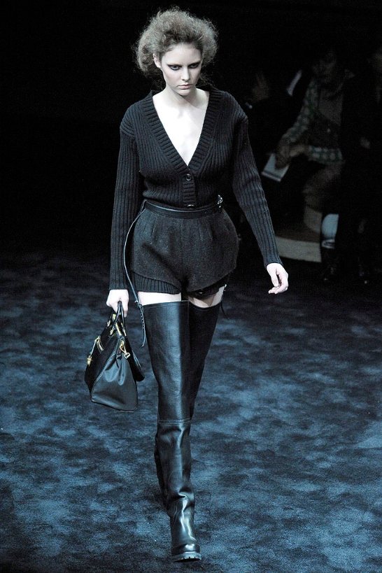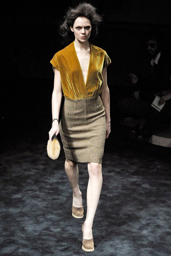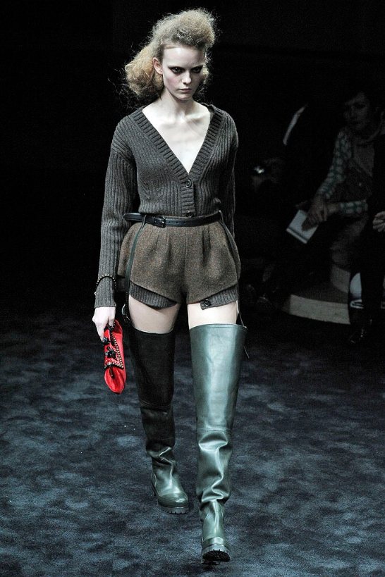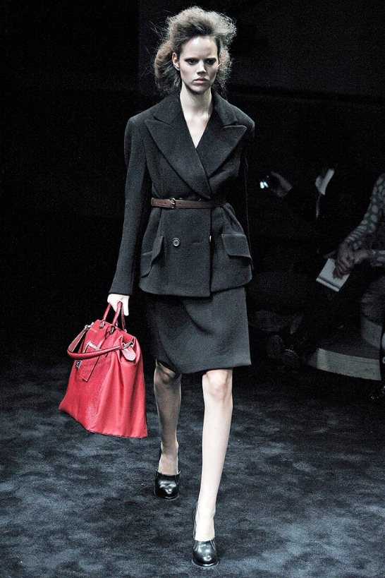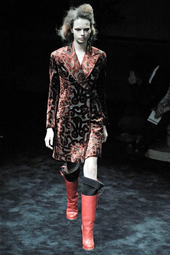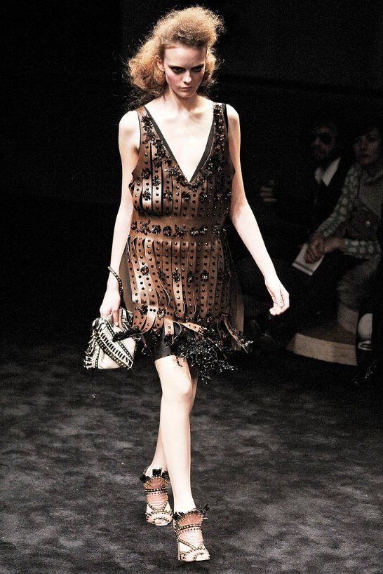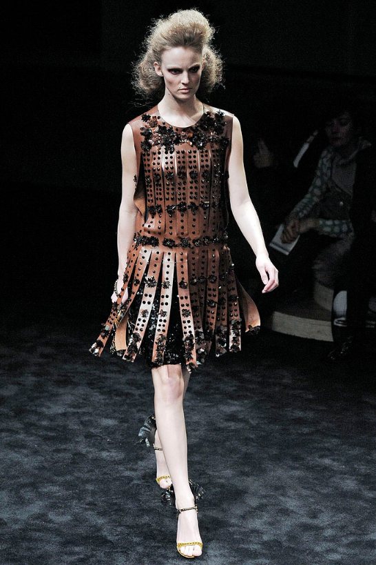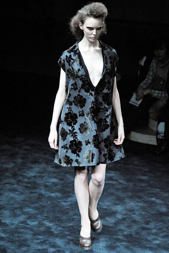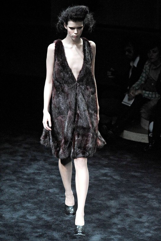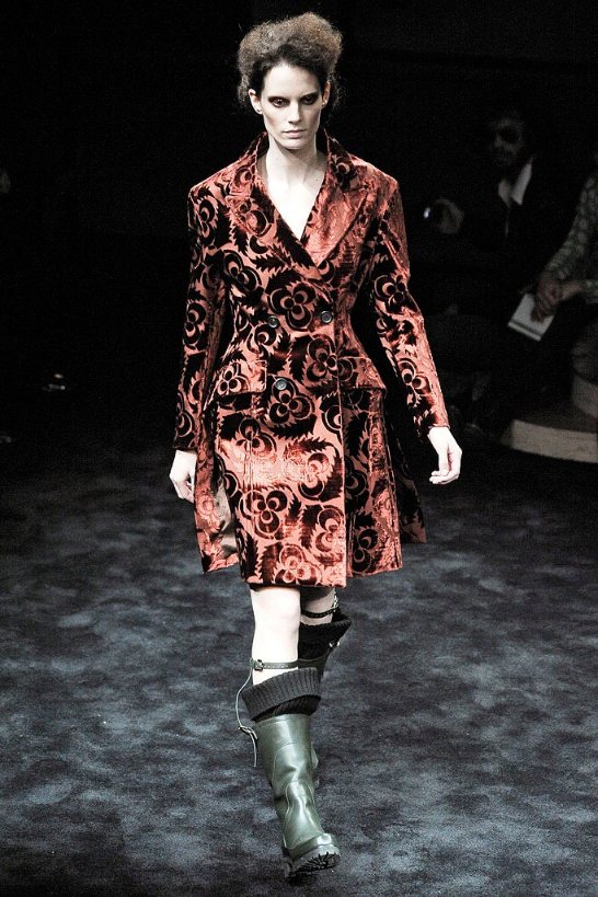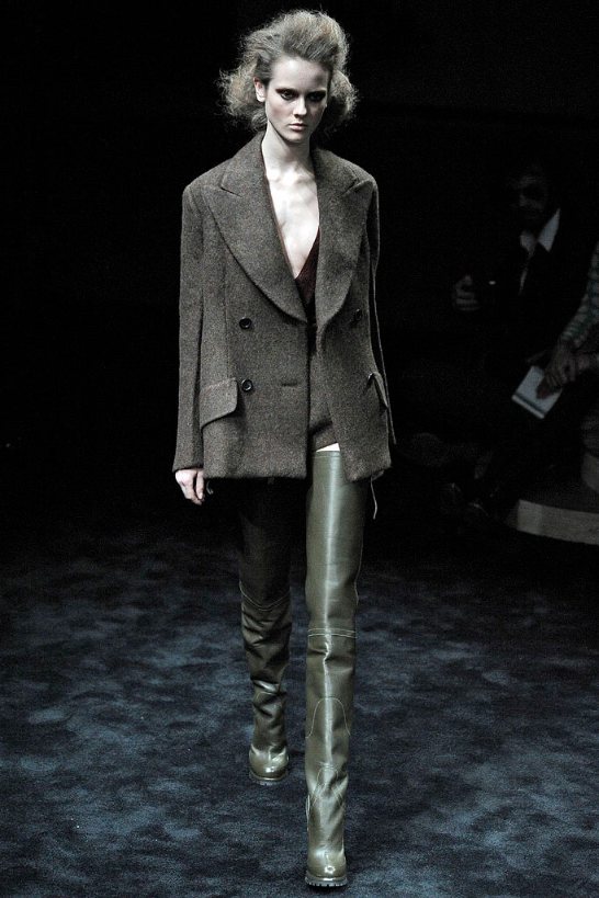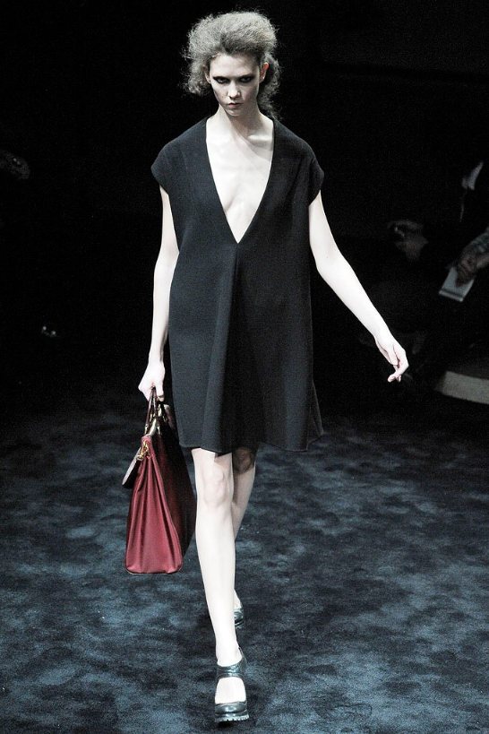 Dressed in Military ready clothes with ultra frizzed hair was Miuccia Prada’s woman in this collection. The clothes were heavy on textures featuring thick wools, devoré velvet, furs, knits and lux leathers; all done in immaculate sharp tailoring. The colors were mostly brown and block with occasional red and rust appearances leaning hard into a moody gloomy winter. There were standouts not limited to flapper dresses, big boots, extra deep necklines, 50s high-waisted shorts, big jacket lapels and fur dresses. And Prada will always give us some delicious coats, this collection was no exception. The show closed with some statement embellished leather fringed dresses. The collection is balanced between 80s power suits and wilderness; clothes with just the right amount of edge. A restrained and powerful collection.