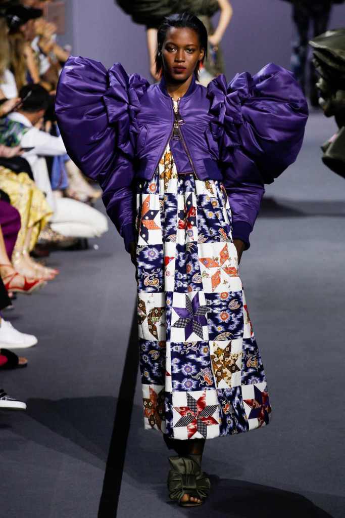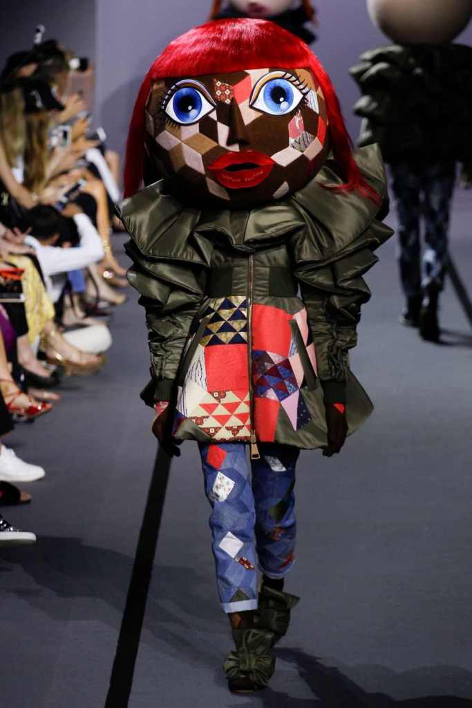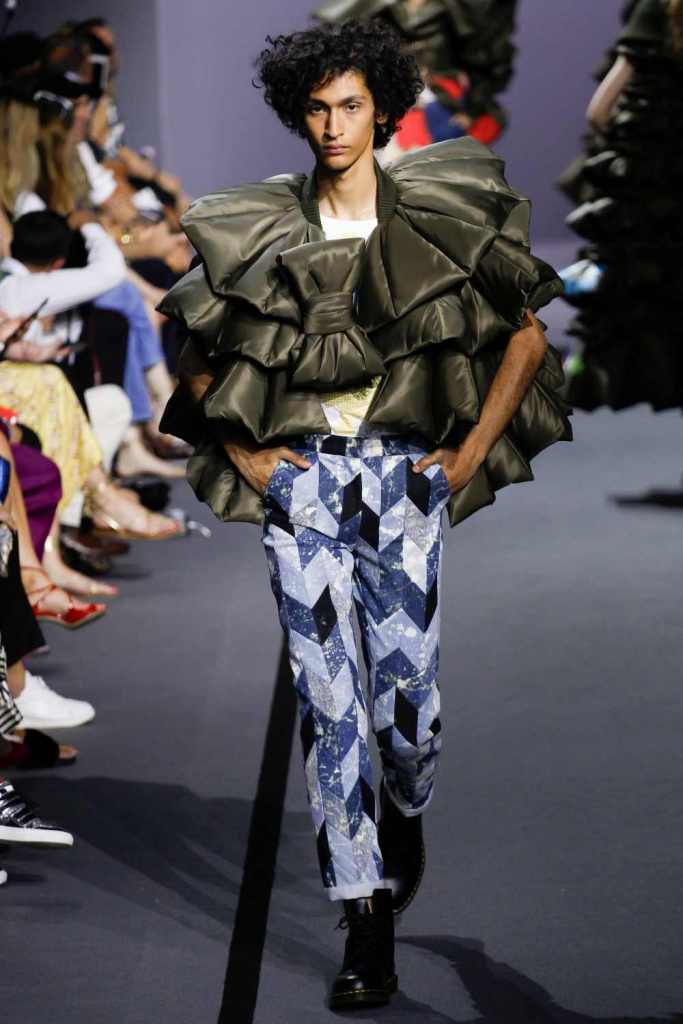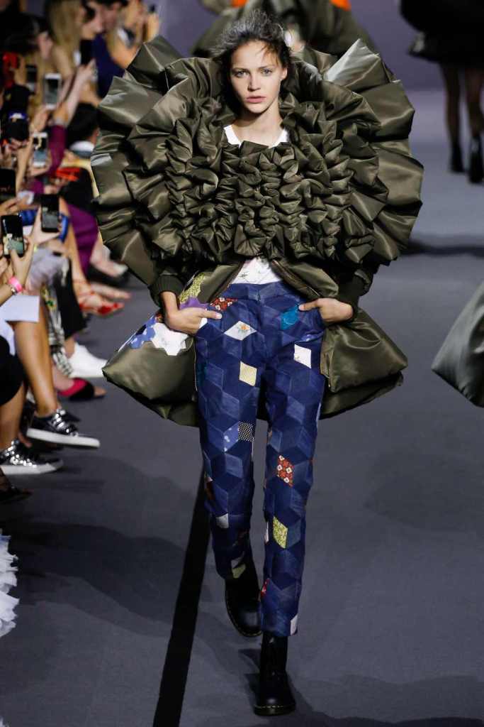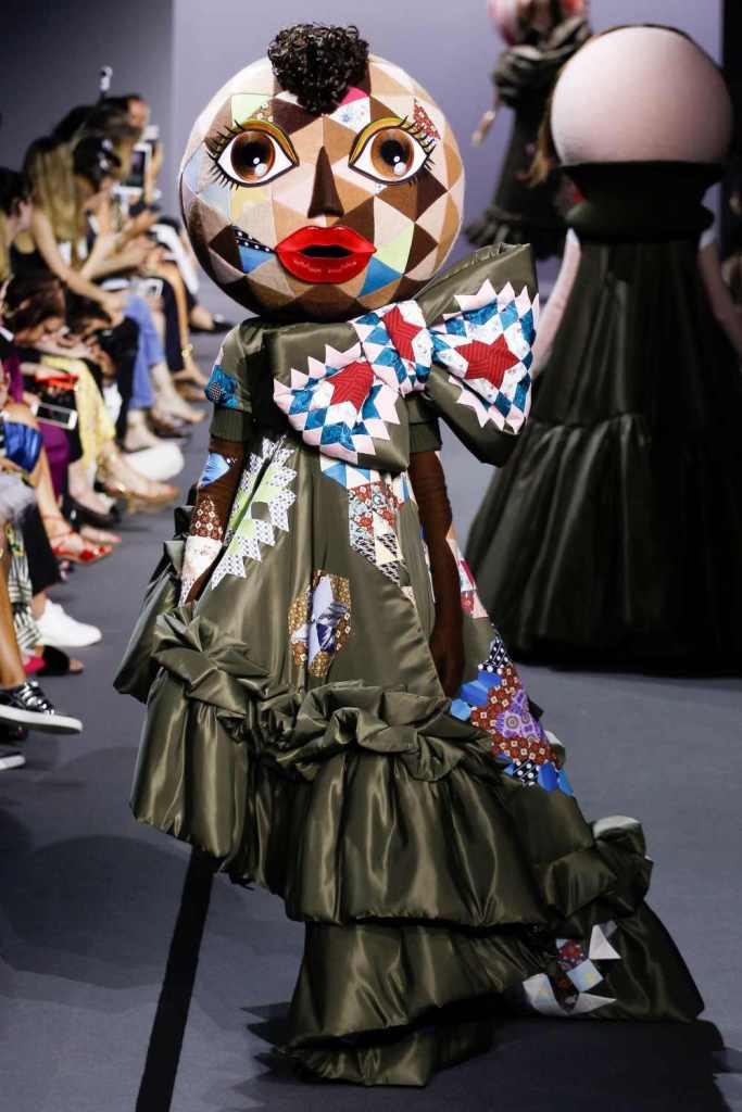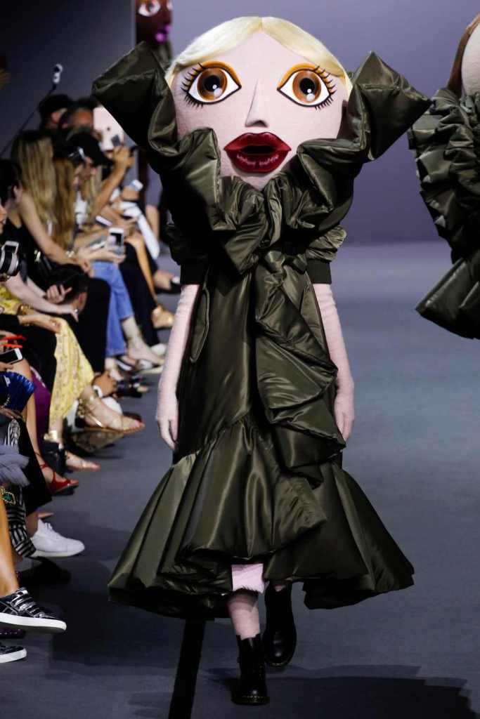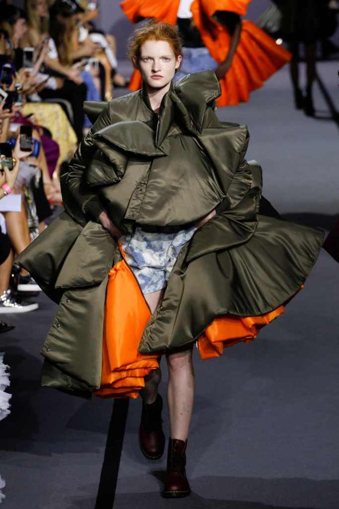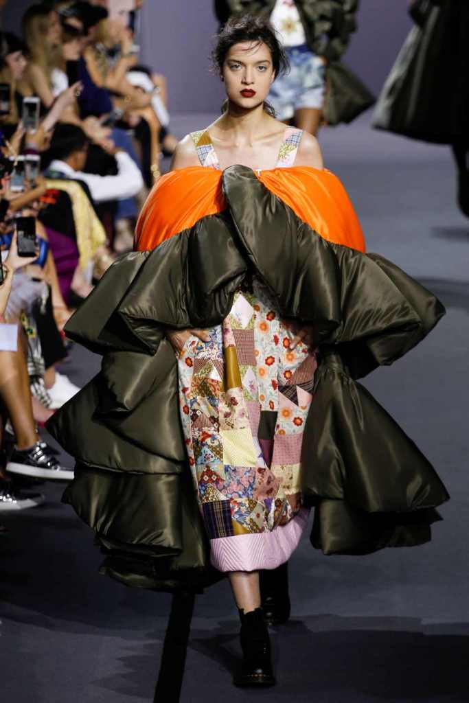 Viktor & Rolf, known for their extreme, whimsy, avant-grade designs put their clothes on life-size dolls for the first half of the collection. Their power is that they don’t take themselves too seriously. Almost creepy, very cute this collection can incite nightmares in people but only dreams in V&R stans. Original contemporary silhouettes with a sporty edge lead this collection. Geometric patchwork denim adds on to the distressed apocalyptic energy. Mostly made in khaki and olive and pops of orange the collection featured. Jackets ranged from bombers to capes; all with delicate additions of ruffles, bows and puffed sleeves. This collection could be a masterclass in Parka Couture. Oversized collars, asymmetric high-low gowns, rose motifs, colorful patchwork and poofy skater skirts were some favorites. Floor-sweeping ruffled -padded gowns took over the collection towards the end. Viktor & Rolf rarely disappoint.