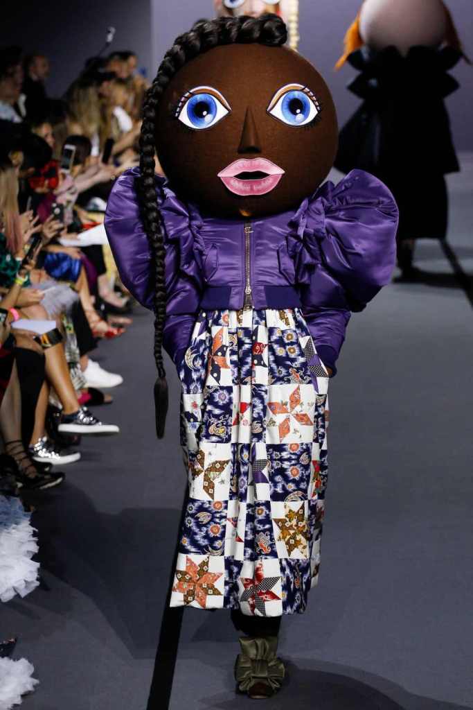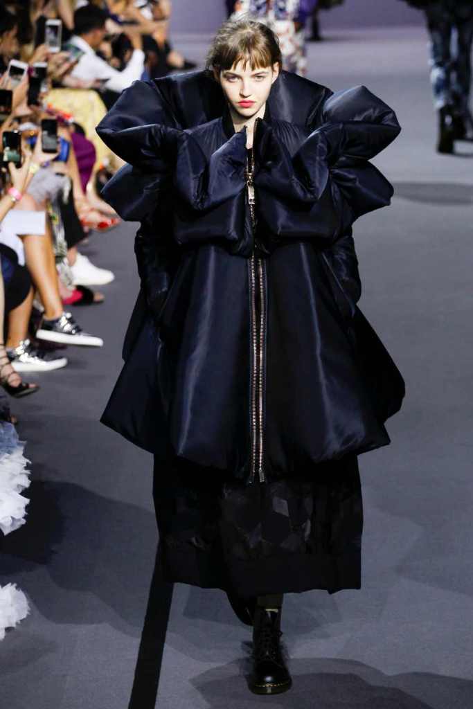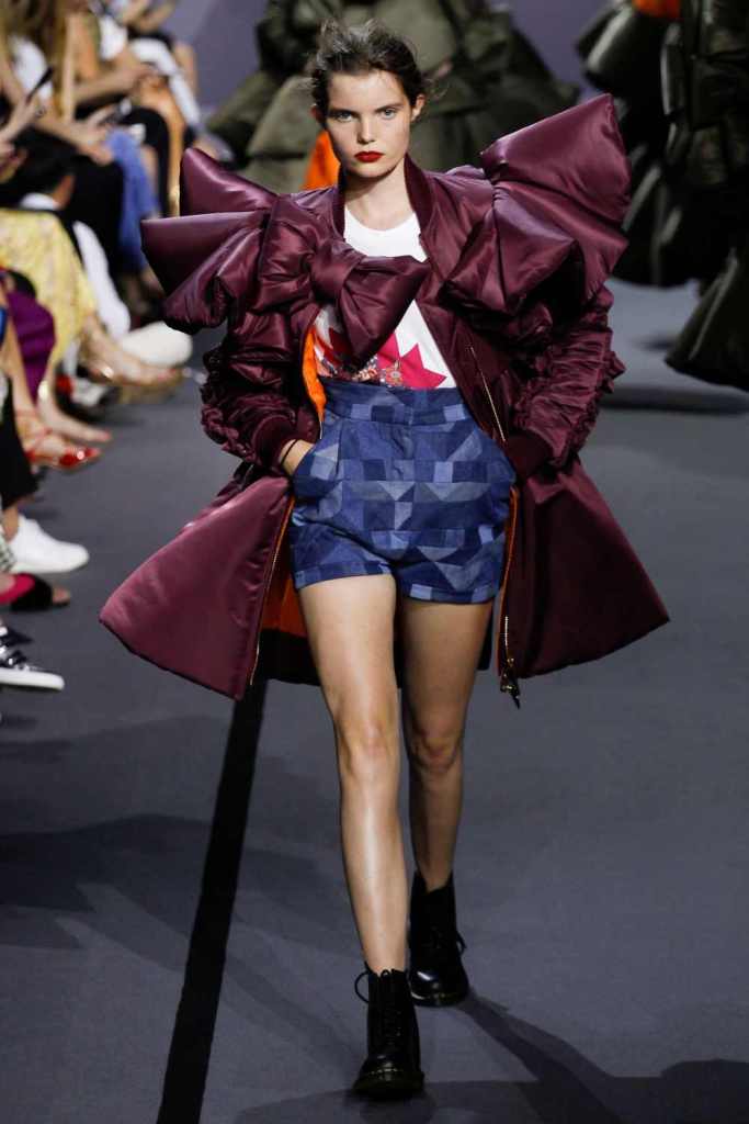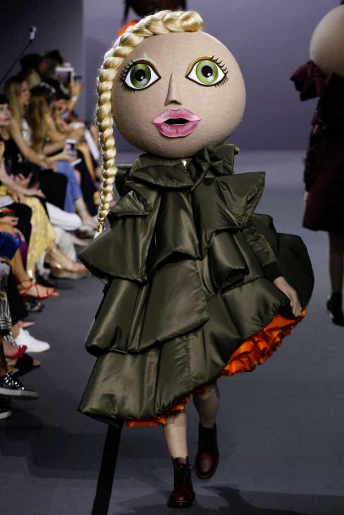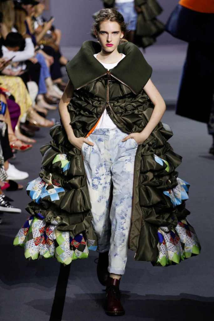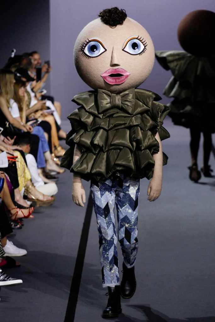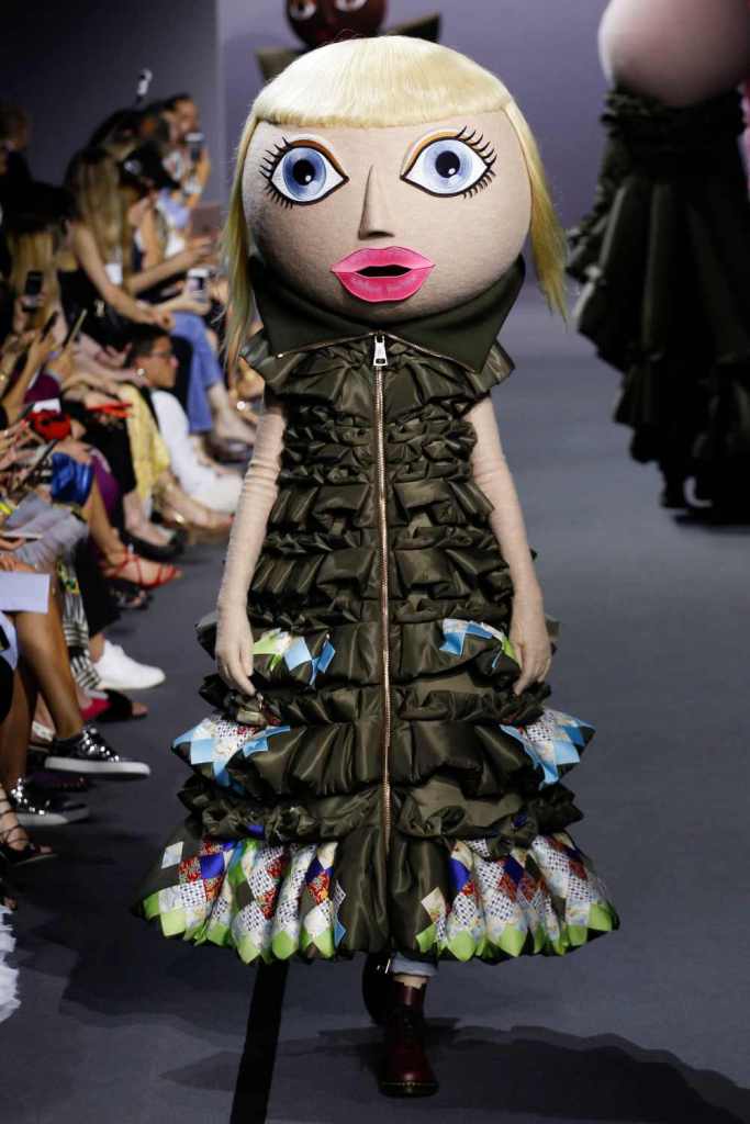 Viktor & Rolf, known for their extreme, whimsy, avant-grade designs put their clothes on life-size dolls for the first half of the collection. Their power is that they don’t take themselves too seriously. Almost creepy, very cute this collection can incite nightmares in people but only dreams in V&R stans. Original contemporary silhouettes with a sporty edge lead this collection. Geometric patchwork denim adds on to the distressed apocalyptic energy. Mostly made in khaki and olive and pops of orange the collection featured. Jackets ranged from bombers to capes; all with delicate additions of ruffles, bows and puffed sleeves. This collection could be a masterclass in Parka Couture. Oversized collars, asymmetric high-low gowns, rose motifs, colorful patchwork and poofy skater skirts were some favorites. Floor-sweeping ruffled -padded gowns took over the collection towards the end. Viktor & Rolf rarely disappoint.