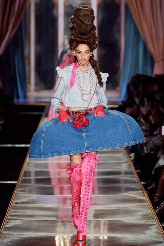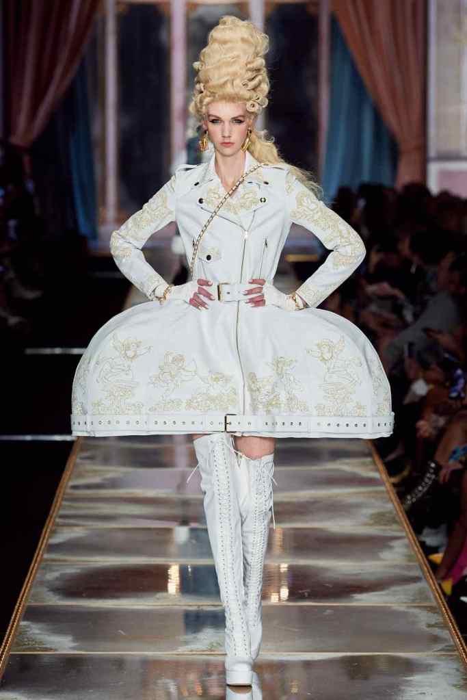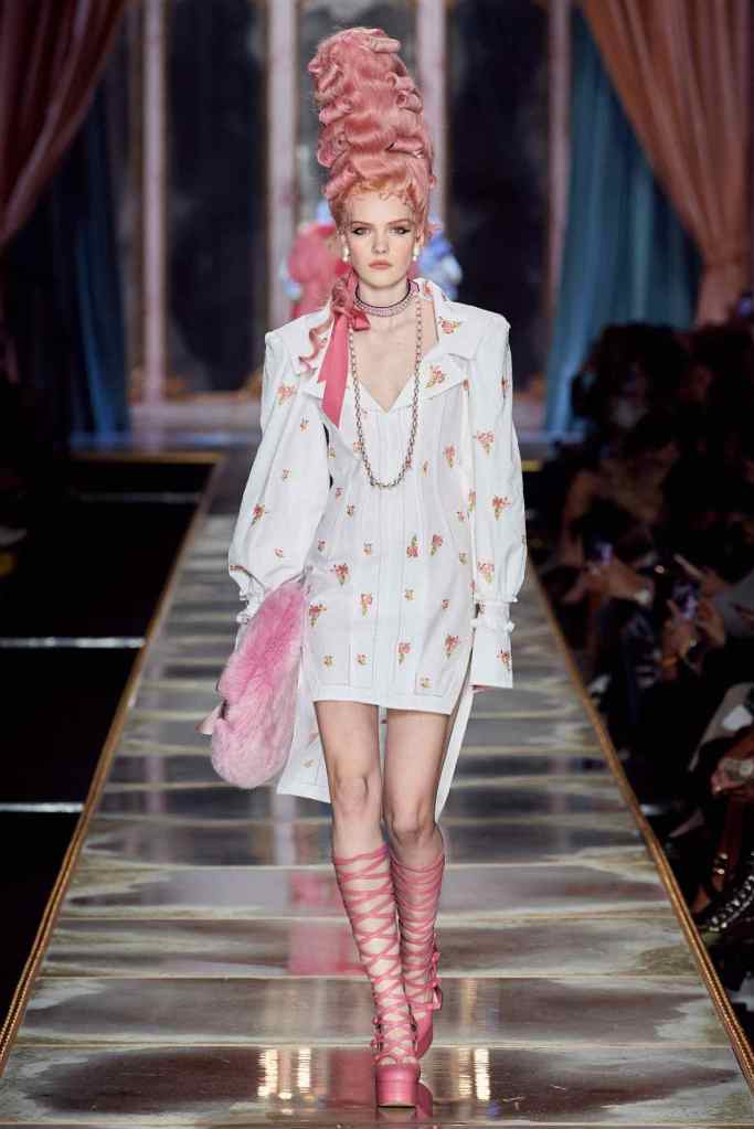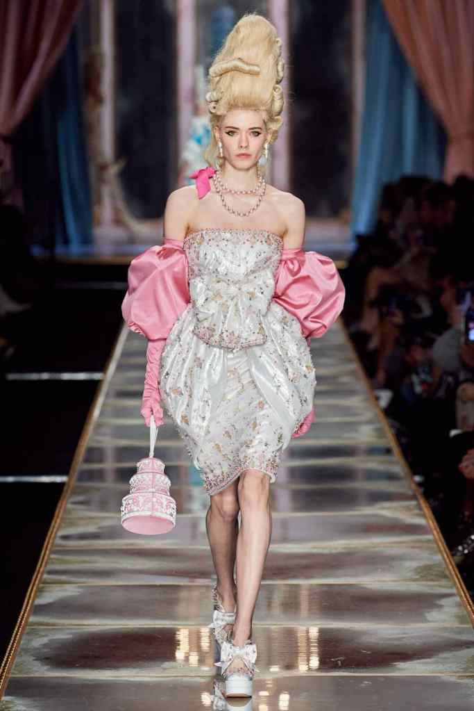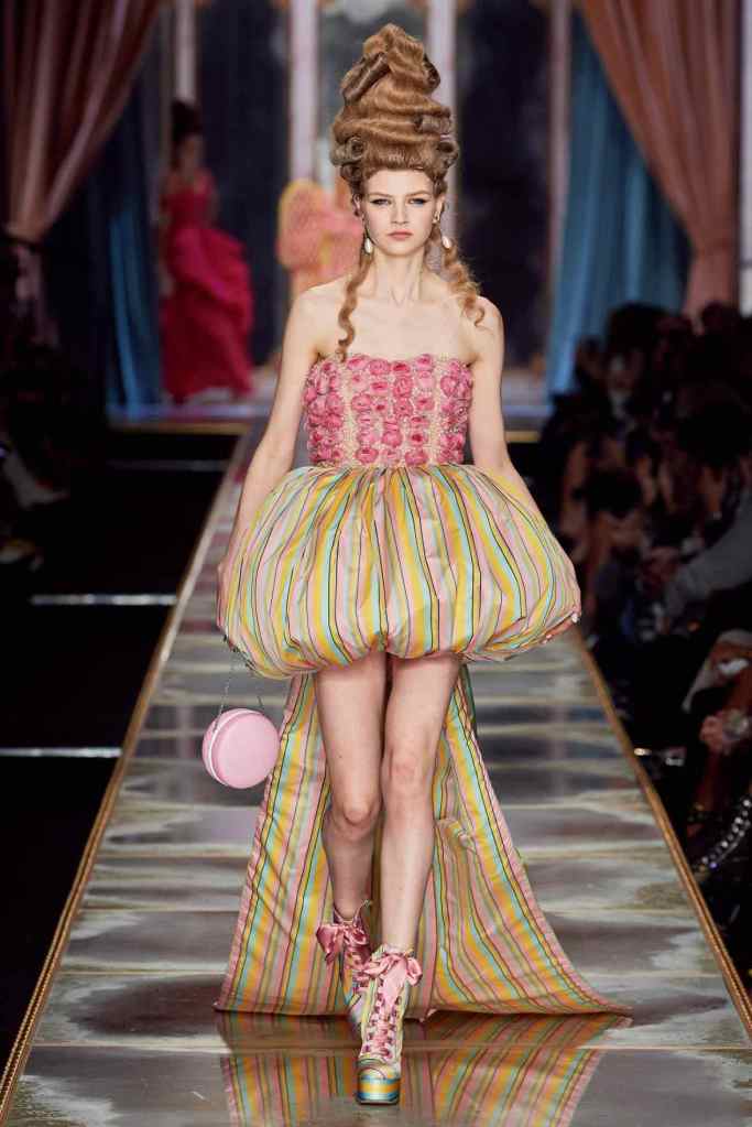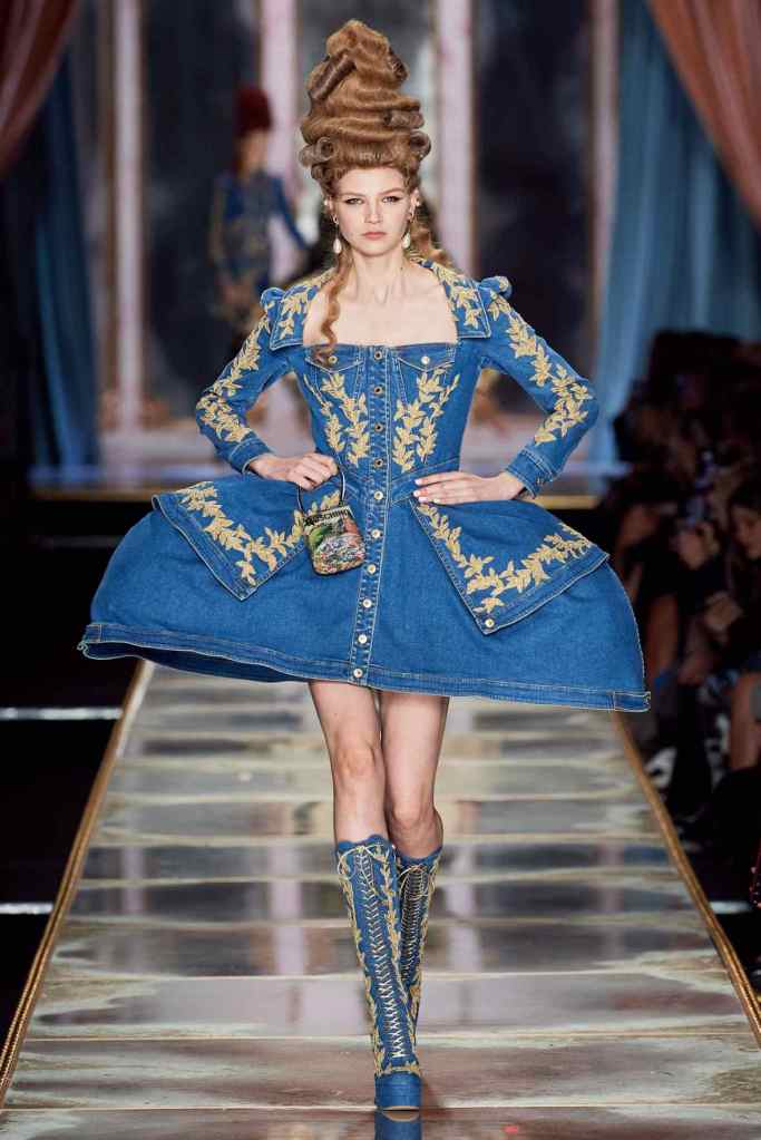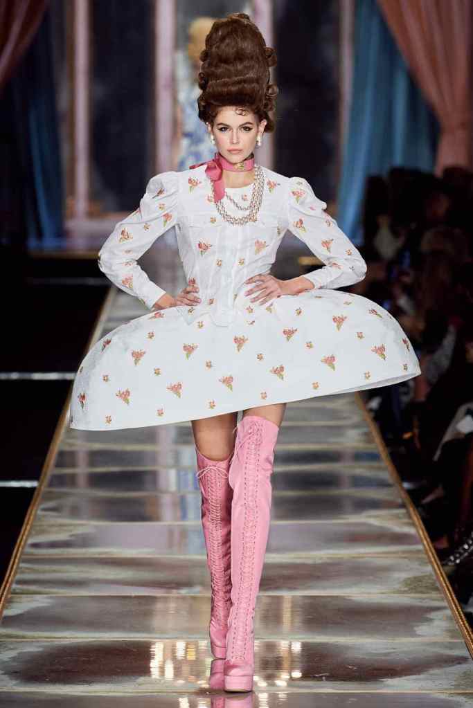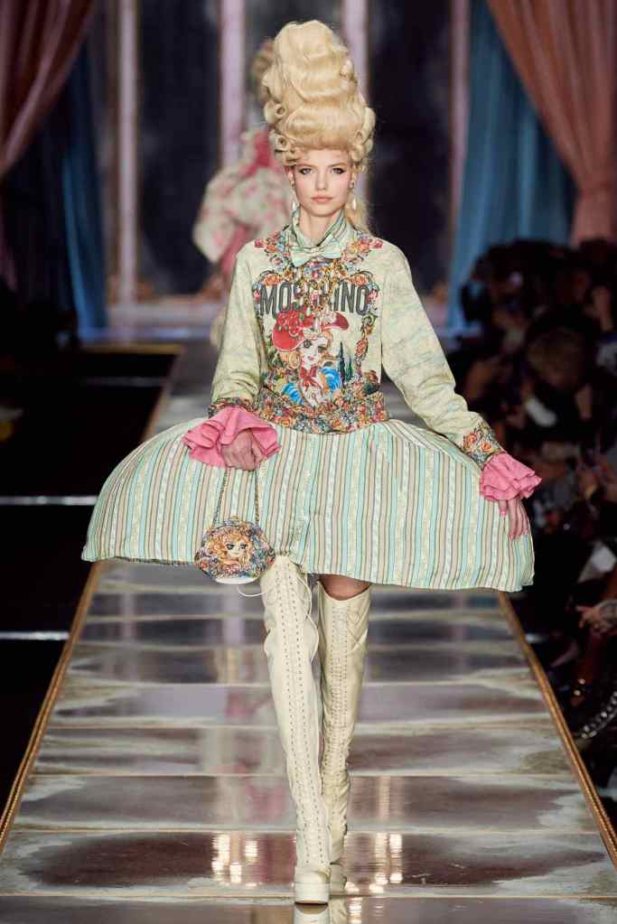 The famous Marie Antoinette pannier silhouettes were given a major modern twist; they were mini panniers. Antoinette minidresses had many iterations including some classic Rococo, embroidered denim, biker chic, blue oriental prints and anime prints (or Scott liked to call it ‘Anime Antoinette’). There was more of this Tokyo twist too; primarily seen in the kaleidoscopic color palette and the general kitschy surrealism. Most looks were paired with lace-up thigh-high boots, amping up the sexy in the 1700s fits. The hairdos reached the sky with colors ranging from neutrals to candy-like pastels. The collection closed with some cake dresses; a clear ironic reference to the infamous “Let them eat cake”. After all who wouldn’t want to wear colorful Moschino Marie Antoinette-inspired cake dresses?