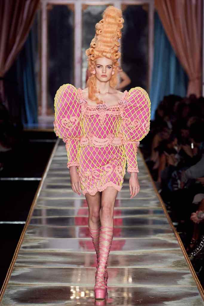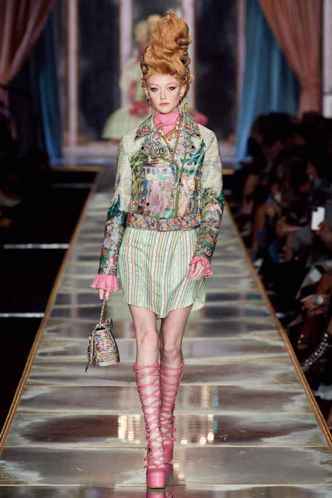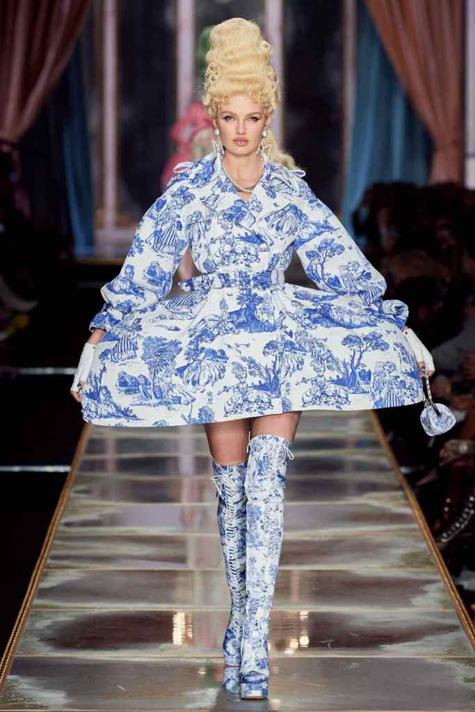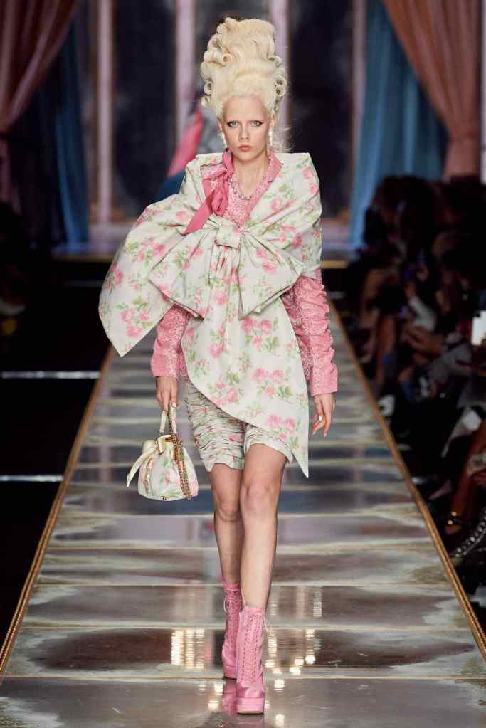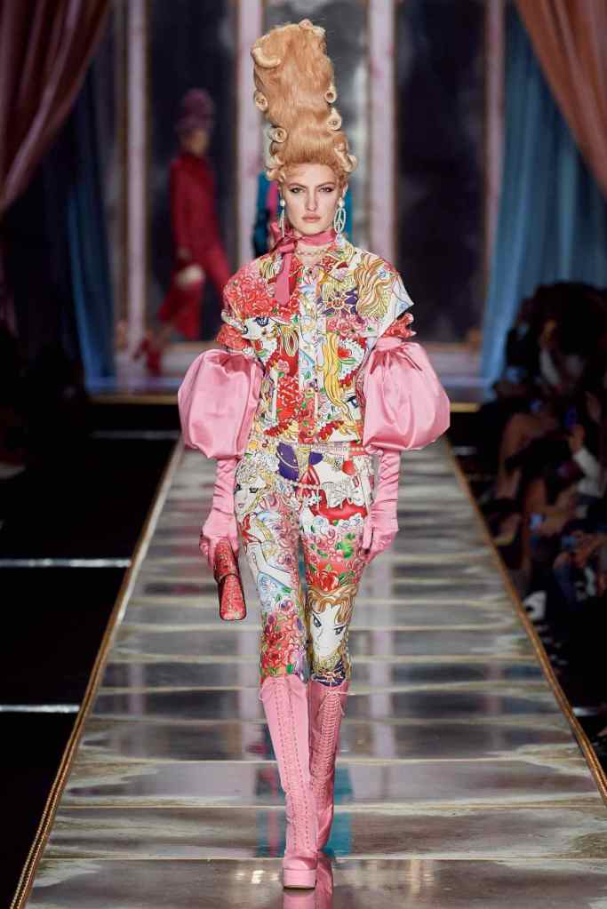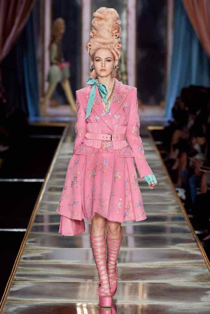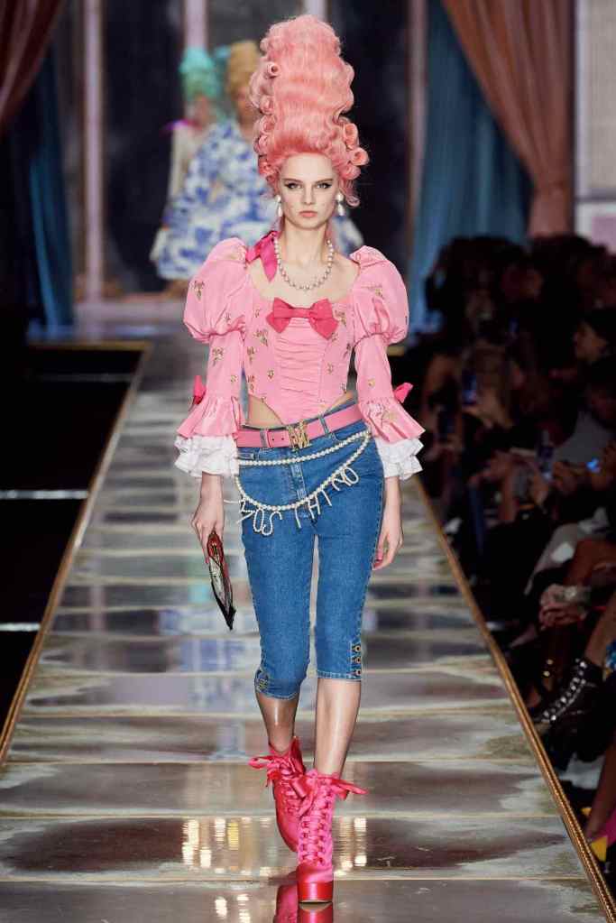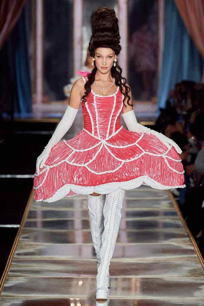 The famous Marie Antoinette pannier silhouettes were given a major modern twist; they were mini panniers. Antoinette minidresses had many iterations including some classic Rococo, embroidered denim, biker chic, blue oriental prints and anime prints (or Scott liked to call it ‘Anime Antoinette’). There was more of this Tokyo twist too; primarily seen in the kaleidoscopic color palette and the general kitschy surrealism. Most looks were paired with lace-up thigh-high boots, amping up the sexy in the 1700s fits. The hairdos reached the sky with colors ranging from neutrals to candy-like pastels. The collection closed with some cake dresses; a clear ironic reference to the infamous “Let them eat cake”. After all who wouldn’t want to wear colorful Moschino Marie Antoinette-inspired cake dresses?