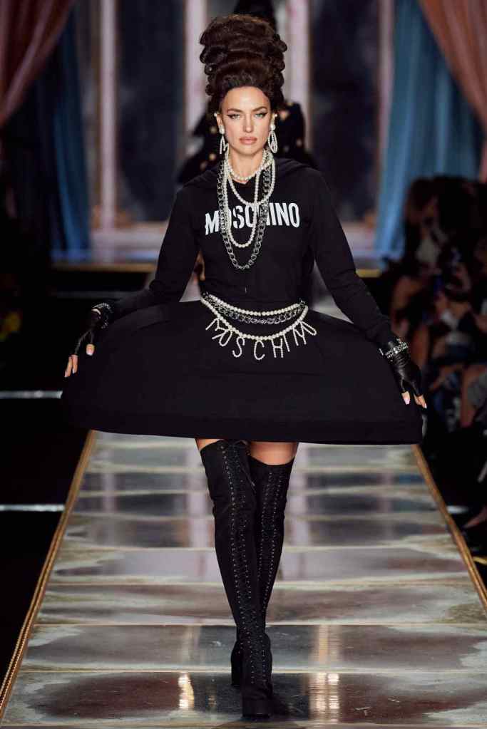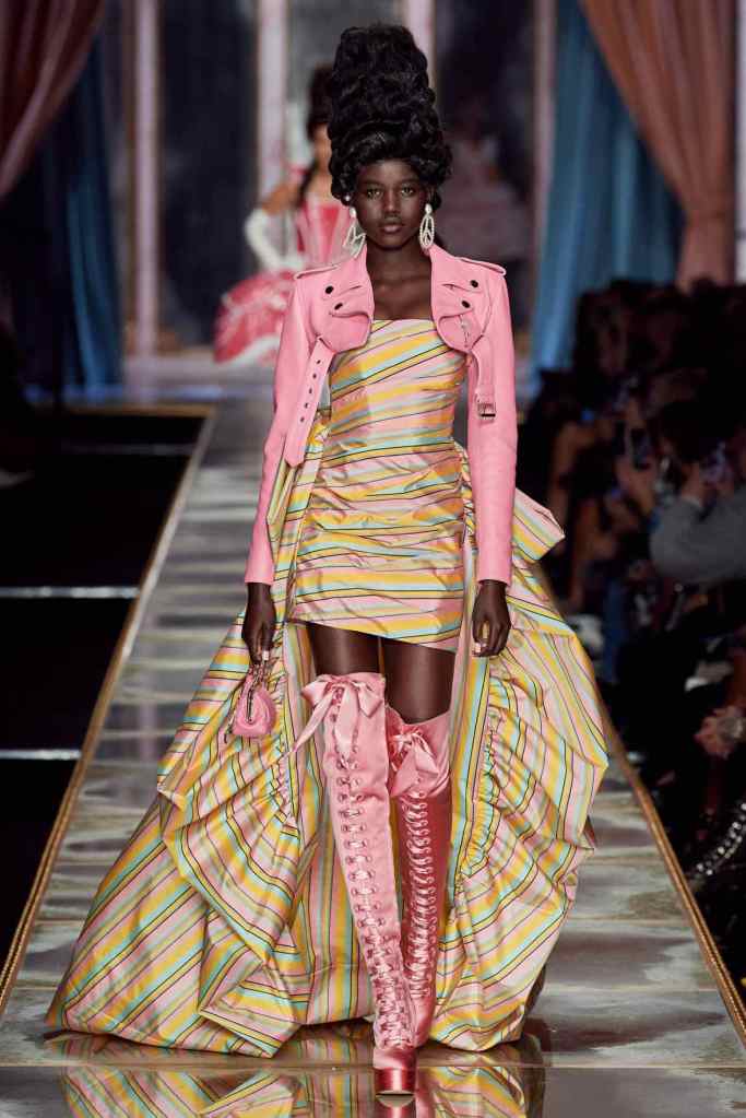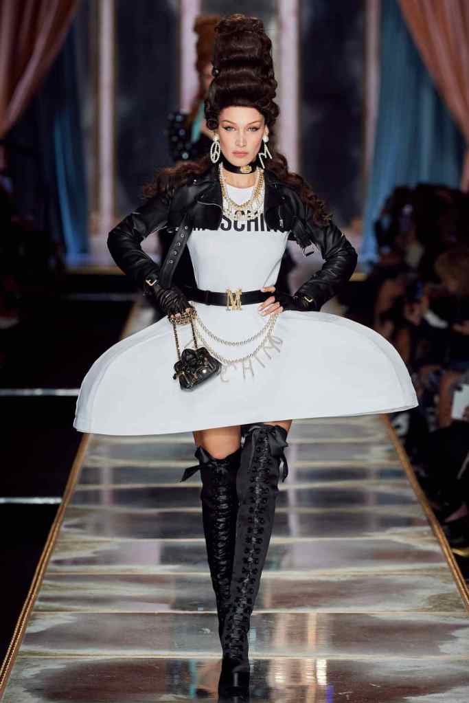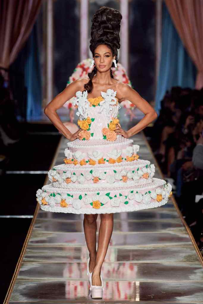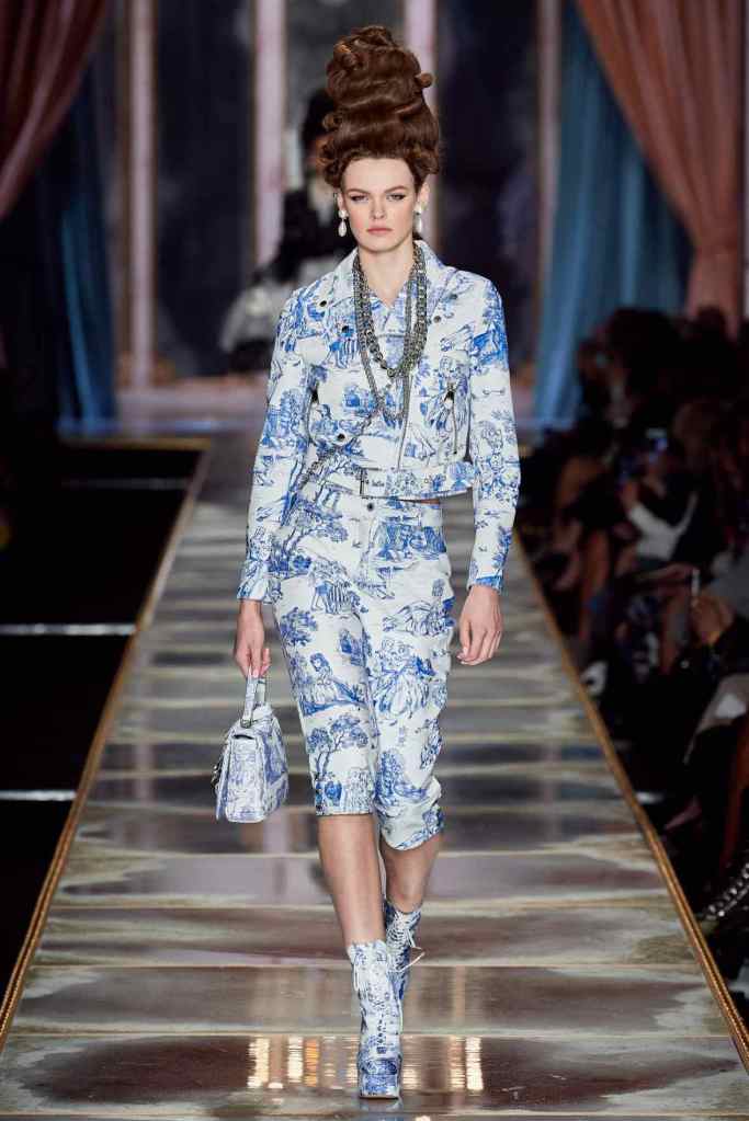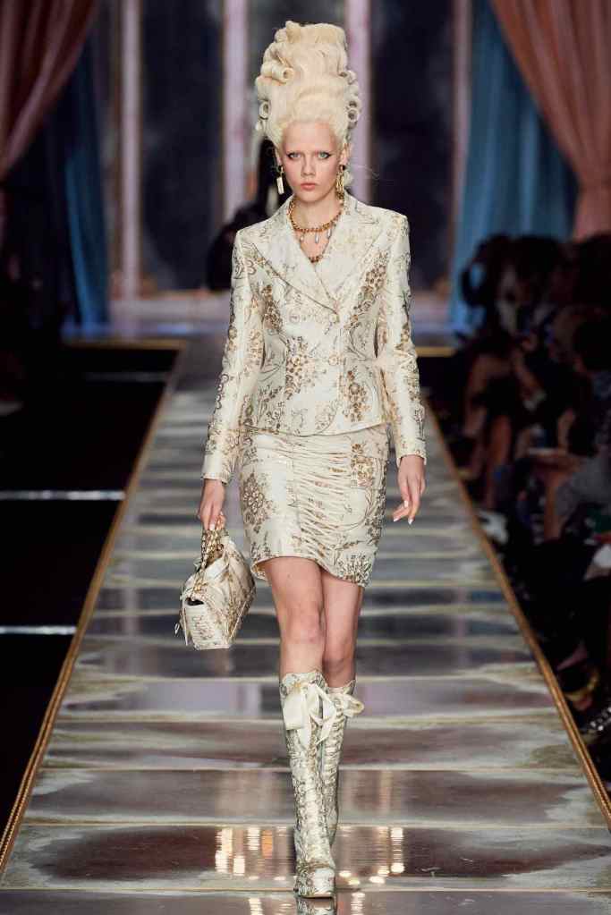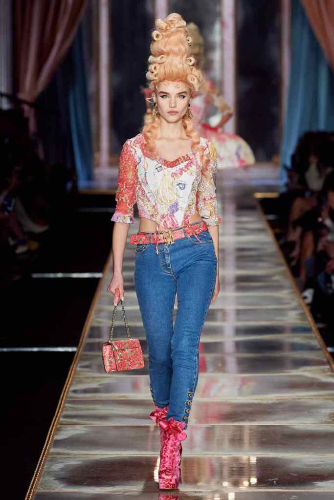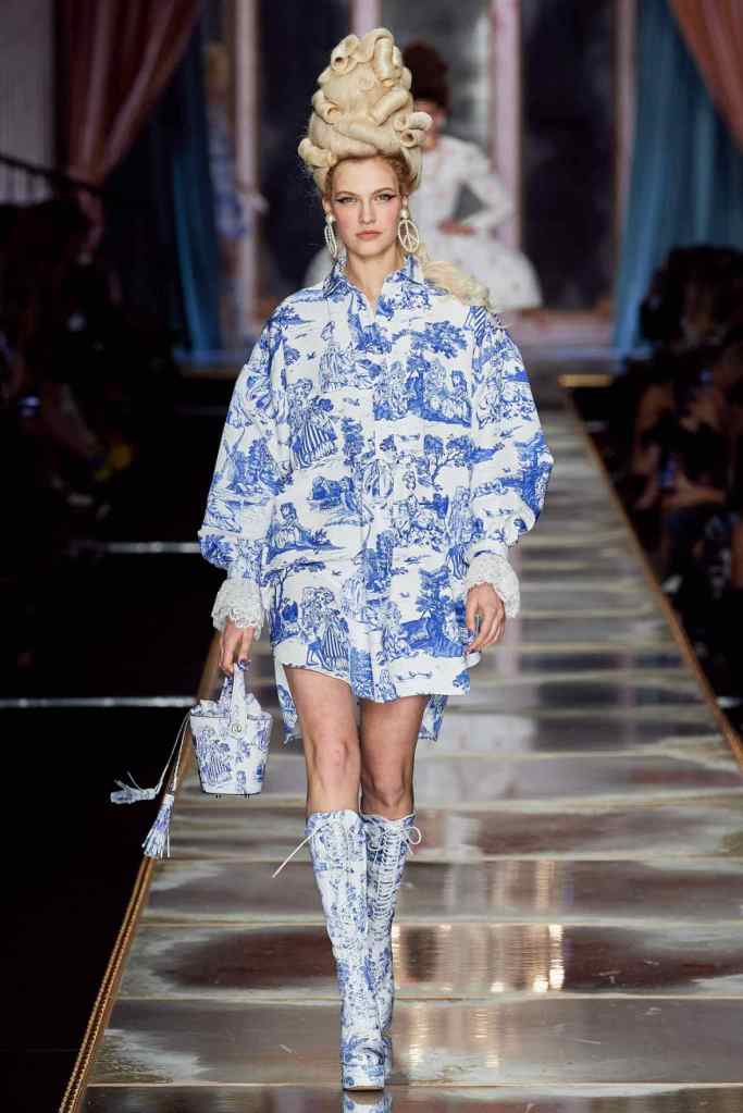 The famous Marie Antoinette pannier silhouettes were given a major modern twist; they were mini panniers. Antoinette minidresses had many iterations including some classic Rococo, embroidered denim, biker chic, blue oriental prints and anime prints (or Scott liked to call it ‘Anime Antoinette’). There was more of this Tokyo twist too; primarily seen in the kaleidoscopic color palette and the general kitschy surrealism. Most looks were paired with lace-up thigh-high boots, amping up the sexy in the 1700s fits. The hairdos reached the sky with colors ranging from neutrals to candy-like pastels. The collection closed with some cake dresses; a clear ironic reference to the infamous “Let them eat cake”. After all who wouldn’t want to wear colorful Moschino Marie Antoinette-inspired cake dresses?