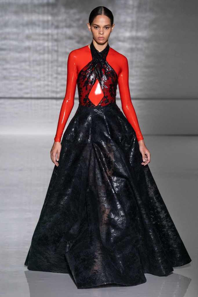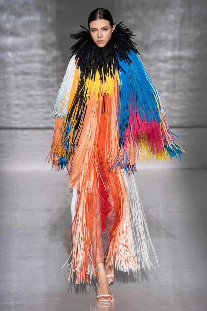 Vibrant pops of color accentuated the clothes along with the exemplary craftsmanship and techniques. There were second-skin latex leggings, multicolor mega fringe, big bow-shaped backpacks, feather adornments and glitter-painted faces. The juxtaposition of delicate lace and seductive latex reflects on the contrast between old and new; A white structure lace coat worn with black latex leggings. A master collection in calm glam.