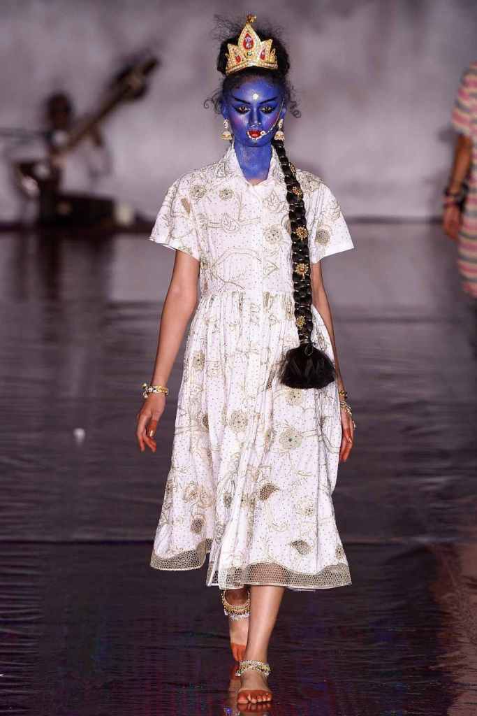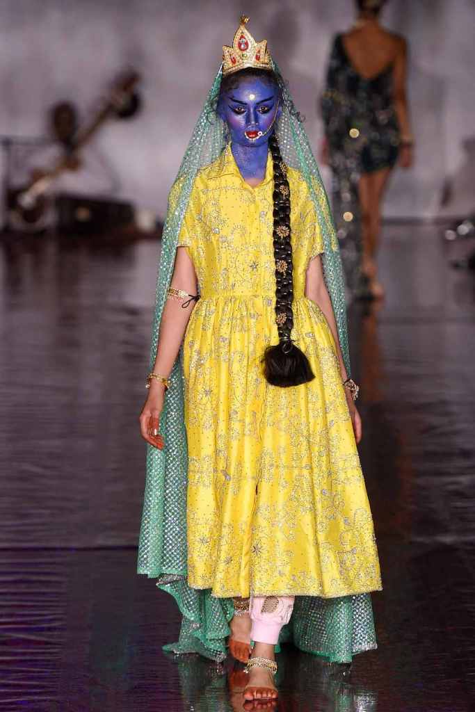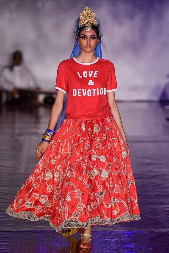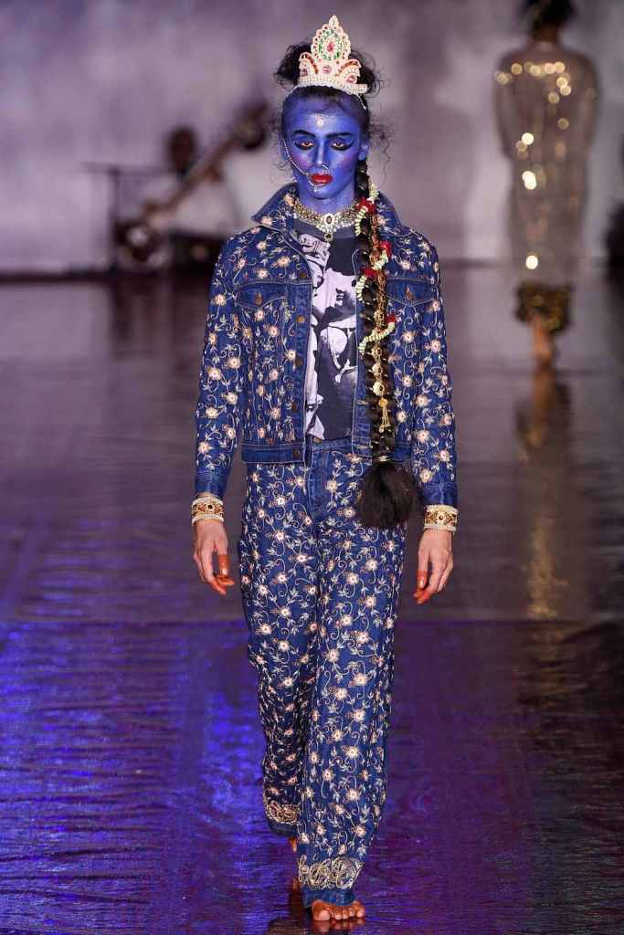 This collection lives rent-free in my mind! Traditional Indian silhouettes were revamped using western pieces – the collection opened with a red embroidered lehenga worn with a red T-shirt with words printed ‘Love & Devotion’. There were multiple references to the expansive Indian culture. The most heart-touching one was – Hands and feet were stained with alta (a red dye worn by women for festivities and weddings). Intricate embroidery and embellishments on bright fabrics look like they are right out of a wedding baraat. Models wore golden mukuts (tiaras) and some had their faces painted blue like Goddes Kali. Gajra-laden braids, heavy payals, glass bangles, traditional Indian jewelry including nose rings and maang teekas – these elements add depth and soul to the collection. A beautiful melody of Indian traditions and contemporary; each look drenched in desi glam.