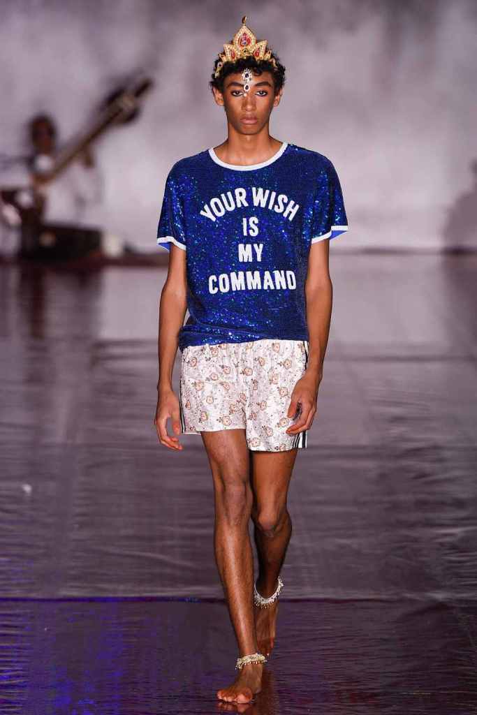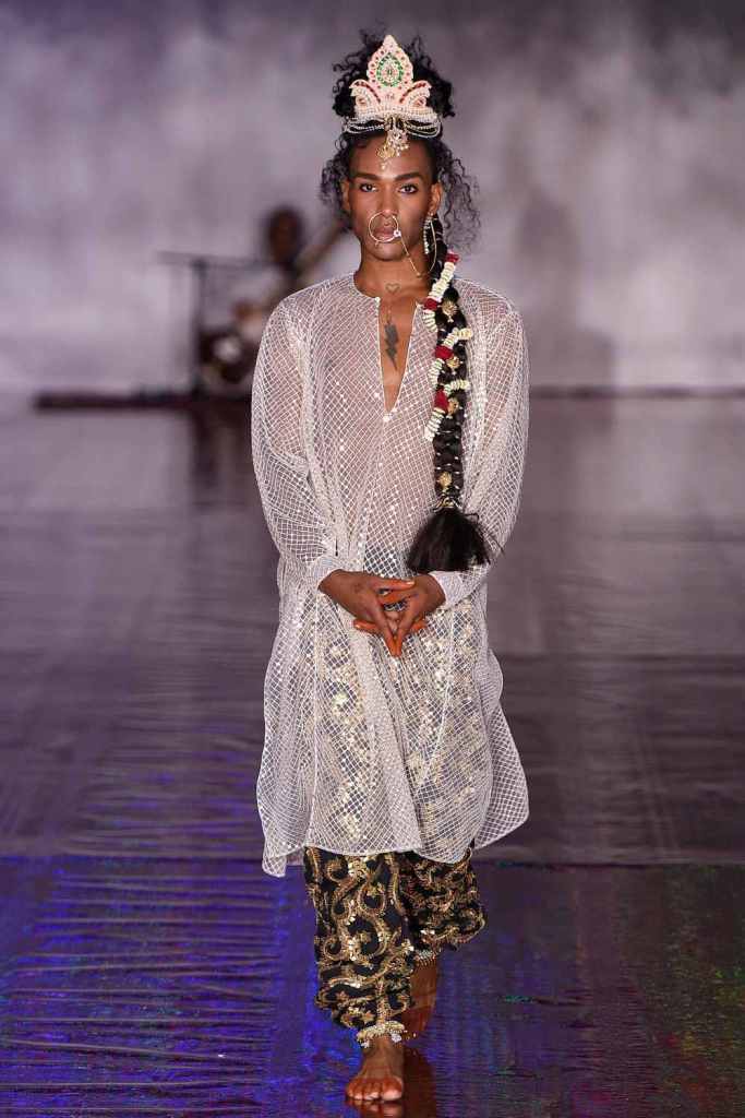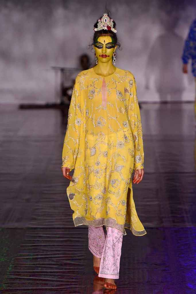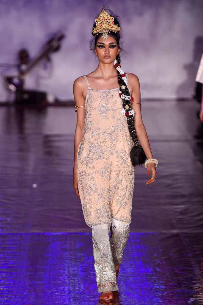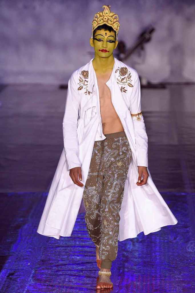 This collection lives rent-free in my mind! Traditional Indian silhouettes were revamped using western pieces – the collection opened with a red embroidered lehenga worn with a red T-shirt with words printed ‘Love & Devotion’. There were multiple references to the expansive Indian culture. The most heart-touching one was – Hands and feet were stained with alta (a red dye worn by women for festivities and weddings). Intricate embroidery and embellishments on bright fabrics look like they are right out of a wedding baraat. Models wore golden mukuts (tiaras) and some had their faces painted blue like Goddes Kali. Gajra-laden braids, heavy payals, glass bangles, traditional Indian jewelry including nose rings and maang teekas – these elements add depth and soul to the collection. A beautiful melody of Indian traditions and contemporary; each look drenched in desi glam.