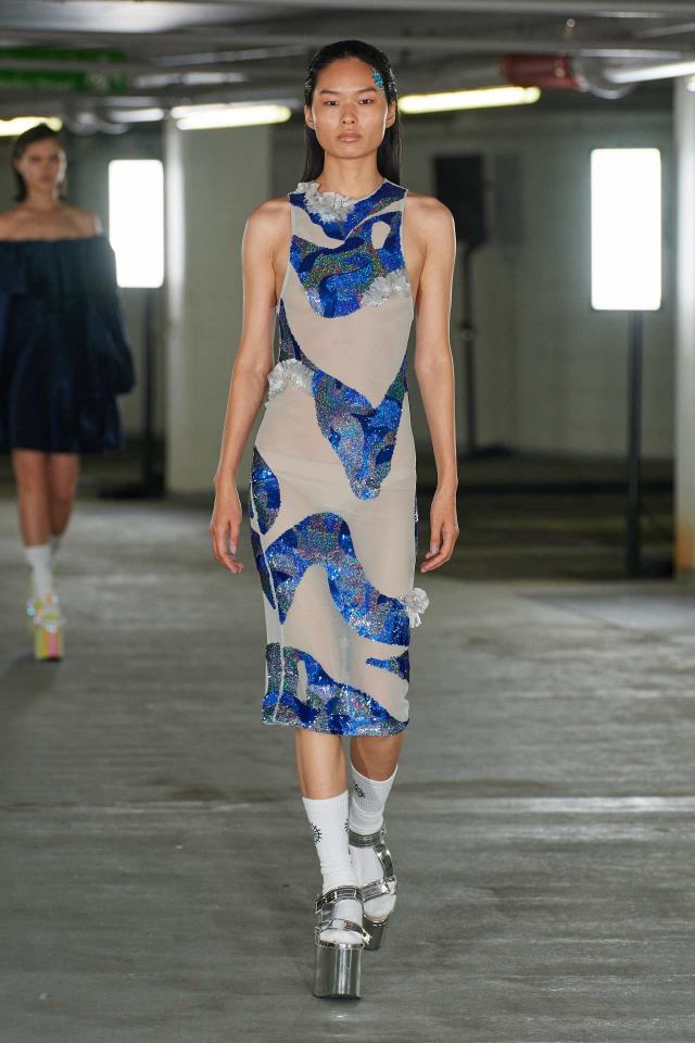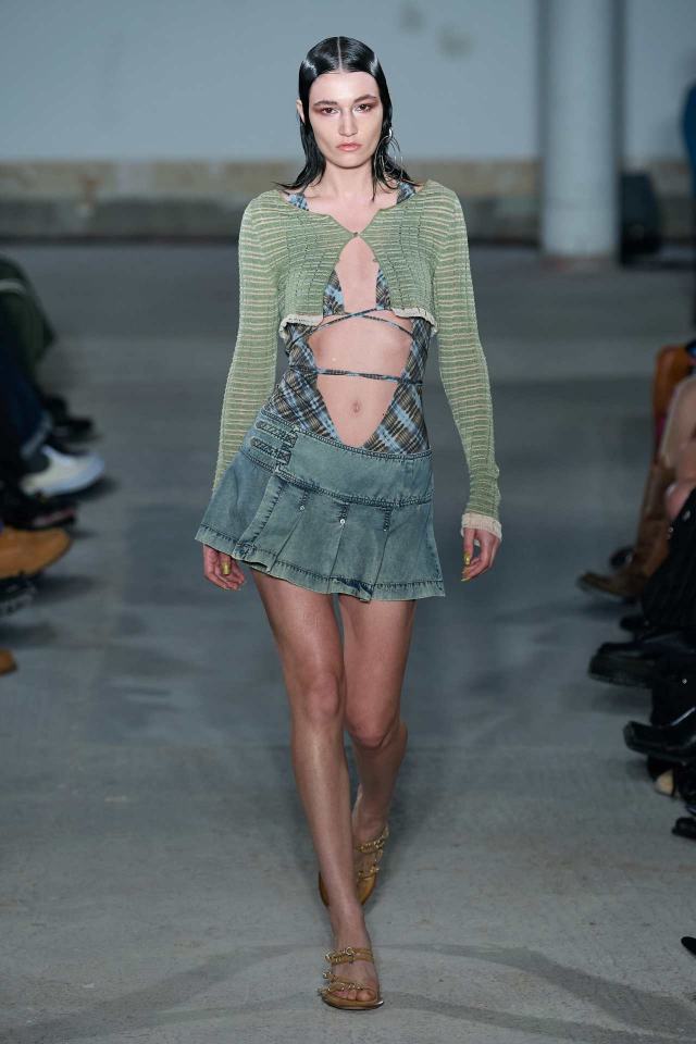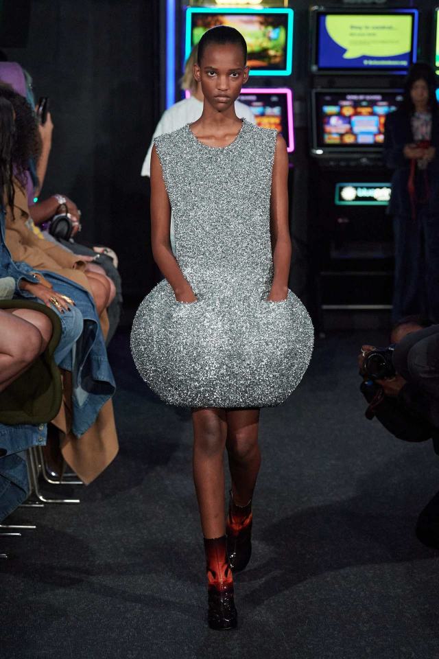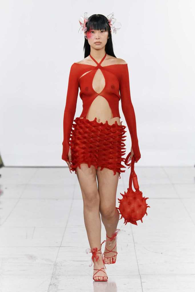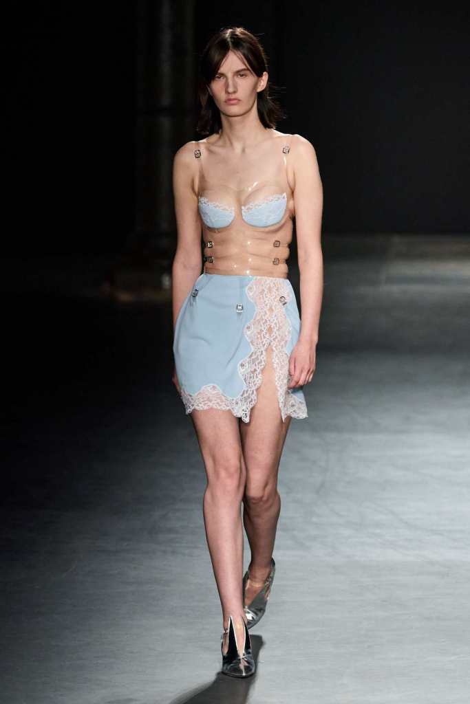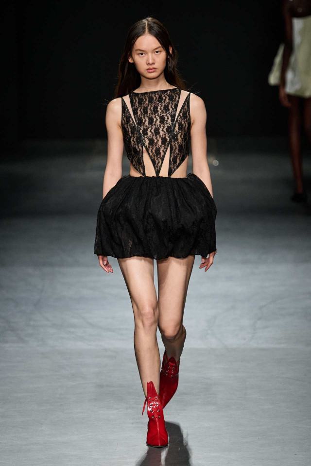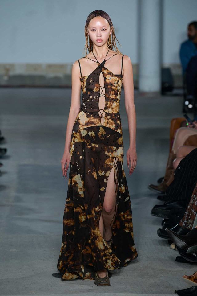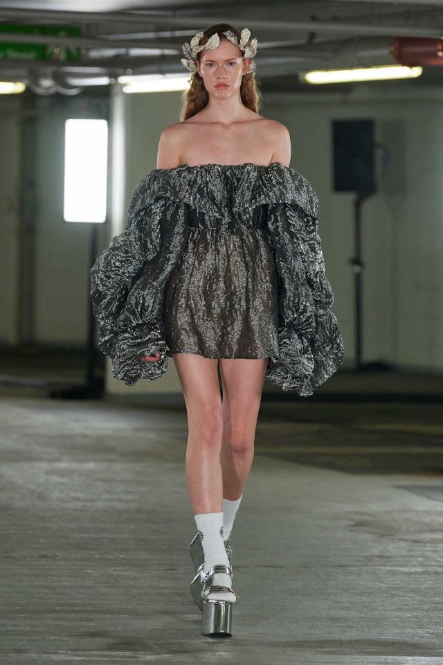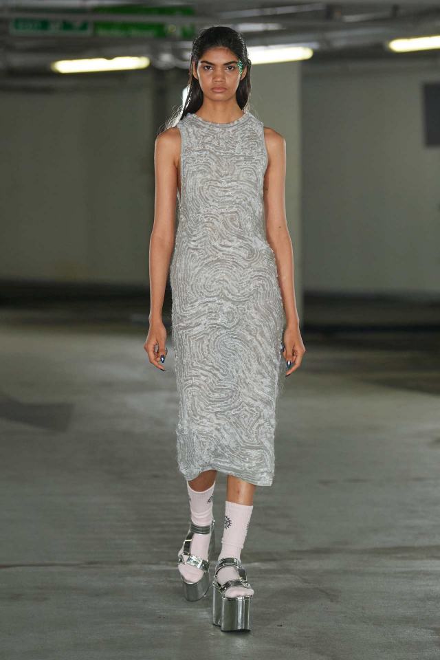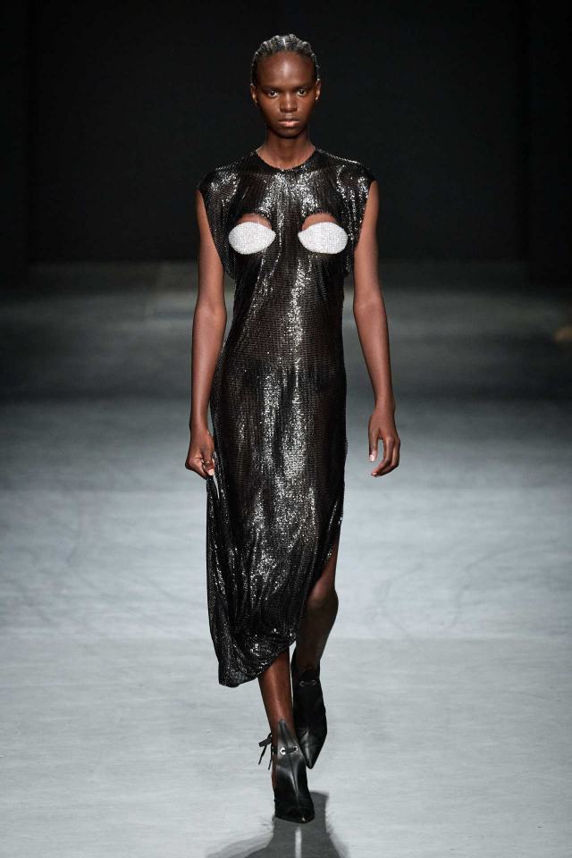 Knwls: Crafted with the now brand signatures this collection featured all that we love and expect from KNWLS. The designer is riding hard on the Y2K nostalgia the only question is how long will this last, as is with any trend-focused brand. Even though it was titled ‘glimmer’ the collection reflected a very tough apocalyptic aesthetic. There were plated micro-minis, statement jackets, slinky dresses and ultra sexy cutout tops. Nevertheless, this collection did have some very desirable pieces. The brand is losing its USP because everyone from fast fashion retailers to heritage brands are opting for the early 2000s aesthetic; maybe it’s time for KNWLS to diversify and rule.