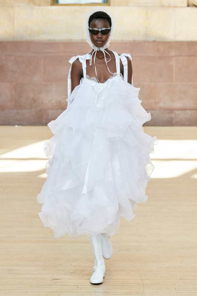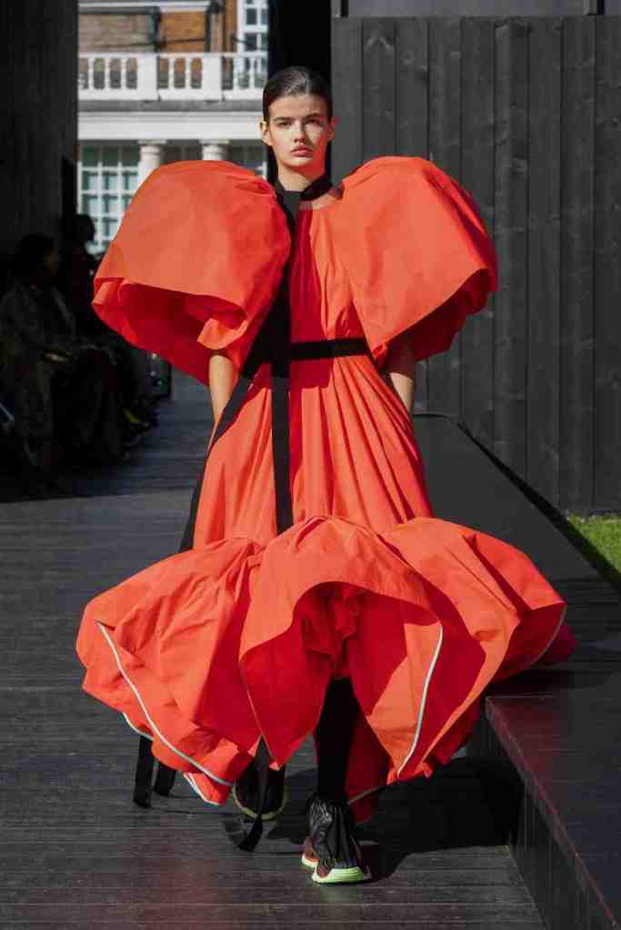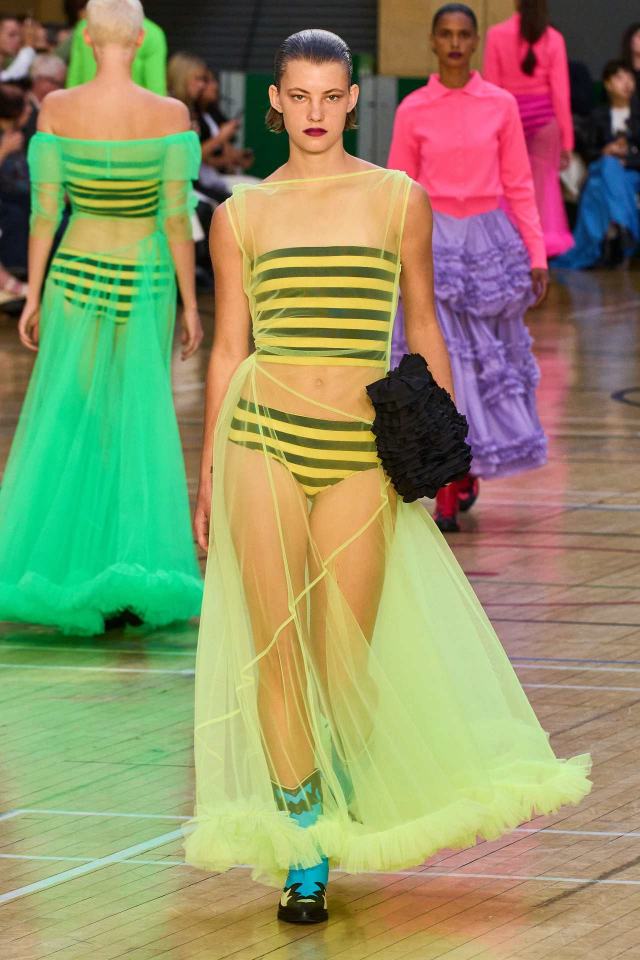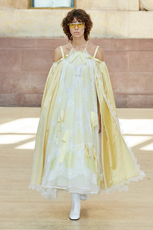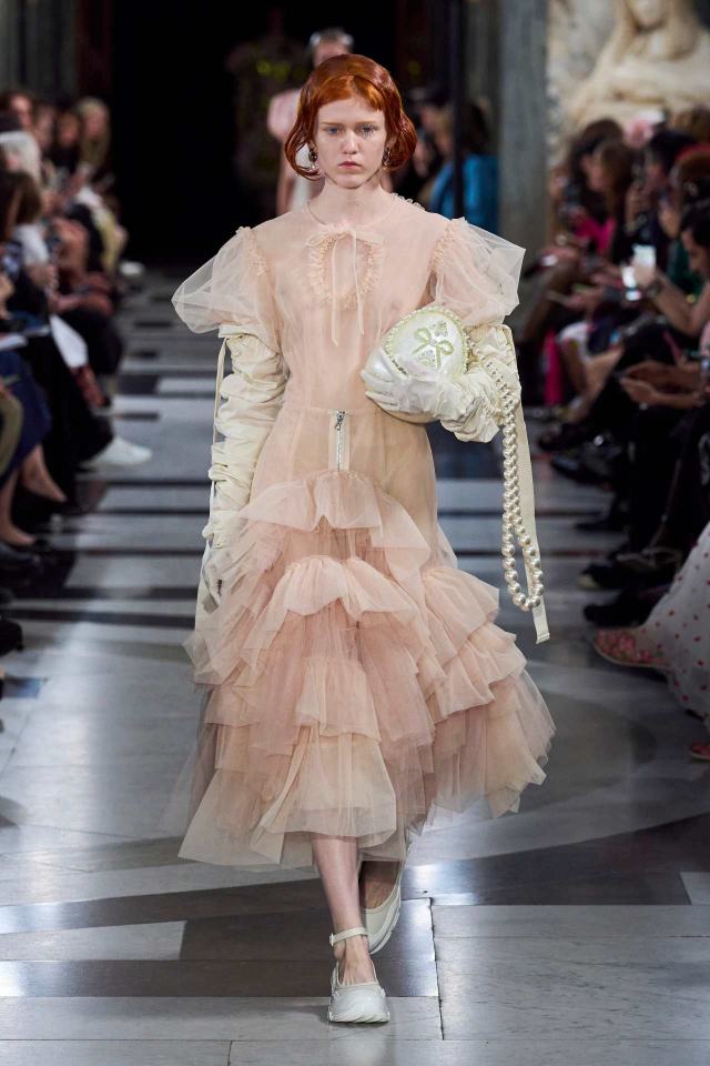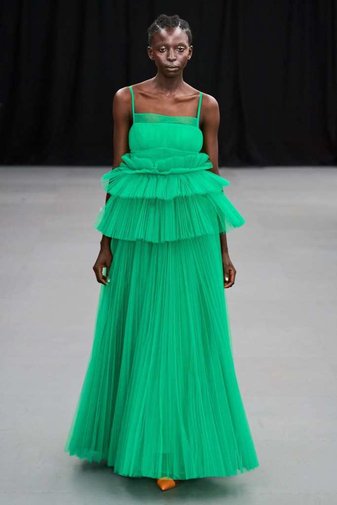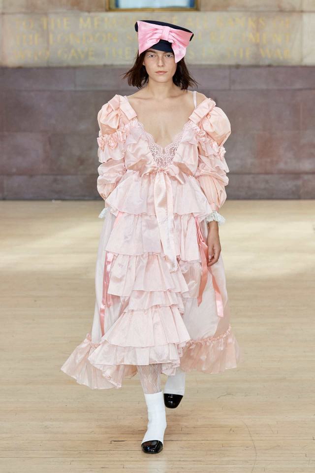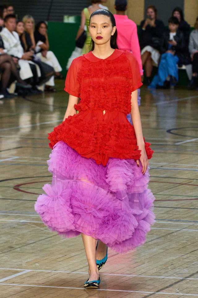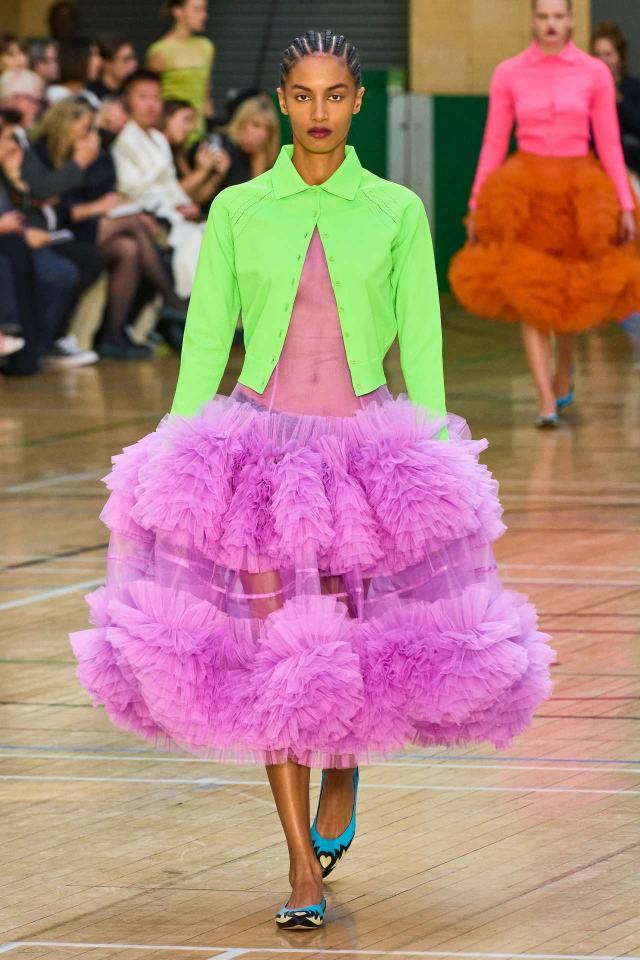 Molly Goddard: A lot of color and a lot of tulle! Molly Goddard decided to wow us this season after a rather long streak of nothingness. While the designer never really left I would call this collection her comeback. She features some of her well-known techniques with tulle here. A genuine burst of colors took place in the form of explosive tulle skirts and sheer overlays. Apart from tulle, the designer has delved into creating multiple other signatures from heavily ruffled tops to grandma-style dresses; while they haven’t worked that well this collection showcased some of the best. Some of the minimal gowns in the collection were surprisingly elegant. The shapes and cuts were simple and mature but when paired with the designer’s vibrancy and openness they bring clothes to life.
