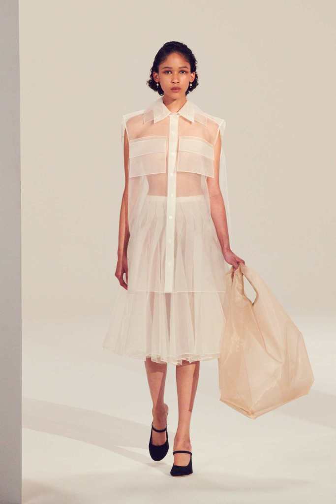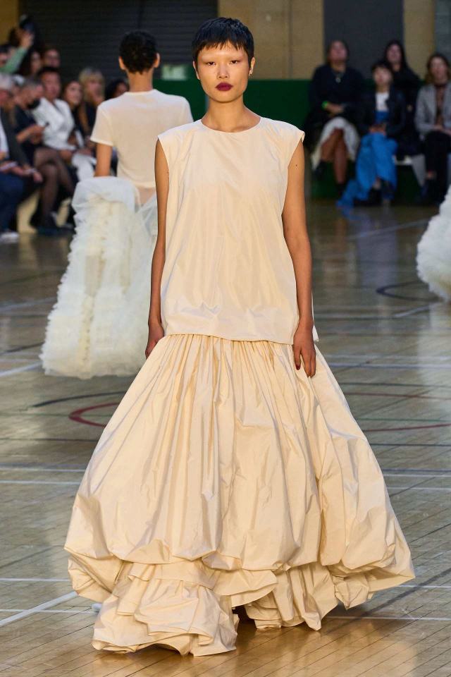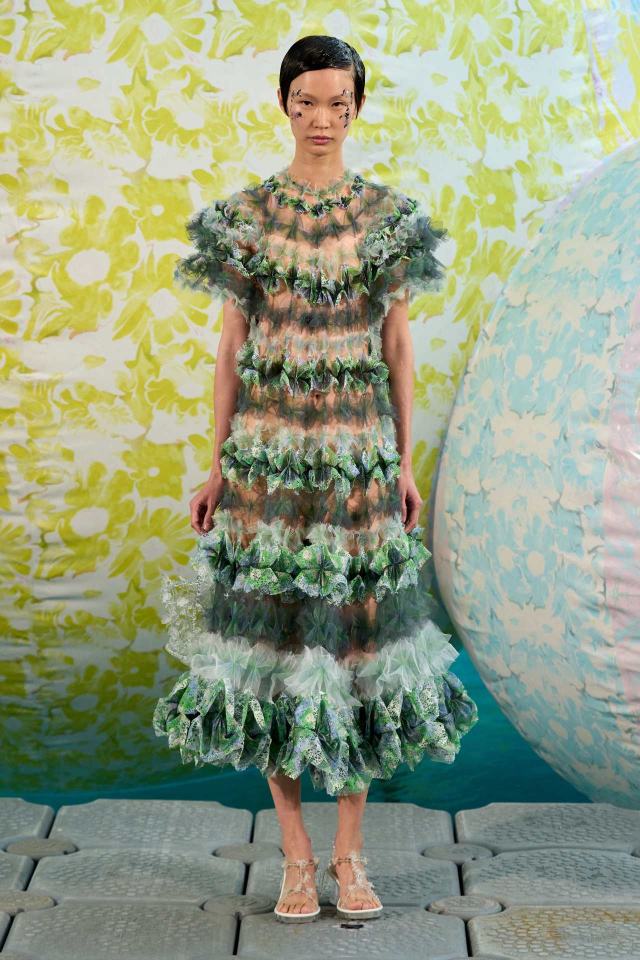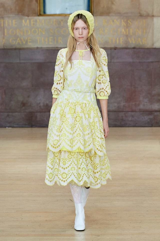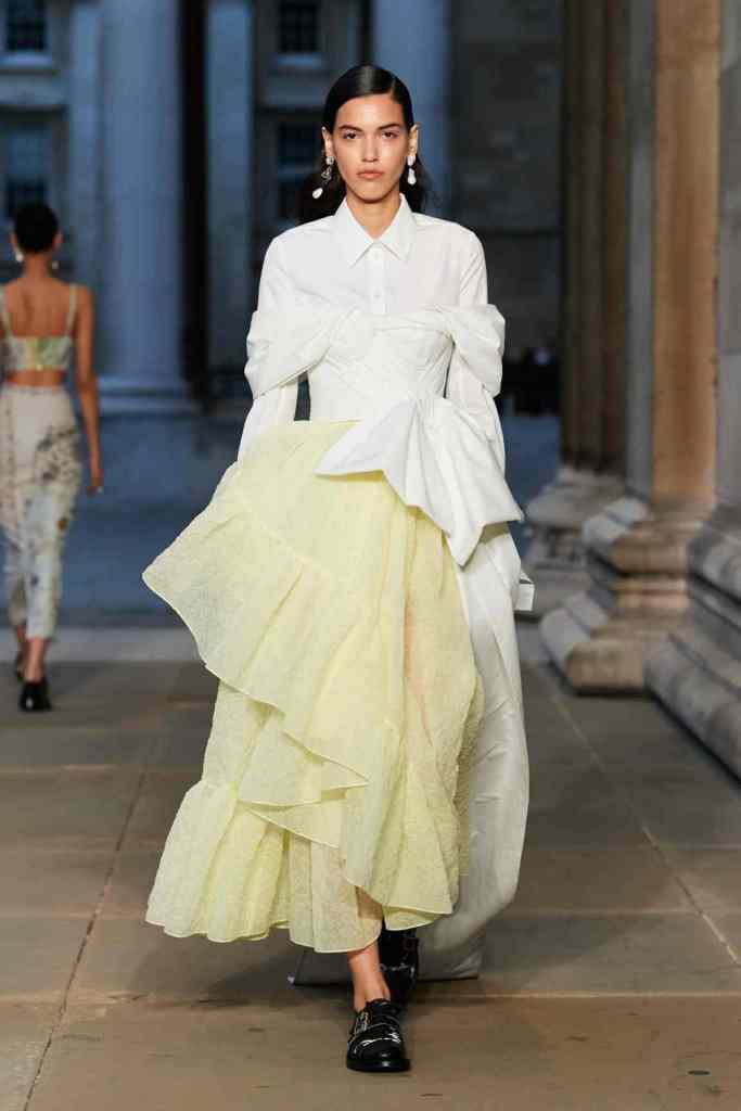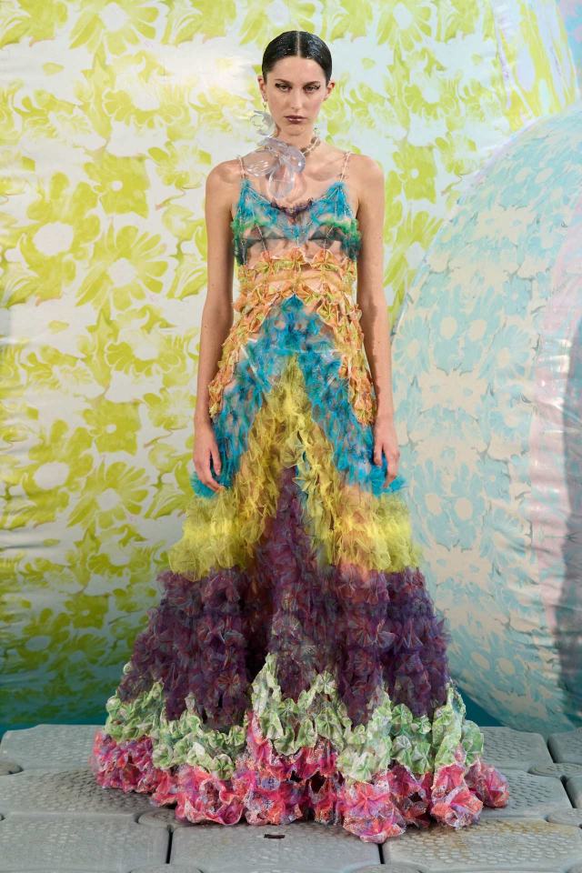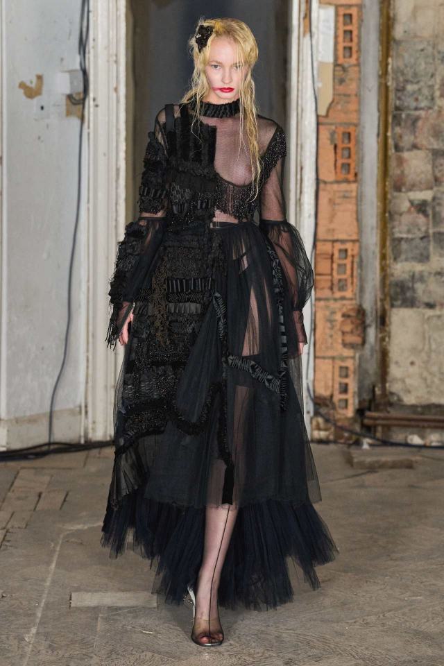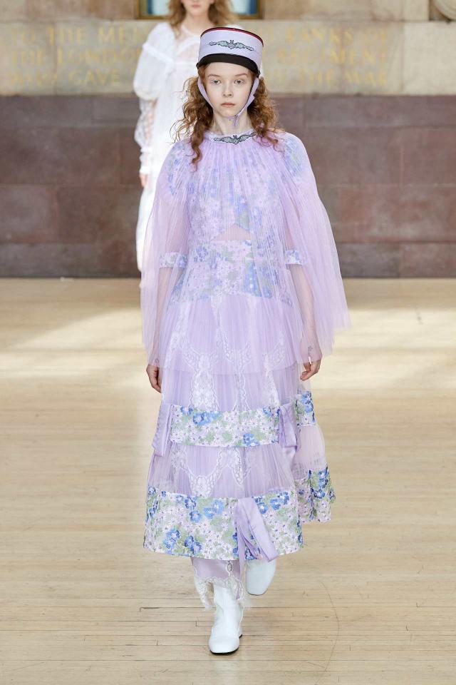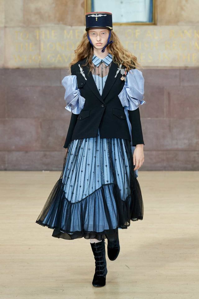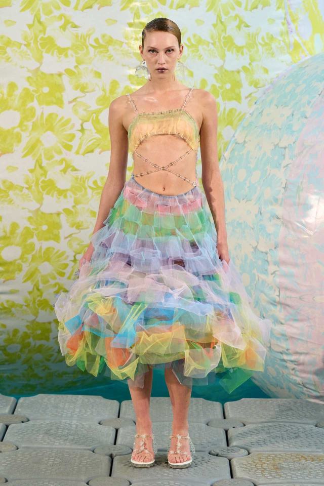 Molly Goddard: A lot of color and a lot of tulle! Molly Goddard decided to wow us this season after a rather long streak of nothingness. While the designer never really left I would call this collection her comeback. She features some of her well-known techniques with tulle here. A genuine burst of colors took place in the form of explosive tulle skirts and sheer overlays. Apart from tulle, the designer has delved into creating multiple other signatures from heavily ruffled tops to grandma-style dresses; while they haven’t worked that well this collection showcased some of the best. Some of the minimal gowns in the collection were surprisingly elegant. The shapes and cuts were simple and mature but when paired with the designer’s vibrancy and openness they bring clothes to life.