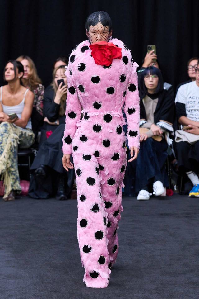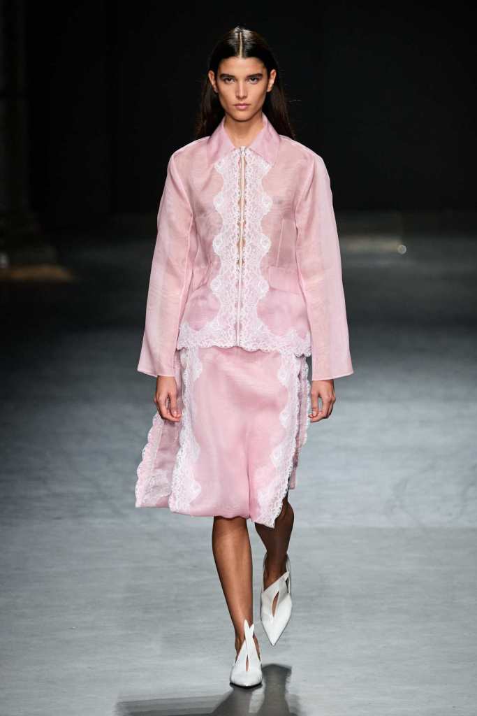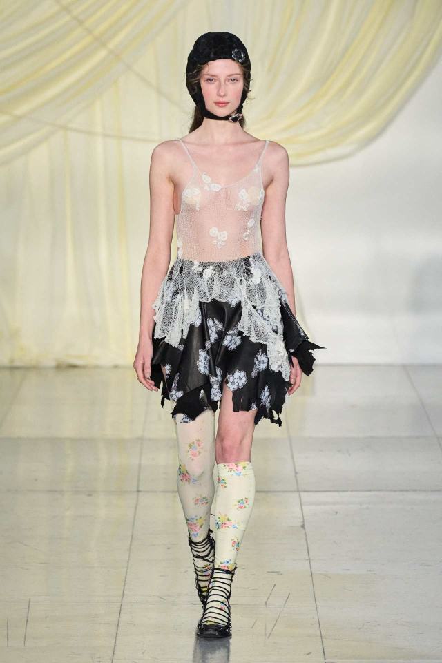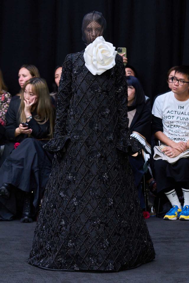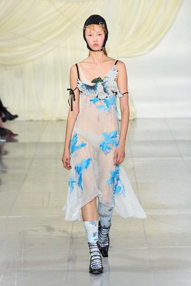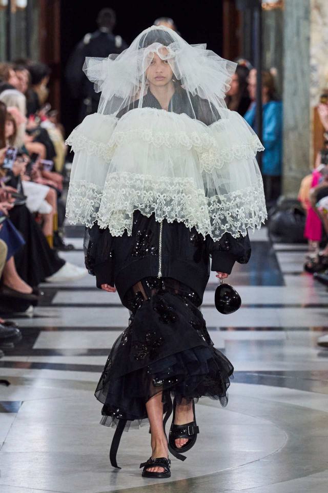 Simone Rocha: Simone Rocha continues with her playful and ethereal feminine aesthetic with the four core values in this season being “Fragility, remorse, anger, and nature,”. A blend of everyday utilitarian silhouettes with dainty delicate motifs. There were some Rocha classics like floral embroidery, pearl embellishments, dramatic veils, voluminous skirts, flowing ribbons and deconstructed corsets among many that were persistent throughout the collection. This collection hangs well between hard and soft just like any other collection by the designer but in this one, it is beautifully prominent.