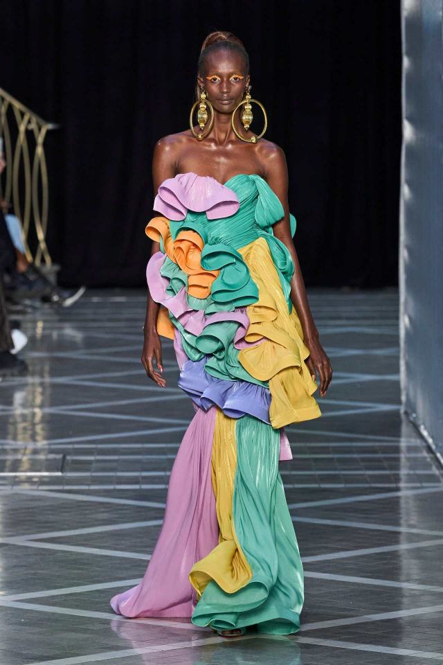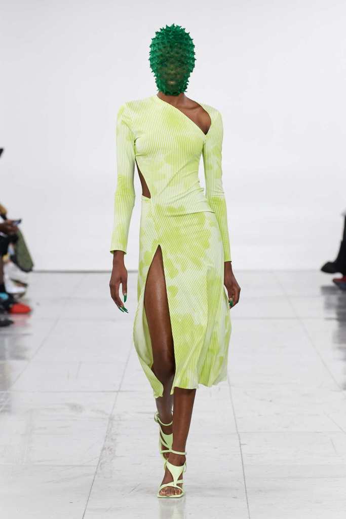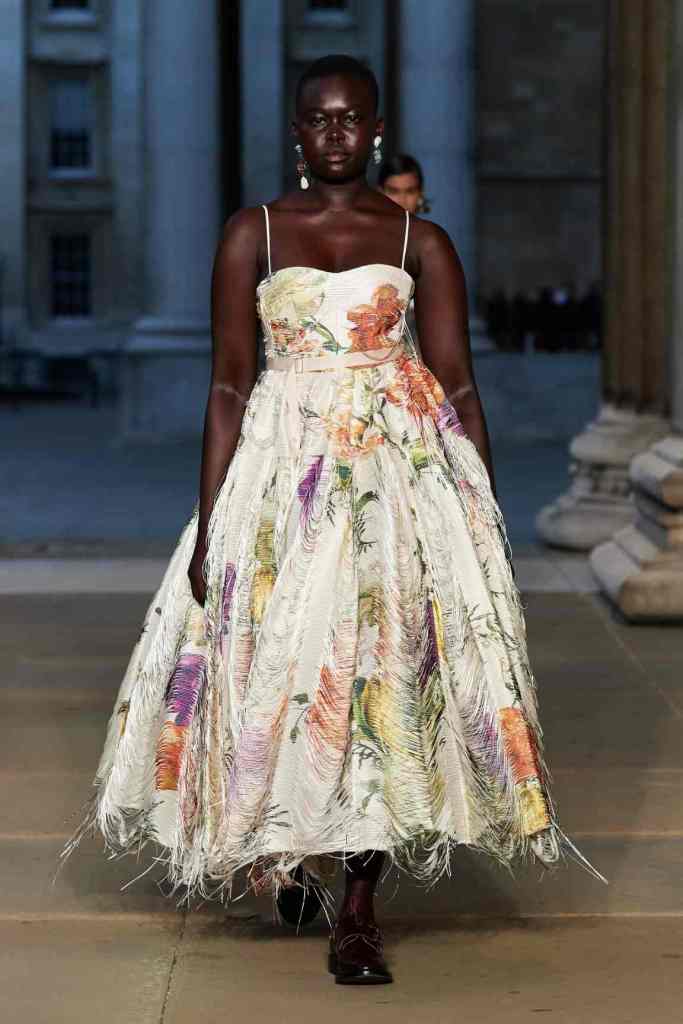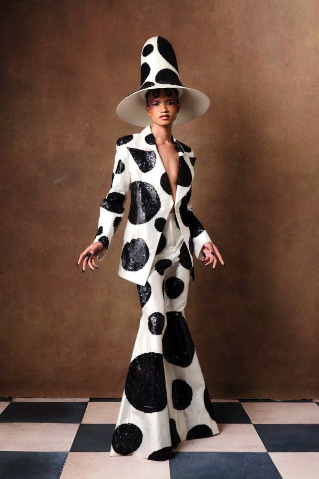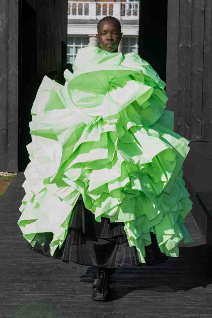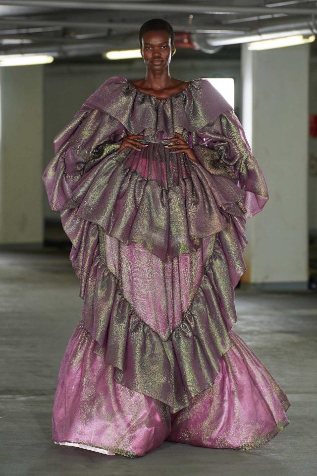 Thebe Magugu: This collection features striking playful silhouettes paired with some vibrant colors and a huge range of textures. Sleekly tailored clothes aim to elevate the individual’s everyday style not only with contemporary design aesthetics but a seamless blend of history and culture. This collection would make one would truly want to wear and live in; there is thoughtfulness behind each piece. There are standout prints, pleated skirts, feathers capes, tailored co-ords and elegant dresses that define this collection in a sea of separates.