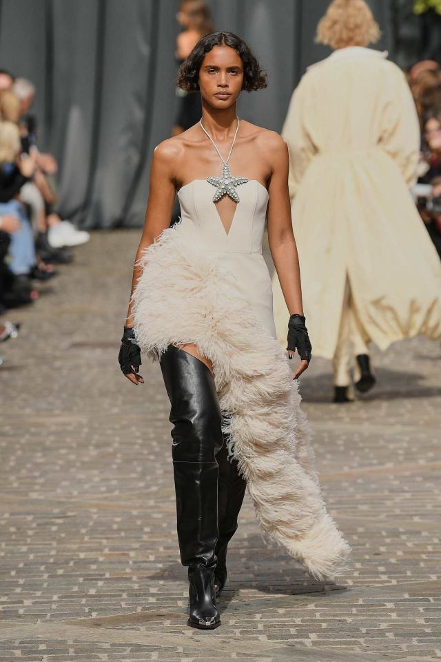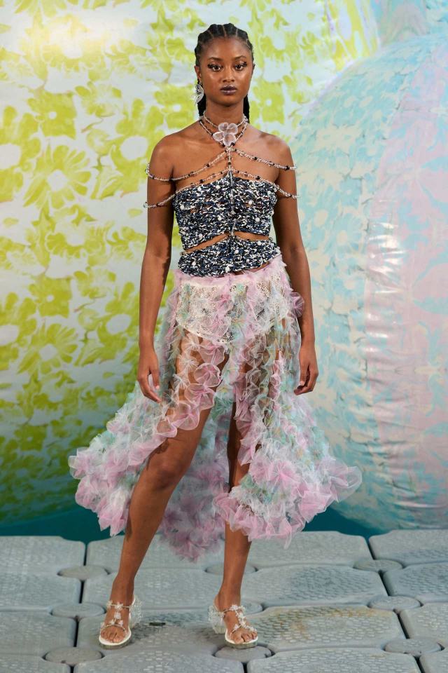 David Koma: David Koma has been on quite a roll with his unapologetic sexy statement-making clothes. A collection that featured oceanic-aquatic references explicitly. Almost couture-like detailing and embellishments elevate the clothes to more than just a designer piece. There were bold motorcycle jackets, feathered mermaid tails, skimpy cutouts, fishhook elements, starfish pasties, fishing net overlays, and some micro bralettes. The way Koma has managed to blend multiple aesthetics and made it his own is commendable. This collection is more lavish than the rest of his work and I’m here for it.