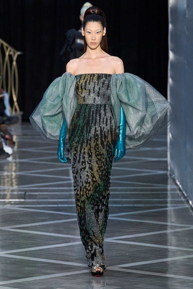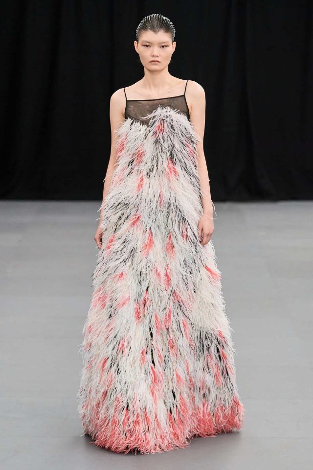 Huishan Zhang: This collection gave us a new sense of lightness and sophistication by the designer. Some daywear looks evoke a flirty business casual energy. There was some expected well-crafted evening wear that Huishan Zhang is known for. He is experimenting and diversifying into more categories and aesthetics which is undoubtedly a smart move business-wise as well as creatively. Some stand out pieces were translucent cardigans, subtly sequined dresses, feathered items and tulle gowns. The almost candy-colored vibrant color palette with timeless silhouettes had to be a definite hit.