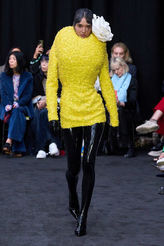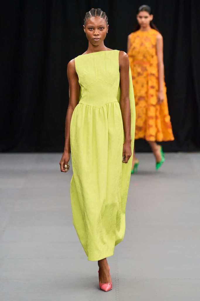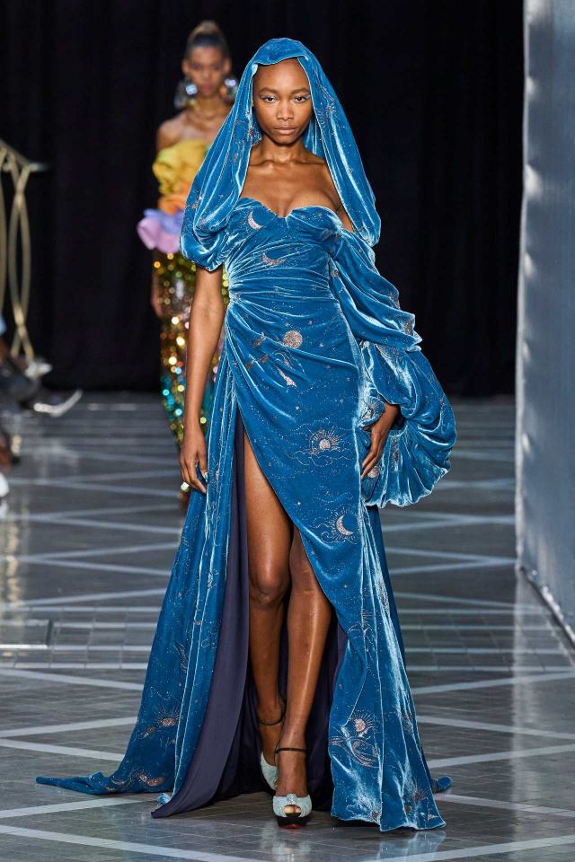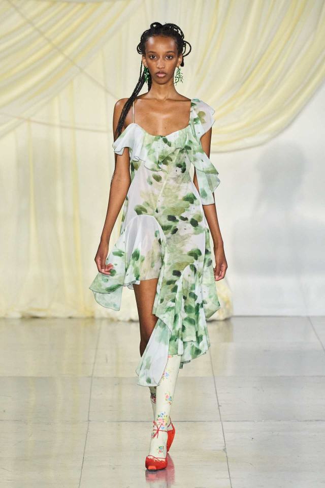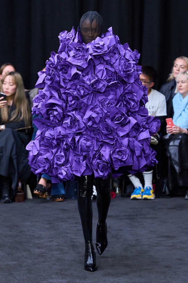 Richard Quinn: Richard Quinn pulled together an extra dramatic black funeral-themed series of looks in the wake of Queen Elizabeth’s demise. The man is simply too good. This was a true Quinn collection in all its Glory. The silhouettes were inspired by Queen’s fashion history and were as regally dramatic as they could be. While we all know Quinn is brilliant with color and prints this collection also proves his talent with just one color on the spectrum. The show gradually did on to more signature brand looks; striking colors in unusual silhouettes. While I question the monarchy’s existence often, it is sweet how the queen was one of the most prominent and early supporters of the designer’s work. He has a lot to thank her for and he did that pretty well here.