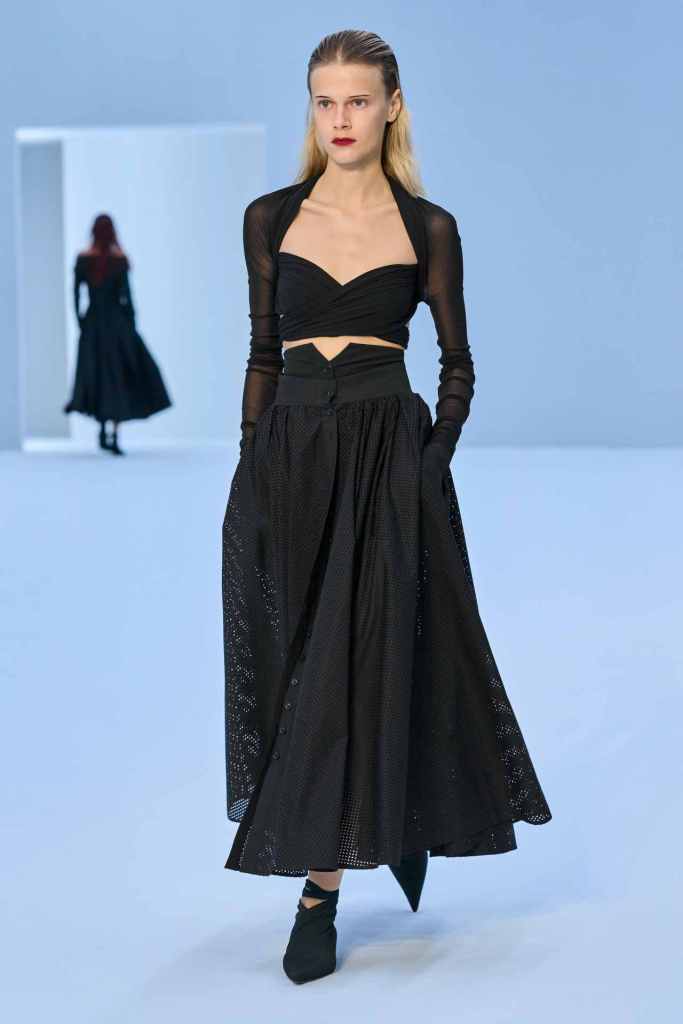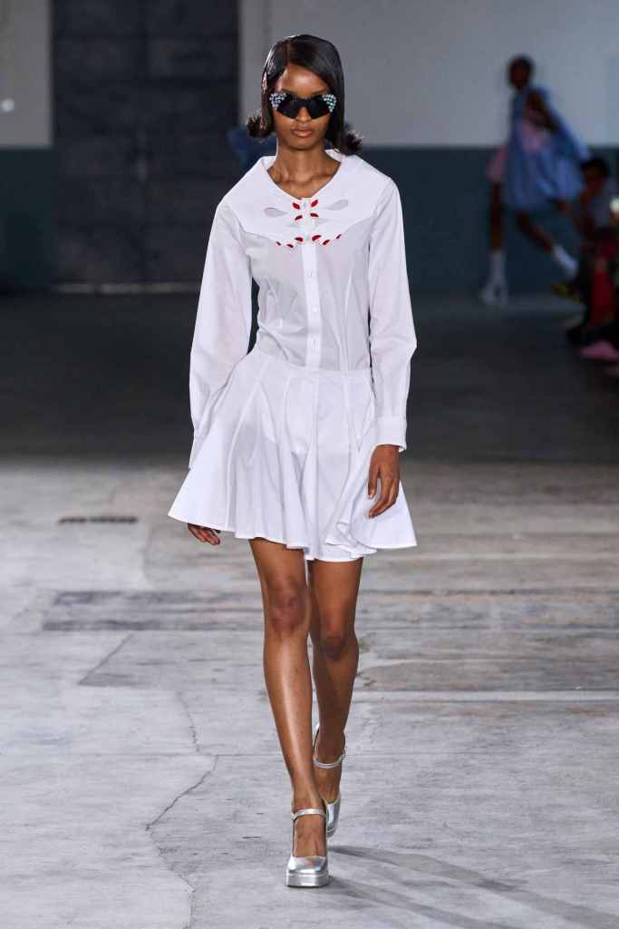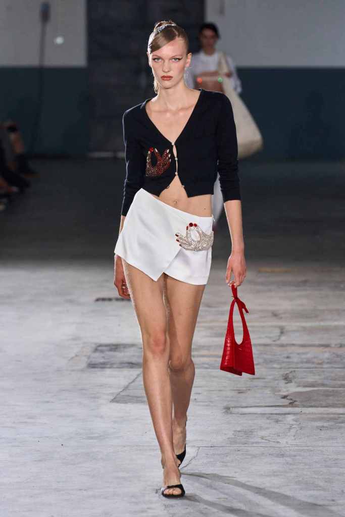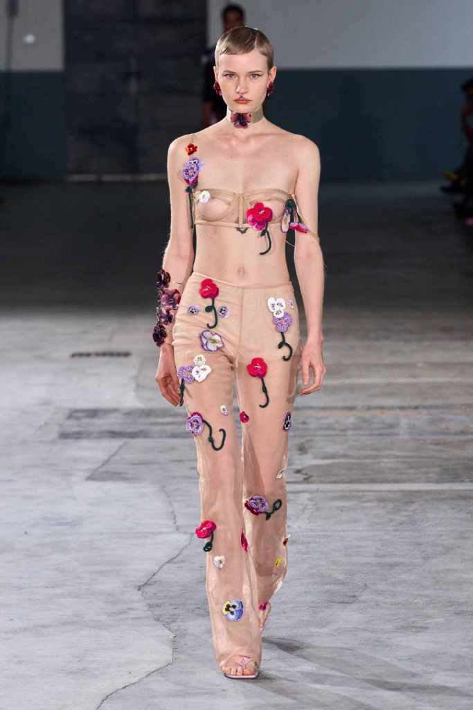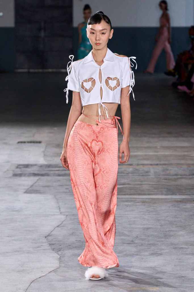 Vivetta: Vivietta had a moment this season. Vivetta Ponti was all about hearts this season. Heart-shaped belt heart cutouts, heart bra tops – it was endless. There was an injection of Y2K in this collection that fits well with the seductive flirty aesthetic curated by the brand. The designer was inspired by an experiment from the 1960s where a scientist measured the emotional response of plants and leaves. There was a sense of playful hyper-femininity; the excess of it ended up making it more desirable. Well, I hearted it.