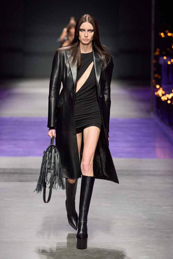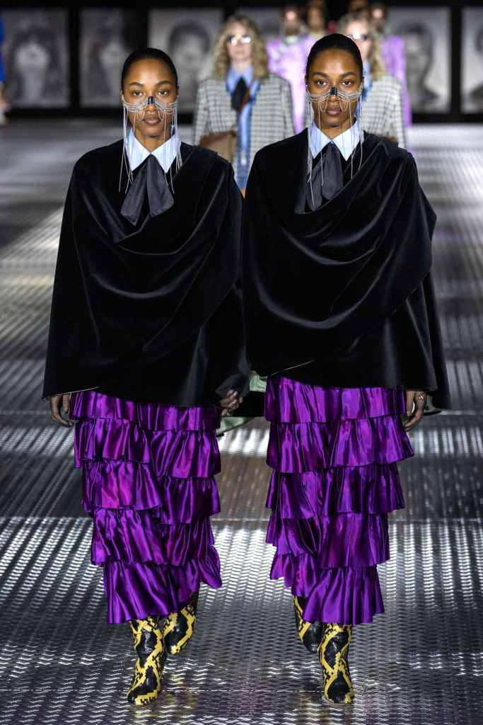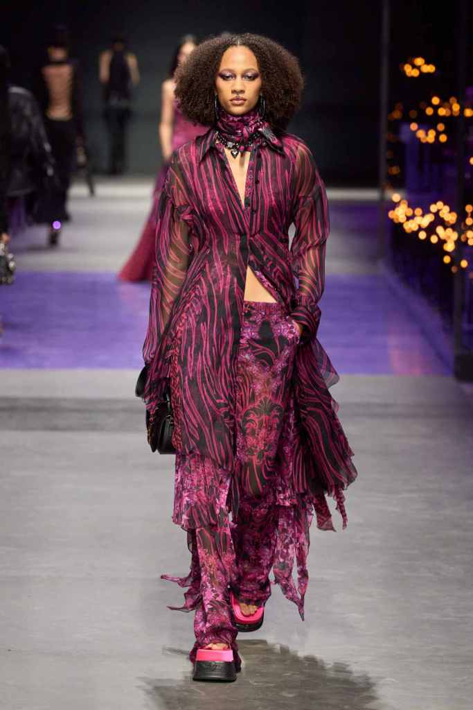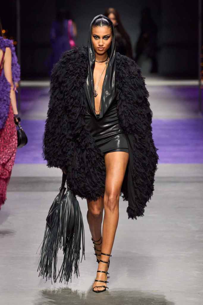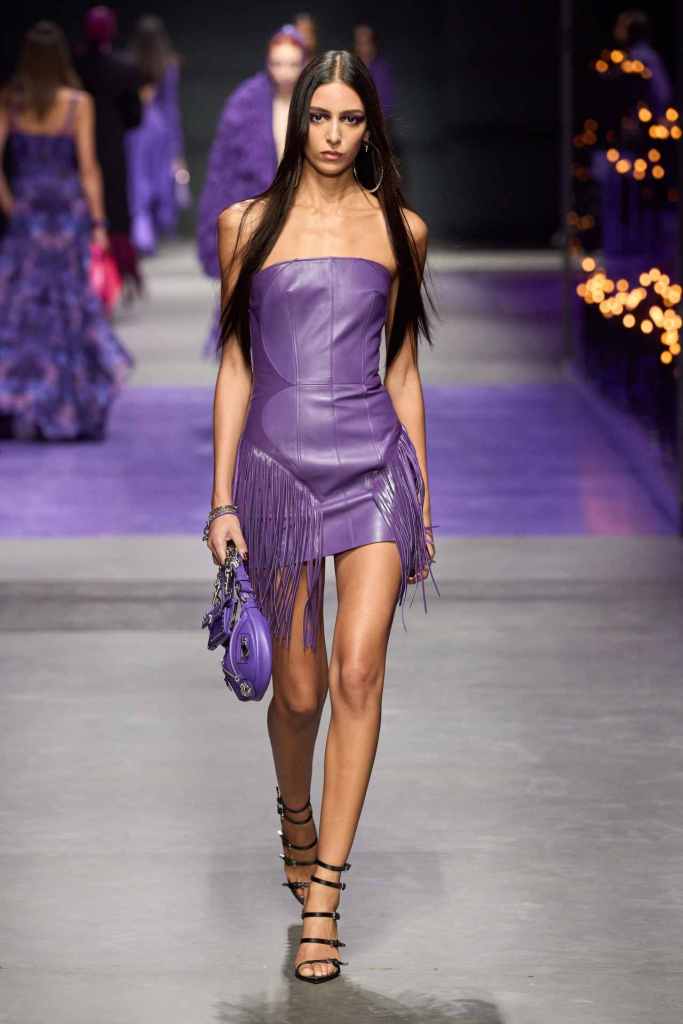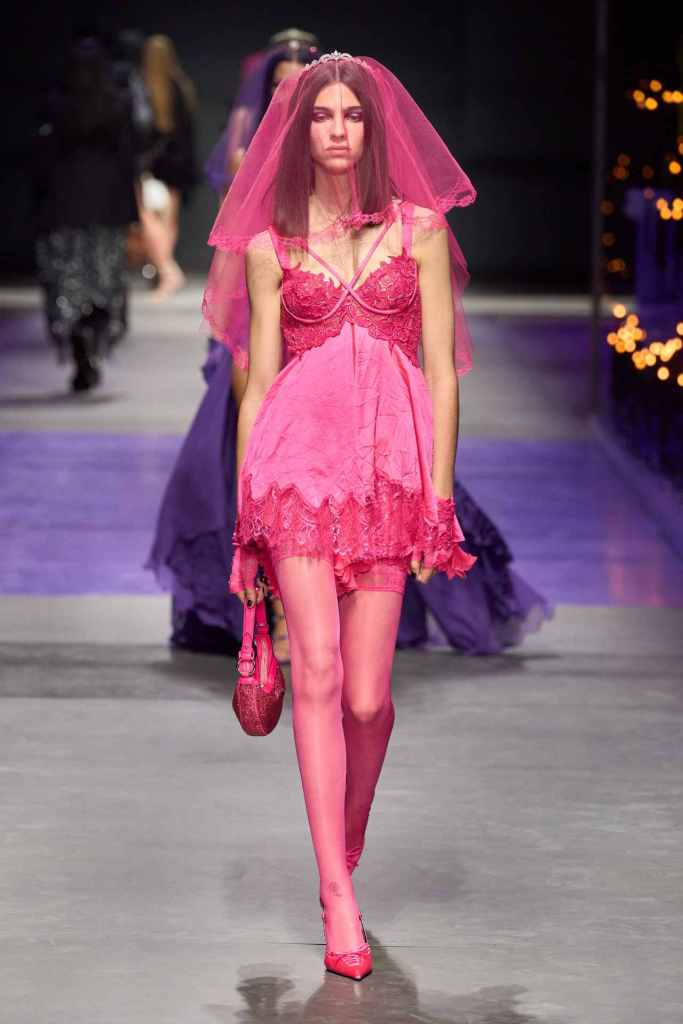 Versace: There was a lot of goth, grunge and glamour in this collection. Purple and black were the primary colors here with hints of pink; adding to the glam Rock chic energy. A lot of references to archives and playing on the 90s nostalgia that is bound to connect with countless fans. The collection started with some subversive all-black looks featuring leather jackets, fringed bags, strappy heels and form-fitting dresses. The collection moved to more sprightly looks with a lot of prints and excessive layering. The collection ended with a series of solid-colored laced babydolls worn with veils – extremely reminiscent of 90s runway shows. This collection was Versace on point.