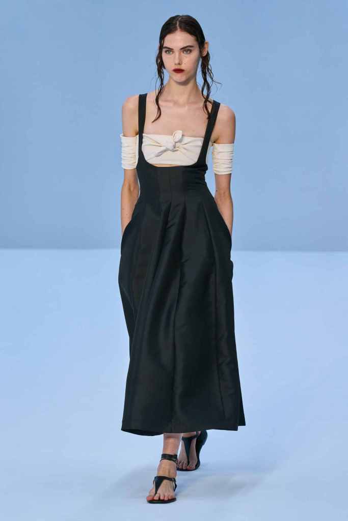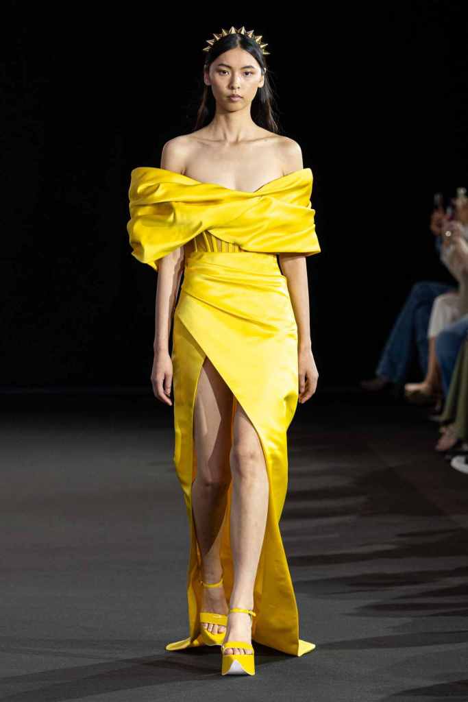 Del Core: This collection features some of the most well-crafted creations by the designer. Daniel references the ocean and his own diving experiences in this collection. With couture-like craftsmanship and sleek sculpted tailoring, this collection elevates Del Core’s design aesthetics and potential to new levels. There were structured suiting, satin slip dresses, dramatic capes, brocade co-ords and bustier bodices. There is a strong energy of movement and vividity in the garments. While this collection is deeply feminine and luxurious it does carry a powerful commanding aura to it.