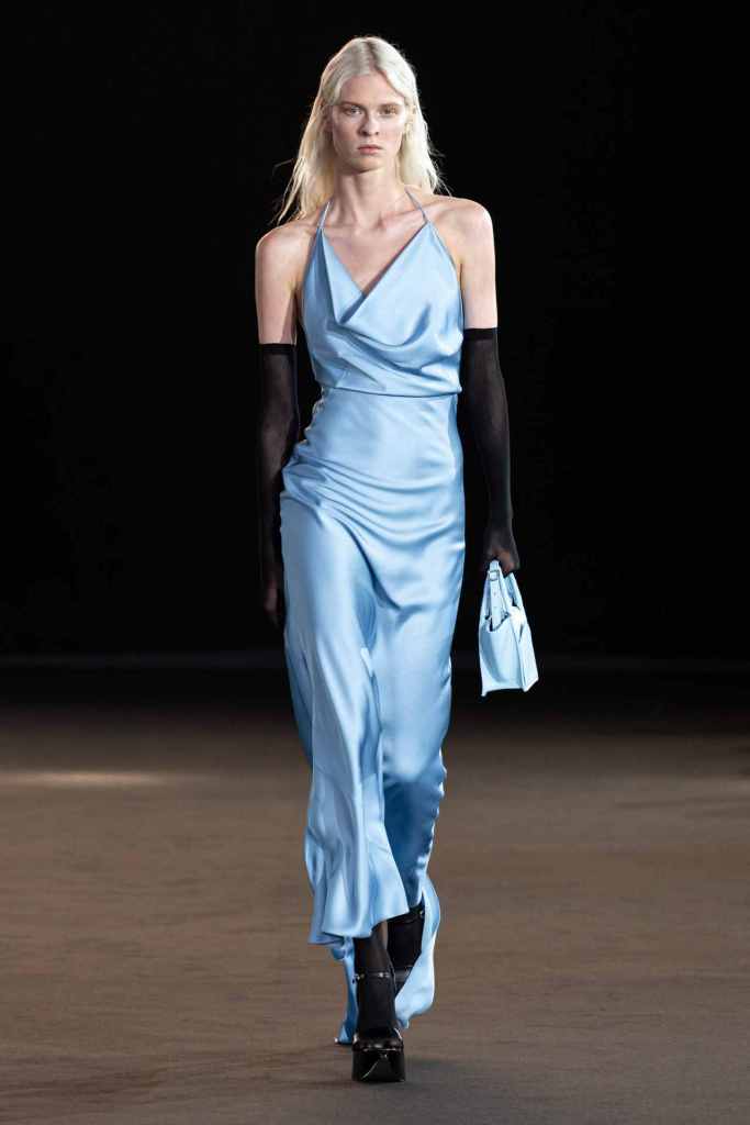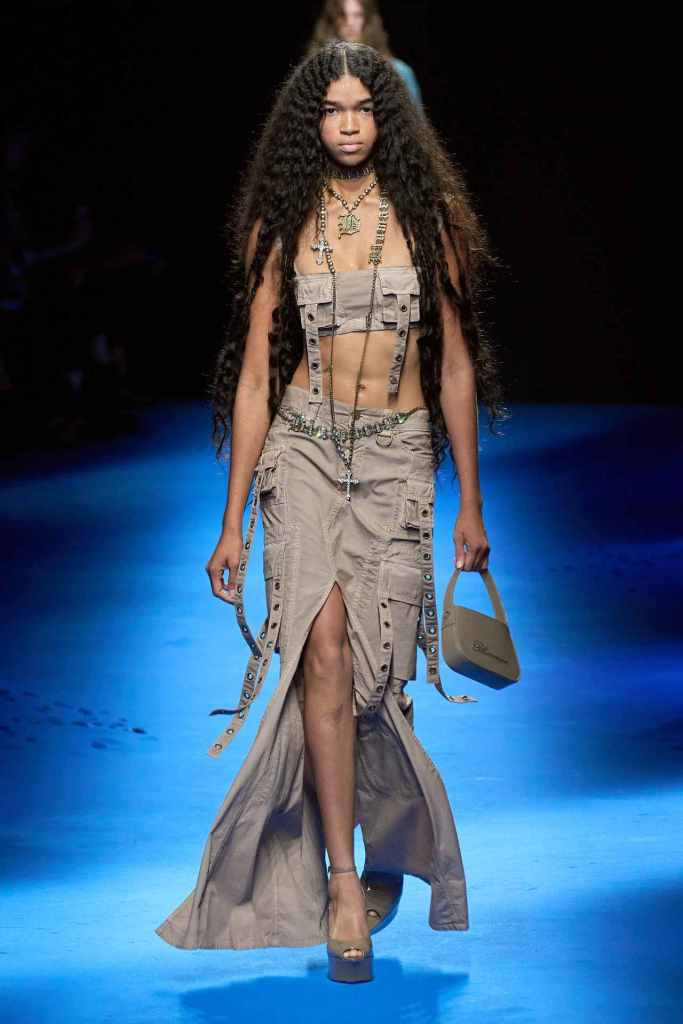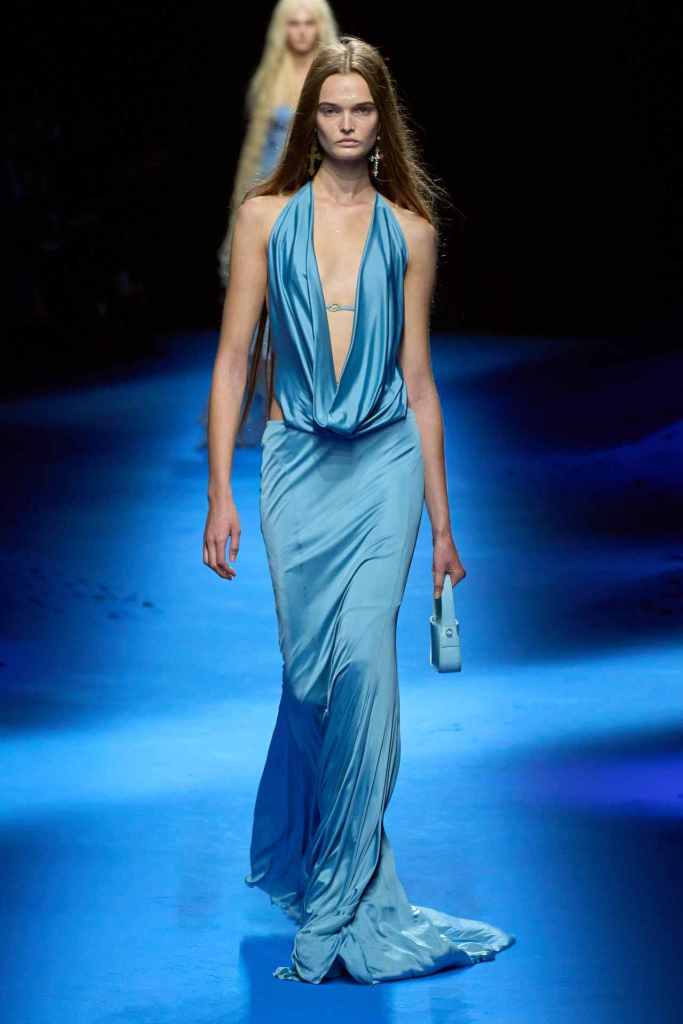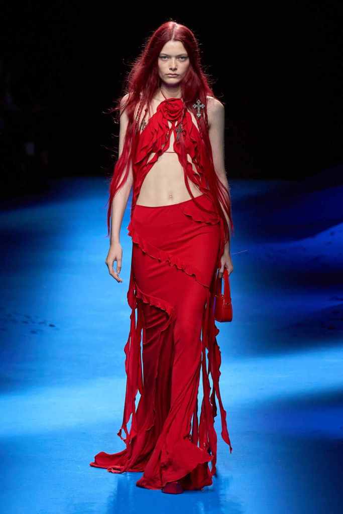 Blumarine: We meet the Blumarine mermaid this season; she is raw, seductive and impactful. The clothes get a bit of refined grunge injected this season; there was denim overload, deep oceanic colors, trailing flared trousers and second-skin silhouettes. The Blumarine logo and roses get seductively powerful with each collection along with some more developing brand design language. Nicola Brognano has been very subtle yet quick in his attempts to create a more elaborate world that isn’t all about Y2K. The Blumarine girl keeps our hopes up.