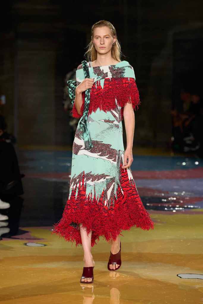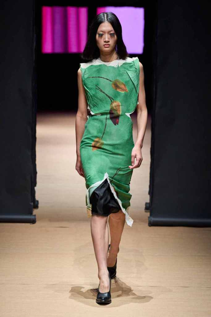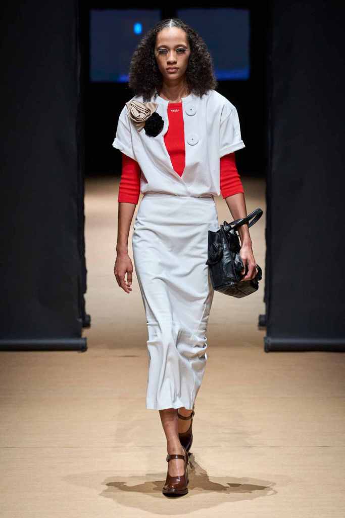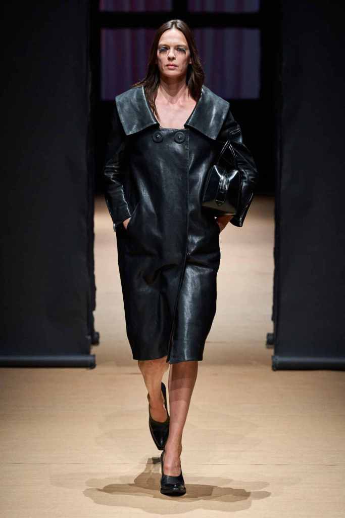 Prada: A dive back into Prada’s minimalist roots and 90s charm. Original Miuccia with a Raf twist! what more could a Prada girl ask for? Oversized tailoring starts off the show and then we see some quite awkward ill-fitting jumpsuits completely intended to be that way. Leather skirt suits, blazers with trains, sheer knitted skirts and boxy mini dresses were some defining pieces in this lineup. The primary theme for this collection was raw and undone energy. Wrinkled sweaters, undyed edges in dresses, raw-edged skirt hems along with more twists, wrinkles & creases in fabrics showcase this perspective; while also nodding back to some previous landmark Prada collections. This collection was dark, powerful and Prada all the way.
