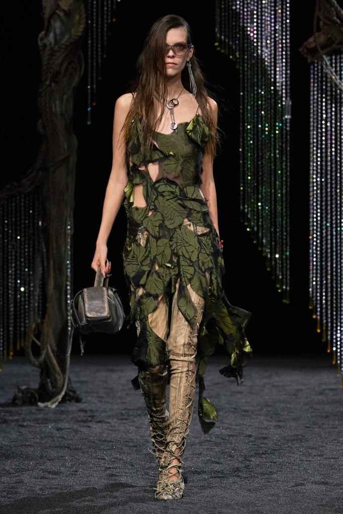 Acne Studios: Acne Studios presented their nature-inspired collection in Paris, featuring a fantasy forest setting designed by Shona Heath, with electronic music by Sarahsson and models walking out from the darkness. The collection celebrates growth and evolution with a contrast between urban life and nature. The pieces include evening wear and outerwear, with earthy tones and poisonous shades of bright colors. The materials are distressed to look aged in dirt and rain, with textures inspired by all things nature, from flowers to tree bark, giving a melancholic and magical effect. Considering the current state of the world and the advancements in technology, it is understandable for Jonny Johansson to feel the need to seek refuge in nature.