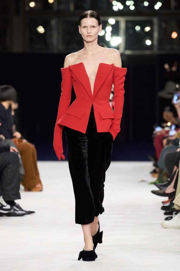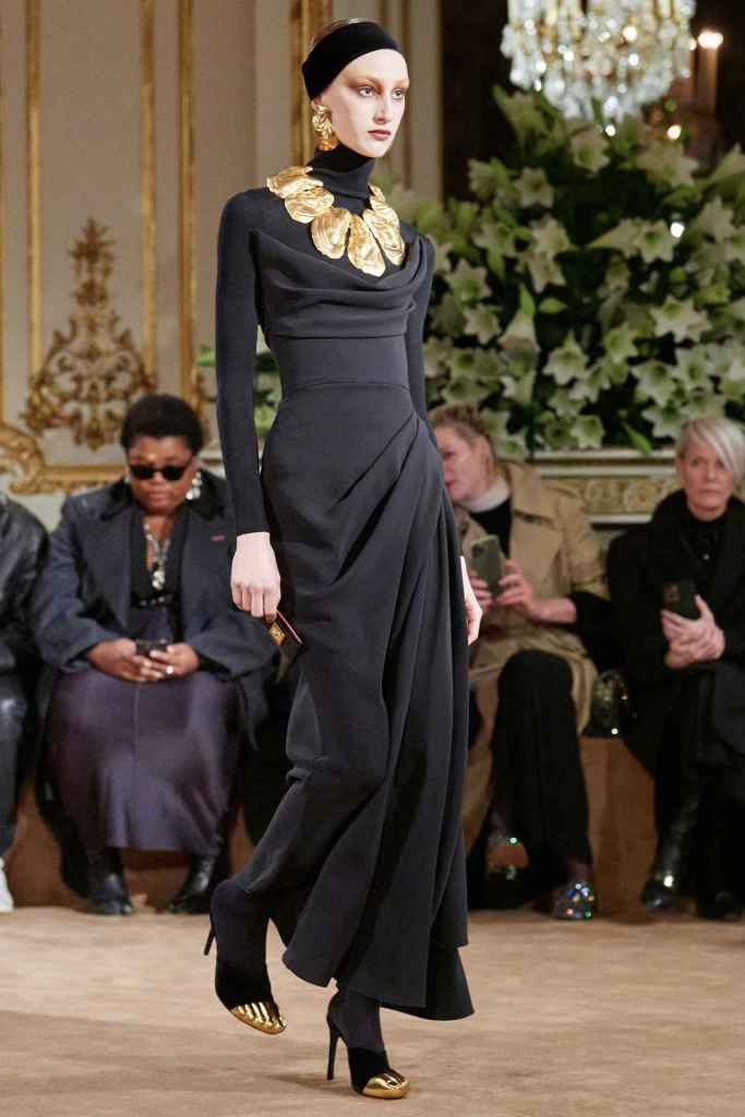 Schiaparelli: Daniel Roseberry showcased elevated casual wear at Schiaparelli’s first runway Redy-To-Wear show, taking inspiration from Elsa Schiaparelli’s style. The collection featured a range of clothing items, from classic white poplin shirts to short velvet cocktail dresses, infused with Schiaparelli’s trademark humor, irreverence, and drama. Roseberry aimed to demonstrate that you can add statement elements to everyday wear without sacrificing wearability. The entire collection was adorned with gold details – Now a Schiaparelli signature. At a time when brands are vying for attention through shock tactics or viral marketing, Schiaparelli stands out by staying true to its roots and self-assurance. The ideal approach is to simplify everything to the maximum extent, but without making it plain – Roseberry nailed this here.