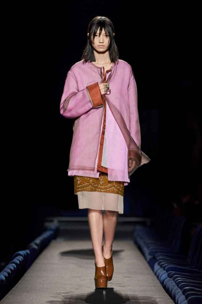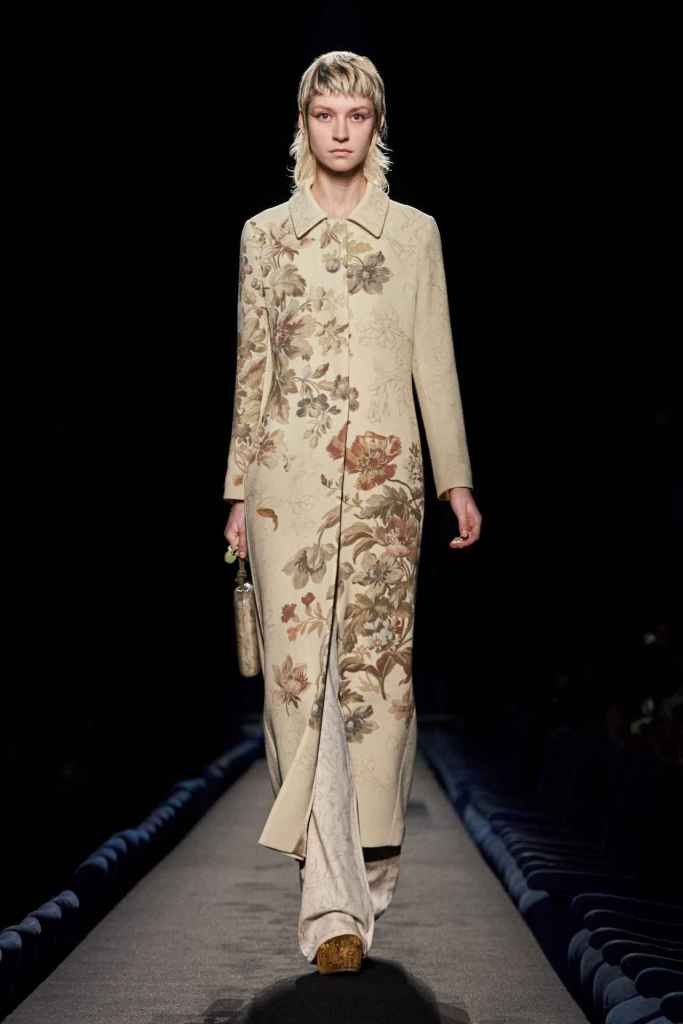 Dries Van Noten: This show is a contemplation of the connection between a dress and its wearer, highlighting moments of closeness and tenderness. The show features personalized clothing, including floral accents, large coats, elegant tailoring, intricate embroidery, and gentle silhouettes, all with a touch of gold. The designer’s creations have been simplified and adorned with minimalist ornamentation, resulting in refined and sophisticated pieces. This collection reminds us that intimacy wins. For a Dries Van Noten this collection is a dreamy haven; filled with love and nostalgia. Father Dries!