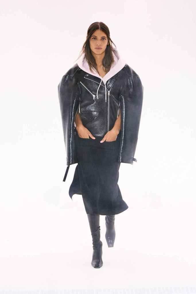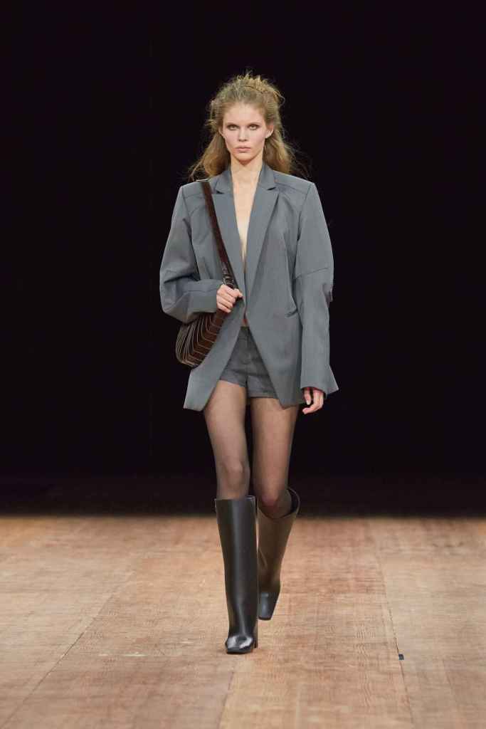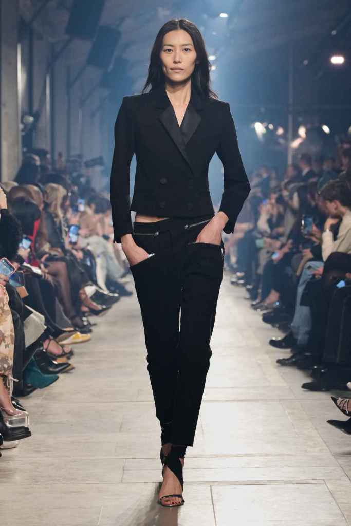 Coperni: Coperni focused on merging technology and fashion by featuring robo-dogs by Boston Dynamics in their collection. The inspiration for this collection is Jean de la Fontaine’s fable, The Wolf and the Lamb, which explores power imbalances in society. Coperni’s interpretation envisions a positive future where humans and technology work together in a symbiotic relationship. The runway showcased a mix of classic French staples with reflective fabrics, mixed materials, and deconstructed denim. The collection also delved into power dynamics between humans and technology, exploring themes of fragility, danger, purity, and naivety. It was nothing compared to Bella Hadid’s spray dress moment; it was a palate cleaner a best.