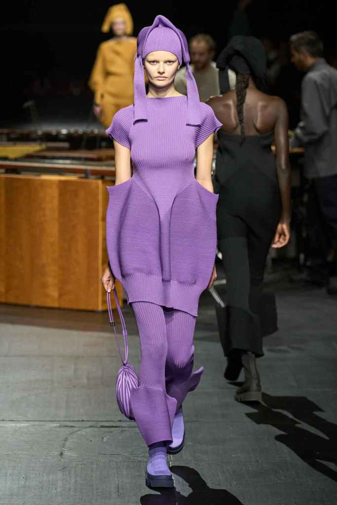 Issey Miyake: Titled “The Square and Beyond” this collection was a celebration of symmetrical and rational geometry. The clothes took the form of multiple proportions and shapes in bold colors paired with basics. We embarked on a mind-blowing journey of creativity and innovation with this collection, led by Satoshi Kondo. This collection defies conventional shapes and explores new realms by incorporating cutting-edge ideas and technologies, resulting in garments that are nothing short of mesmerizing. With an unconventional aesthetic that relies on a fresh interpretation of ma – the unfilled space between the clothing and the wearer. This collection is boldly pushing boundaries in terms of how to thoughtfully envision and guide a collection, and how to put your intellect into clothes.