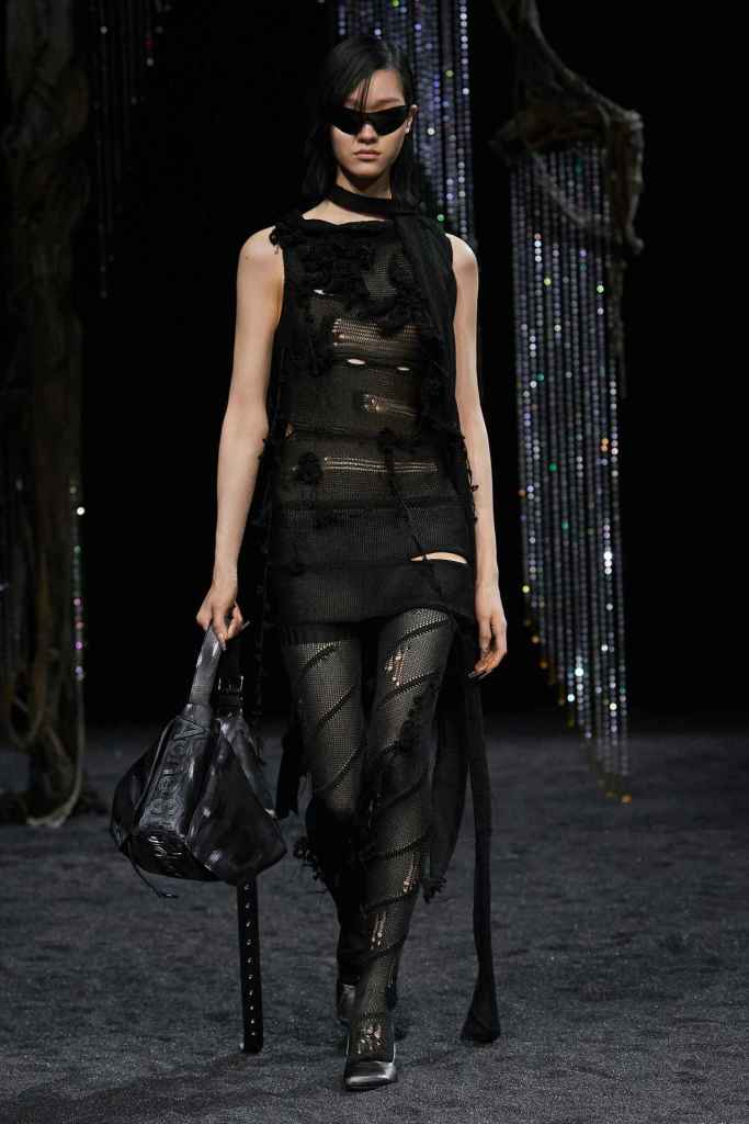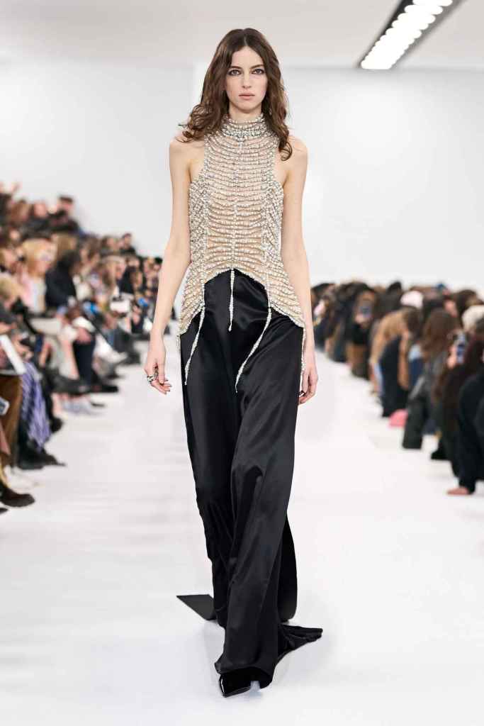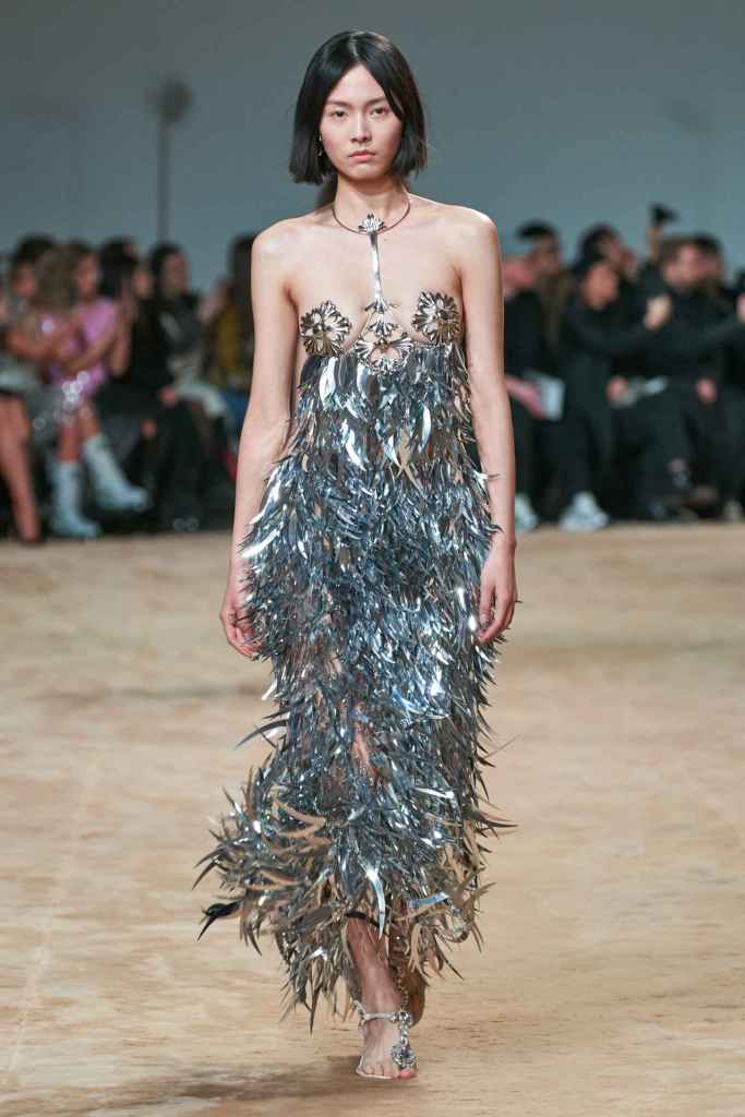 Paco Rabanne: The new collection pays tribute to Paco Rabanne, the iconic designer who passed away at 88 this February. Creative director Julien Dossena created a glittering array of pieces that are in line with Rabanne’s unconventional and visionary futurism. The collection explores the use of fabrics and textures, with a focus on unconventional materials. The archival looks exemplify Rabanne’s space-age aesthetic from the ’60s, reminding viewers of the possibilities of using unconventional materials in fashion. Salvador Dalí’s paintings were showcased on sweeping gowns adding to retro surrealism. The closing 5 looks are direct reinterpretations of some iconic minidresses; We go back into Rabanne’s fantasy world where he effortlessly breaks conventions using jingling inventive garments.