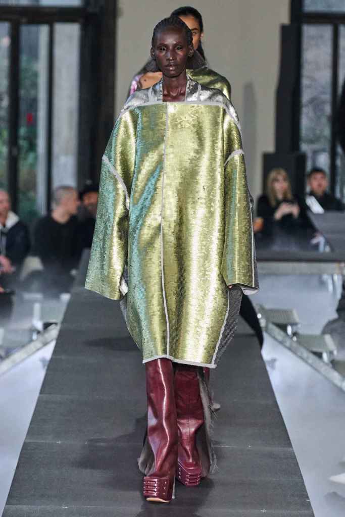 Rick Owens: Once again, Rick Owens takes center stage in the fashion world with a collection of dramatic, lavish, and unconventional masterpieces. The designer oscillates between the beauty and darkness of our world, reflecting his vision and fusion of opposing elements in his designs. Owens aimed for his collection to be comparable to the work of photographer Richard Avedon, and he succeeded. The clothes featured voluminous silhouettes and exaggerated shoulders, which were previously only seen in dark colors, but this season they were incorporated into brighter hues such as silver, lime green, and pink sequins. Owens possesses the ability to revolutionize our ideas about clothing. His vision distinguishes outstanding fashion designers from those who simply sew garments. Simply Splendid!
