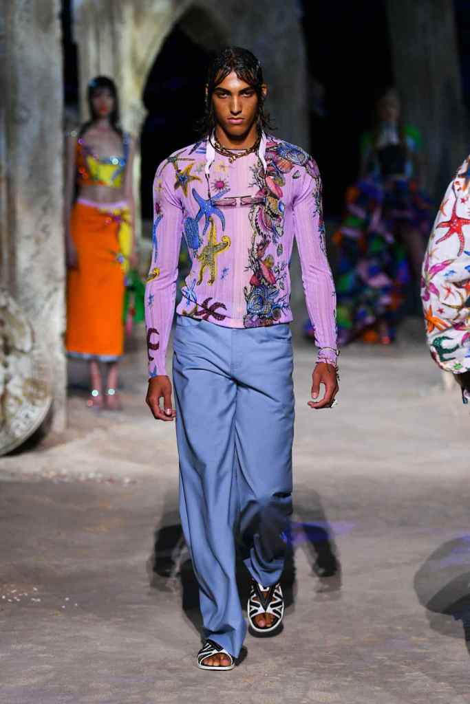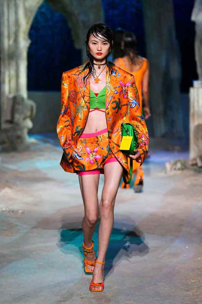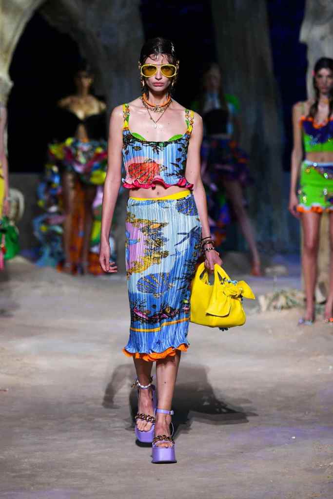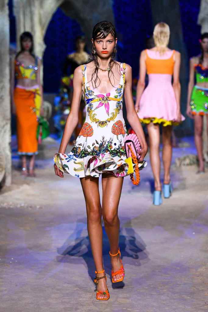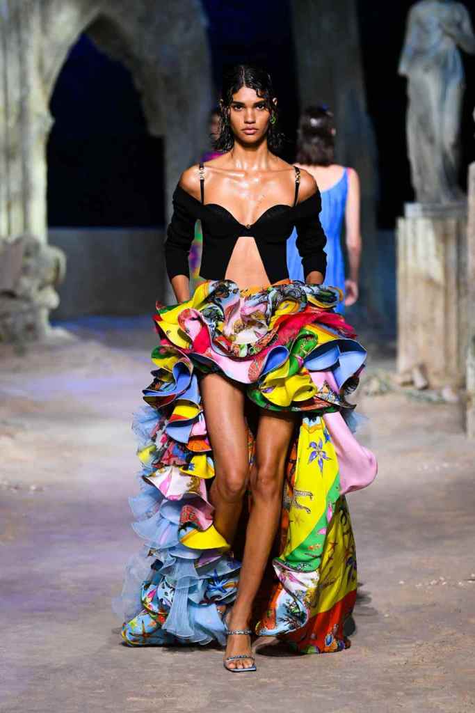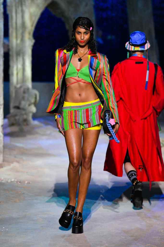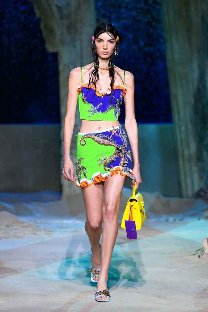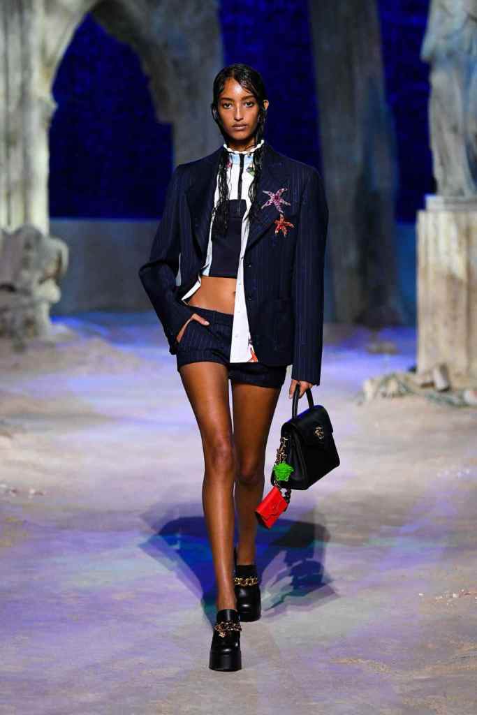 Donatella Versace transformed the runway into a utopian wonderland, the runway was sand covered with Roman pillars ruins transporting us straight into the pages of Greek mythology with aquatic-themed ‘Under the Sea’ visuals. The clothes draw inspiration from the wondrous beauty of the ocean, as evidenced by its collection of dresses and gowns that boast Onda hemlines, taking cues from the ebb and flow of the ocean’s waves. The Trésor de la Mer print from Spring 1992, an emblematic design of the fashion house, also makes a statement in the collection with its striking hues. Ruffles that looked like oceanic movements were adorned on countless dresses and hemlines, starfish brooches, tops reminiscent of scuba diving suits, brightly colored stripes and some sleek mermaid-style midi skirts. From crystal-encrusted bra tops to blinged-out embellishments on sharp black blazers, the shells and starfish motifs were used in a myriad of creative ways, adding a touch of glamour to each outfit.