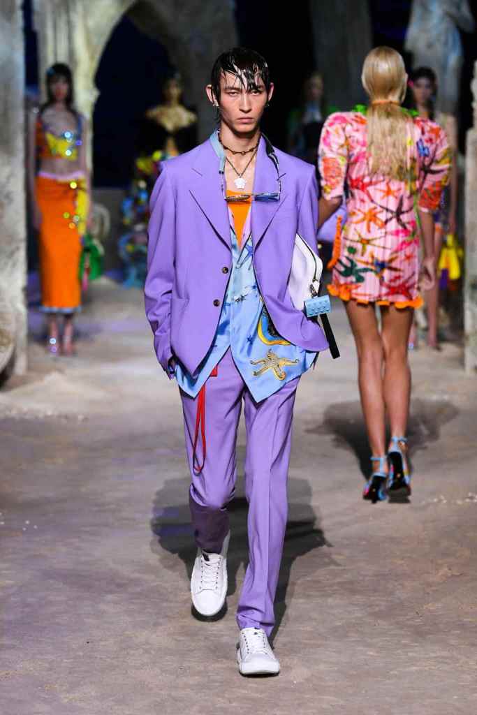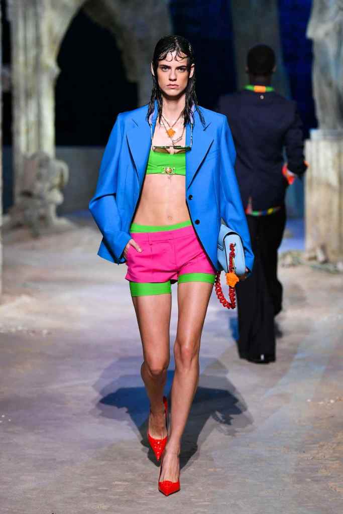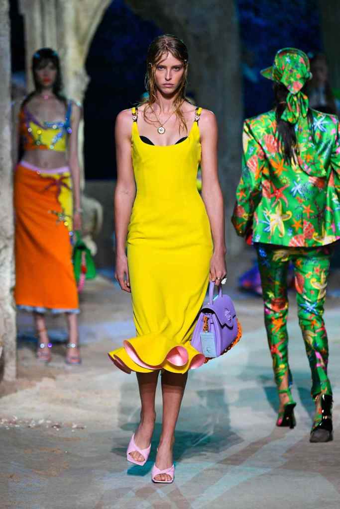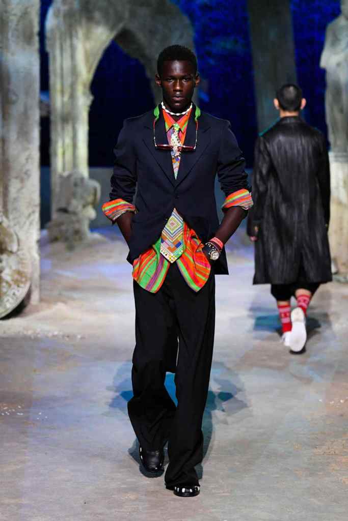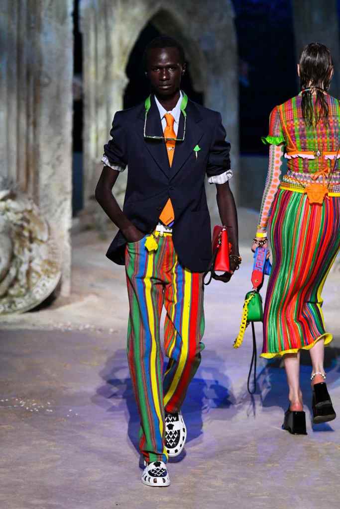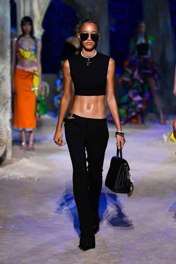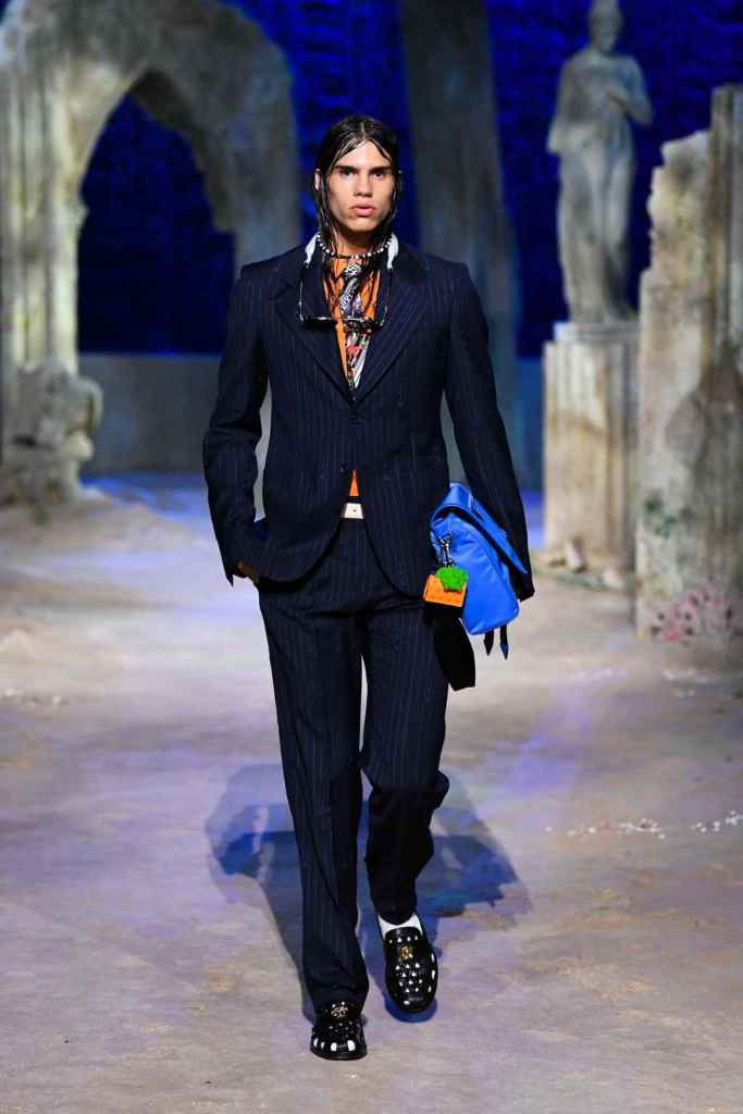 Donatella Versace transformed the runway into a utopian wonderland, the runway was sand covered with Roman pillars ruins transporting us straight into the pages of Greek mythology with aquatic-themed ‘Under the Sea’ visuals. The clothes draw inspiration from the wondrous beauty of the ocean, as evidenced by its collection of dresses and gowns that boast Onda hemlines, taking cues from the ebb and flow of the ocean’s waves. The Trésor de la Mer print from Spring 1992, an emblematic design of the fashion house, also makes a statement in the collection with its striking hues. Ruffles that looked like oceanic movements were adorned on countless dresses and hemlines, starfish brooches, tops reminiscent of scuba diving suits, brightly colored stripes and some sleek mermaid-style midi skirts. From crystal-encrusted bra tops to blinged-out embellishments on sharp black blazers, the shells and starfish motifs were used in a myriad of creative ways, adding a touch of glamour to each outfit.