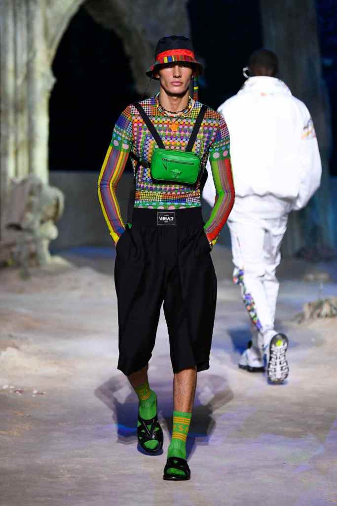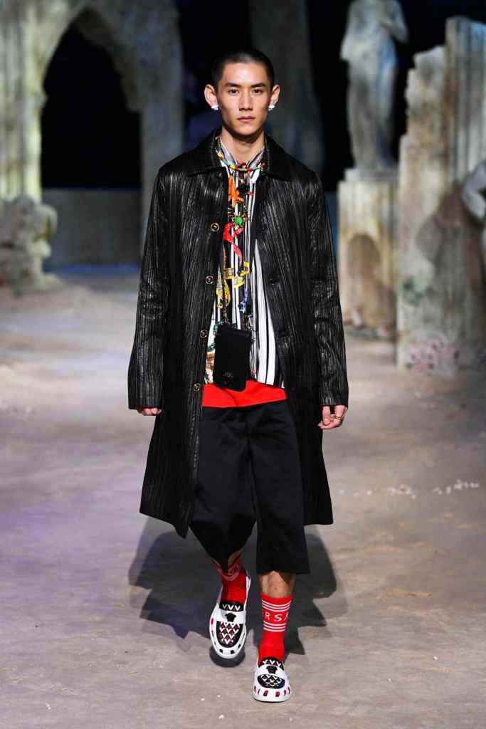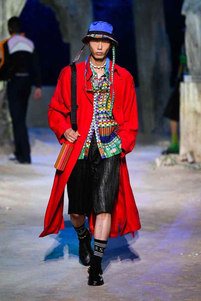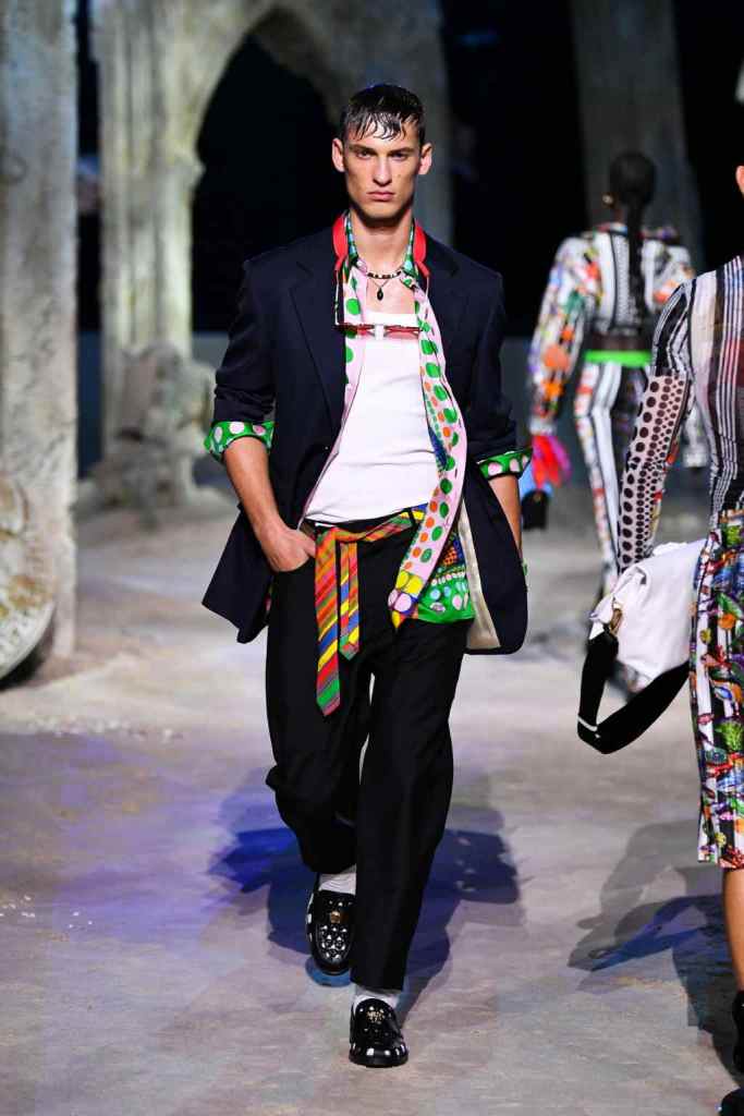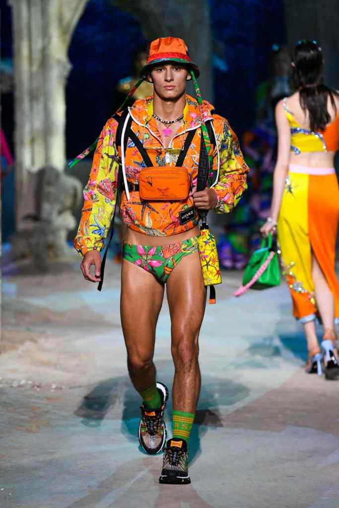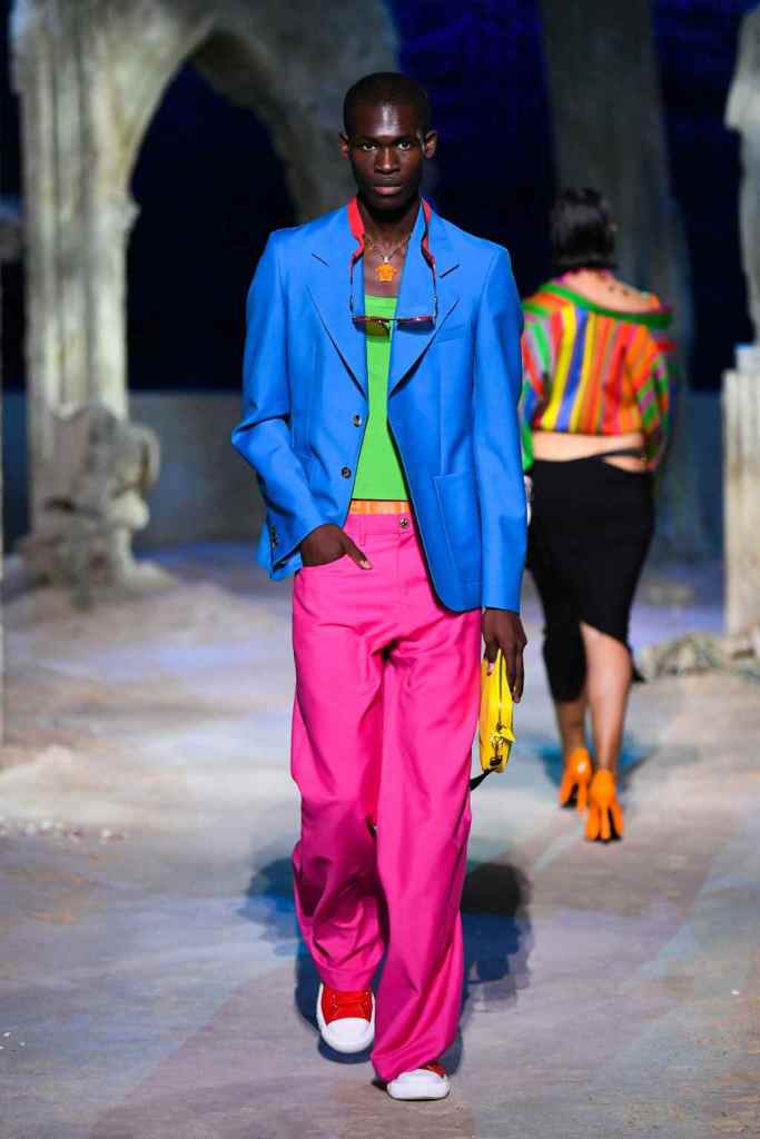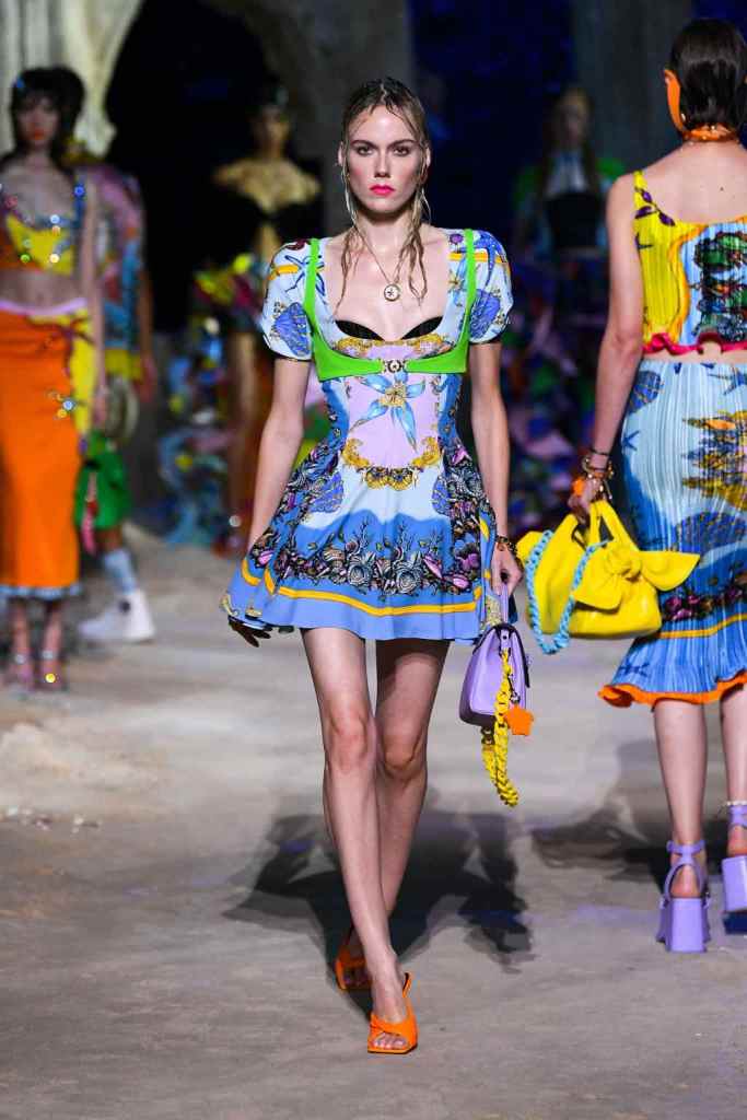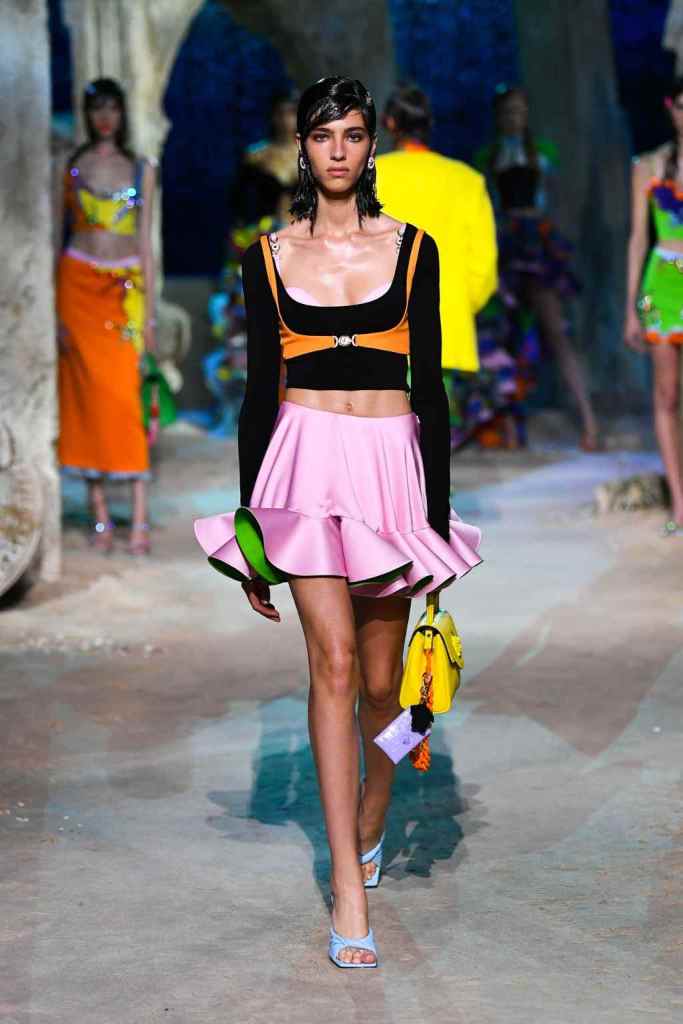 Donatella Versace transformed the runway into a utopian wonderland, the runway was sand covered with Roman pillars ruins transporting us straight into the pages of Greek mythology with aquatic-themed ‘Under the Sea’ visuals. The clothes draw inspiration from the wondrous beauty of the ocean, as evidenced by its collection of dresses and gowns that boast Onda hemlines, taking cues from the ebb and flow of the ocean’s waves. The Trésor de la Mer print from Spring 1992, an emblematic design of the fashion house, also makes a statement in the collection with its striking hues. Ruffles that looked like oceanic movements were adorned on countless dresses and hemlines, starfish brooches, tops reminiscent of scuba diving suits, brightly colored stripes and some sleek mermaid-style midi skirts. From crystal-encrusted bra tops to blinged-out embellishments on sharp black blazers, the shells and starfish motifs were used in a myriad of creative ways, adding a touch of glamour to each outfit.