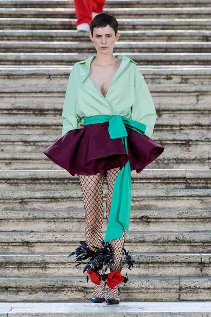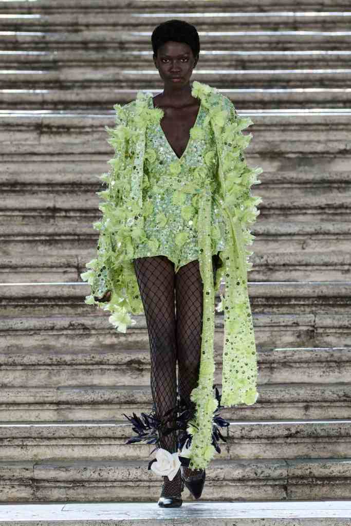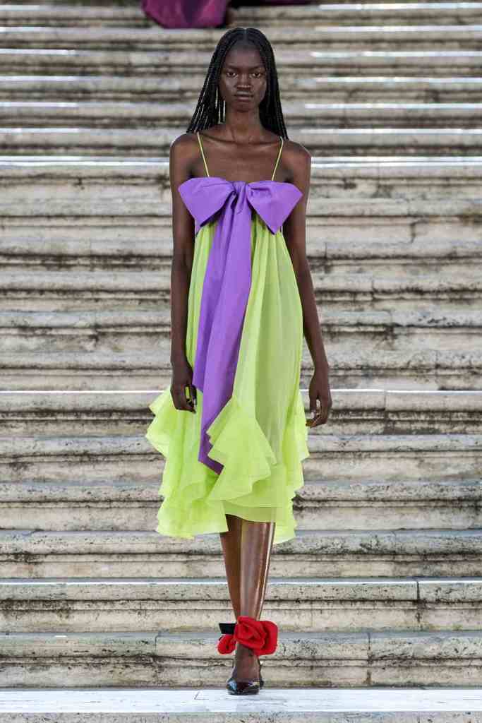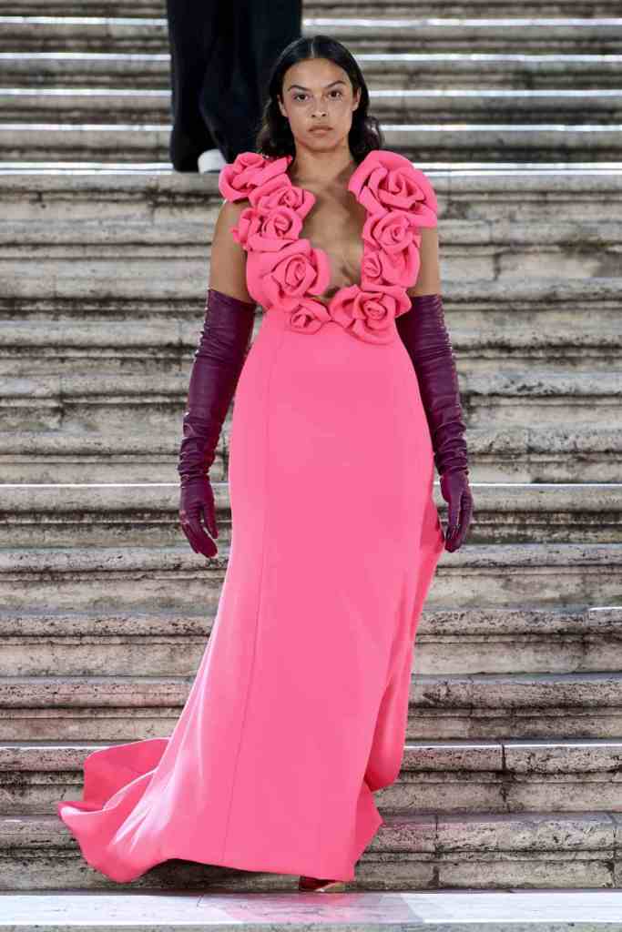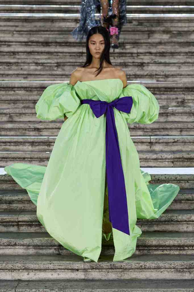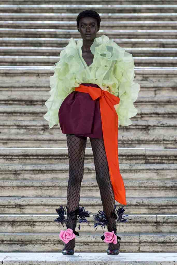 The opening look, a bouncy dance dress with a skirt of silk roses, was inspired by Valentino’s first use of the famous Valentino red in 1959. There were a plethora of elements present, including velvety feathers, enormous roses, flowing sheer fabrics, lux fur, statement bows, shimmering sequins, and voluminous ruffles. Plus, the Phillip Treacy headpieces were a true work of art. The array of colors used in the palette was stunning, featuring magnificent shades of magenta, lime green, violet, teal, bright cyan, deep red, and countless shades of pink. Piccioli’s wish to democratize fashion was also evident in the inclusive casting. Although the number of looks could have been reduced slightly to give each piece the attention it deserved.