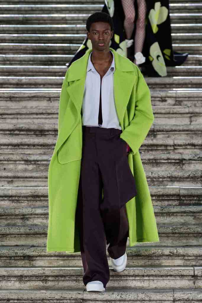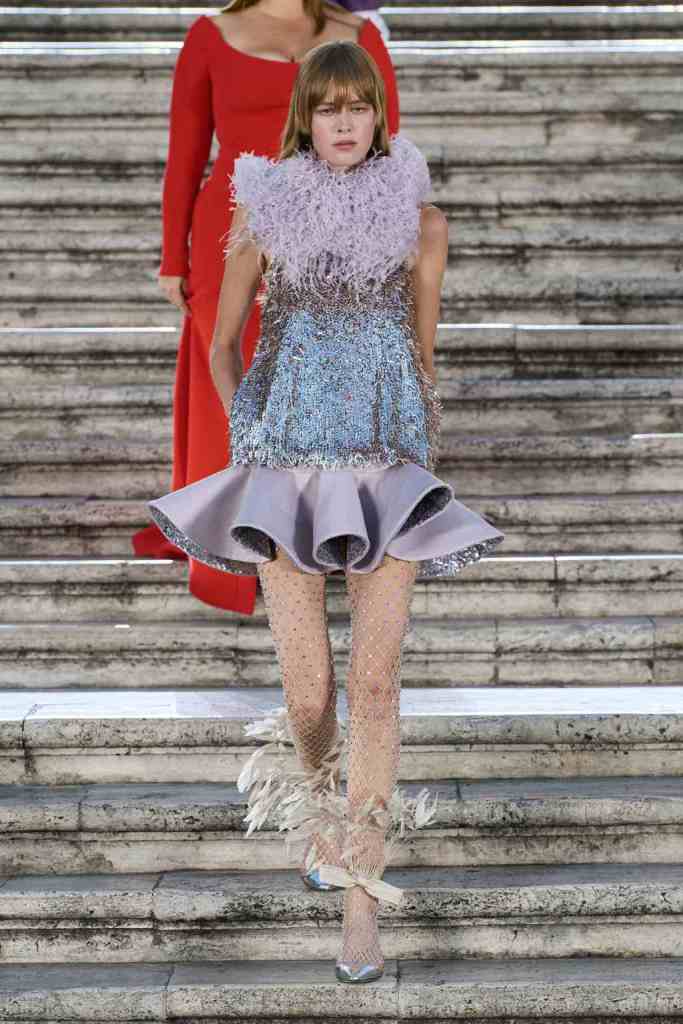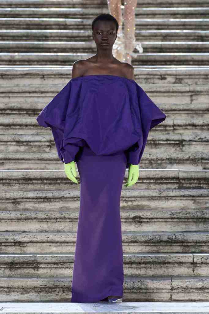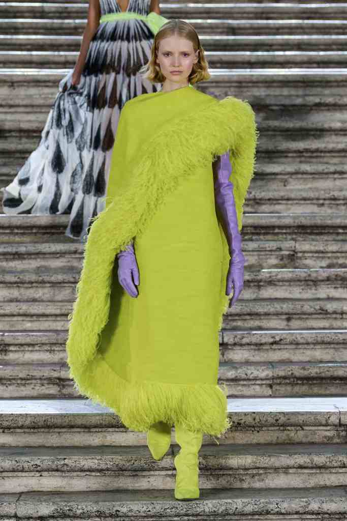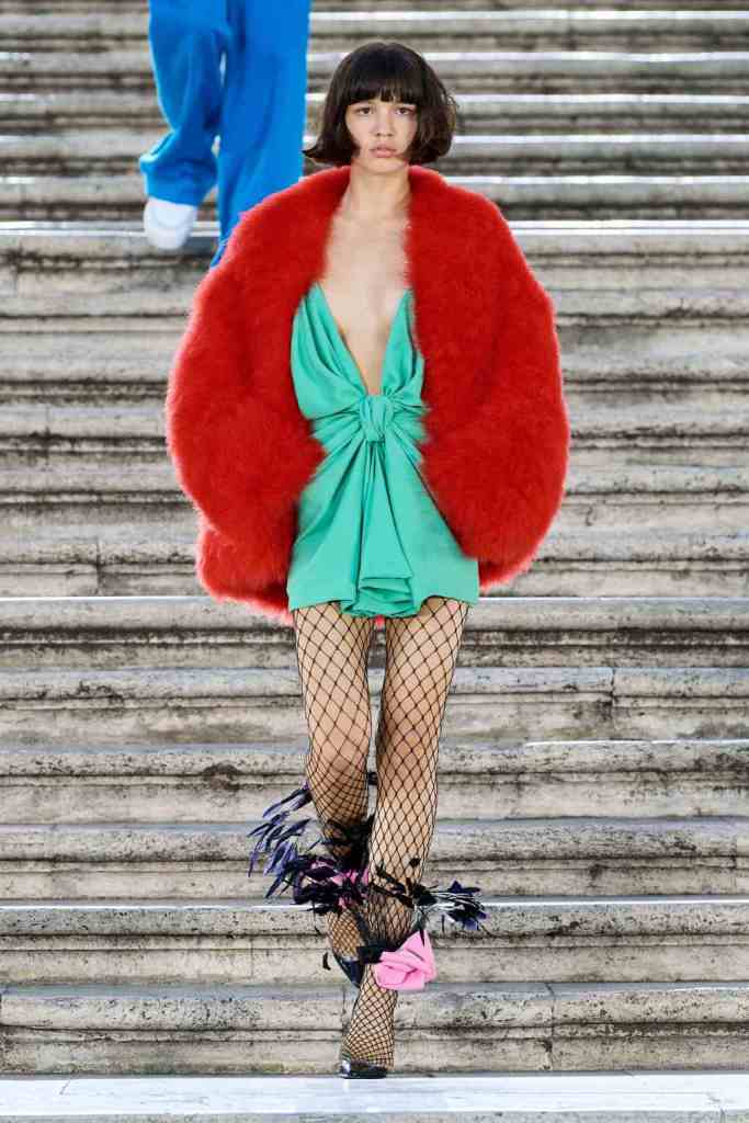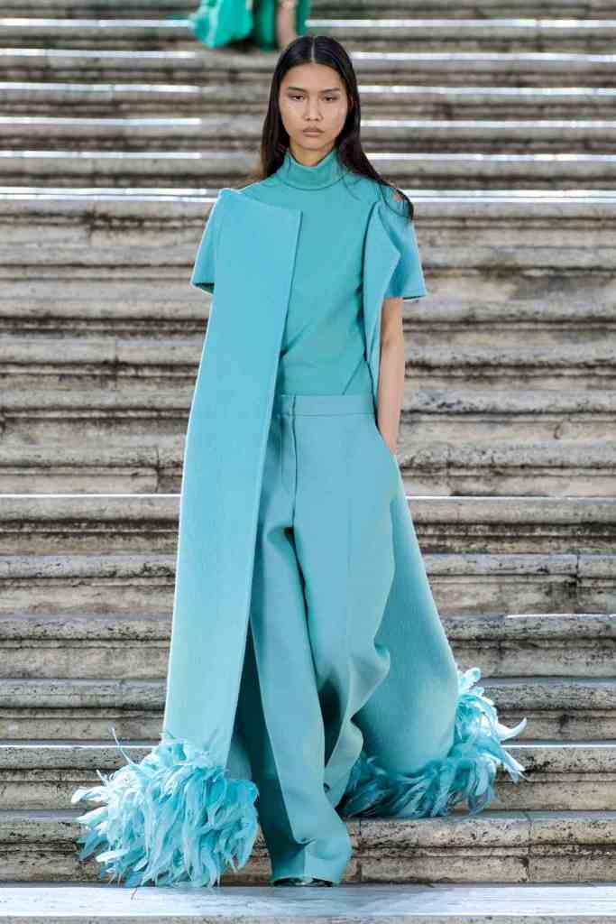 The opening look, a bouncy dance dress with a skirt of silk roses, was inspired by Valentino’s first use of the famous Valentino red in 1959. There were a plethora of elements present, including velvety feathers, enormous roses, flowing sheer fabrics, lux fur, statement bows, shimmering sequins, and voluminous ruffles. Plus, the Phillip Treacy headpieces were a true work of art. The array of colors used in the palette was stunning, featuring magnificent shades of magenta, lime green, violet, teal, bright cyan, deep red, and countless shades of pink. Piccioli’s wish to democratize fashion was also evident in the inclusive casting. Although the number of looks could have been reduced slightly to give each piece the attention it deserved.