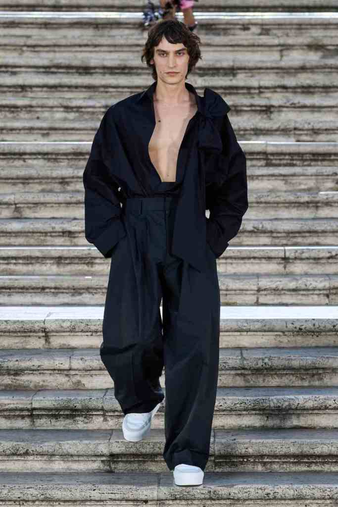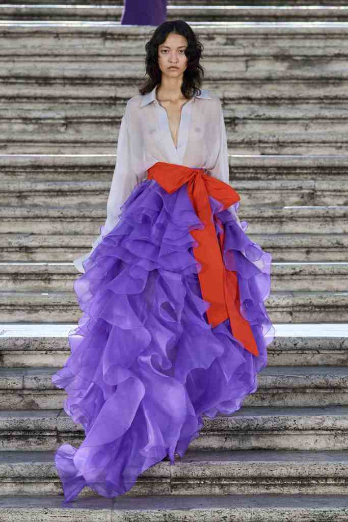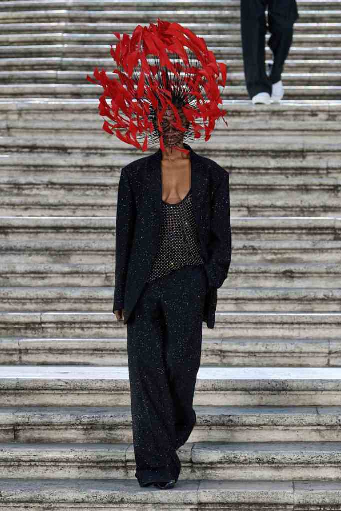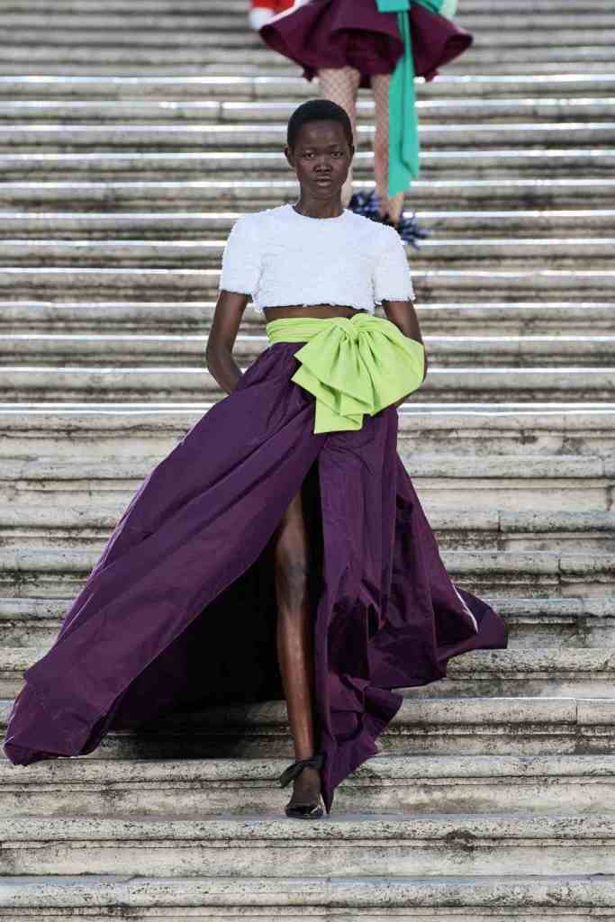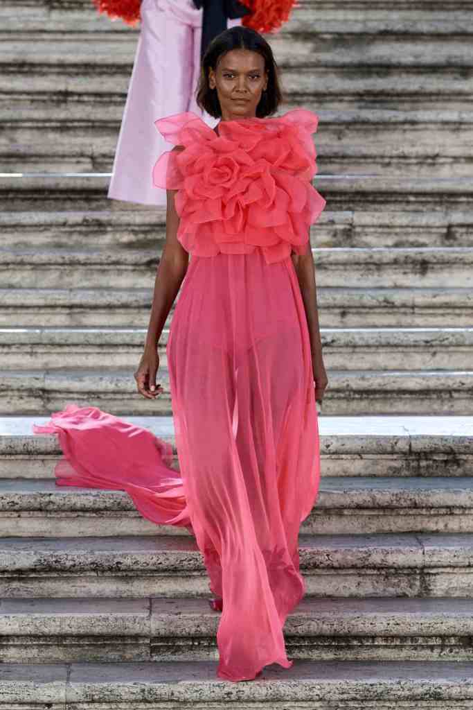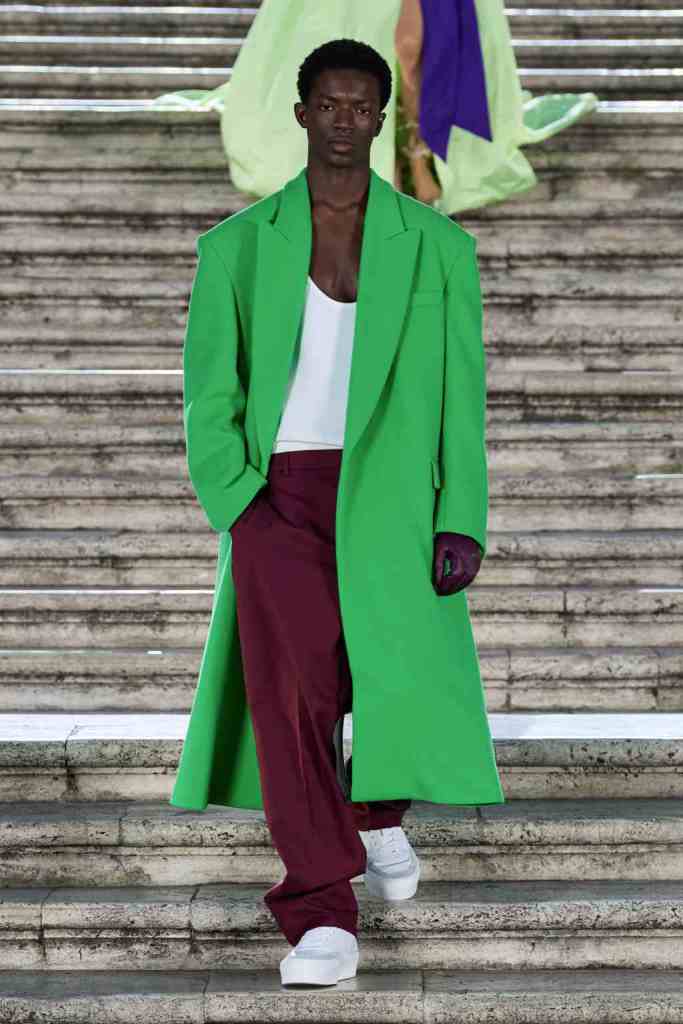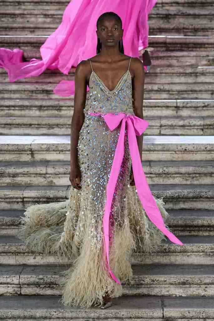 As the sun set behind the Roman landmark, models adorned in Pierpaolo Piccioli’s vivid ethereal couture descended the Spanish Steps while Labrinth performed. Pierpaolo Piccioli paid homage to the brand’s 63-year history with a sprawling 103-look collection titled “Valentino The Beginning,” presented on the Spanish Steps. The Italian sunsets and the beautiful Spanish architecture served as the perfect backdrop.