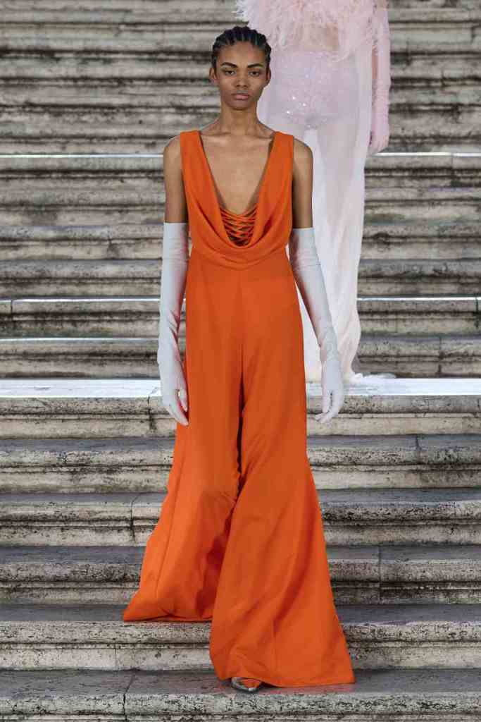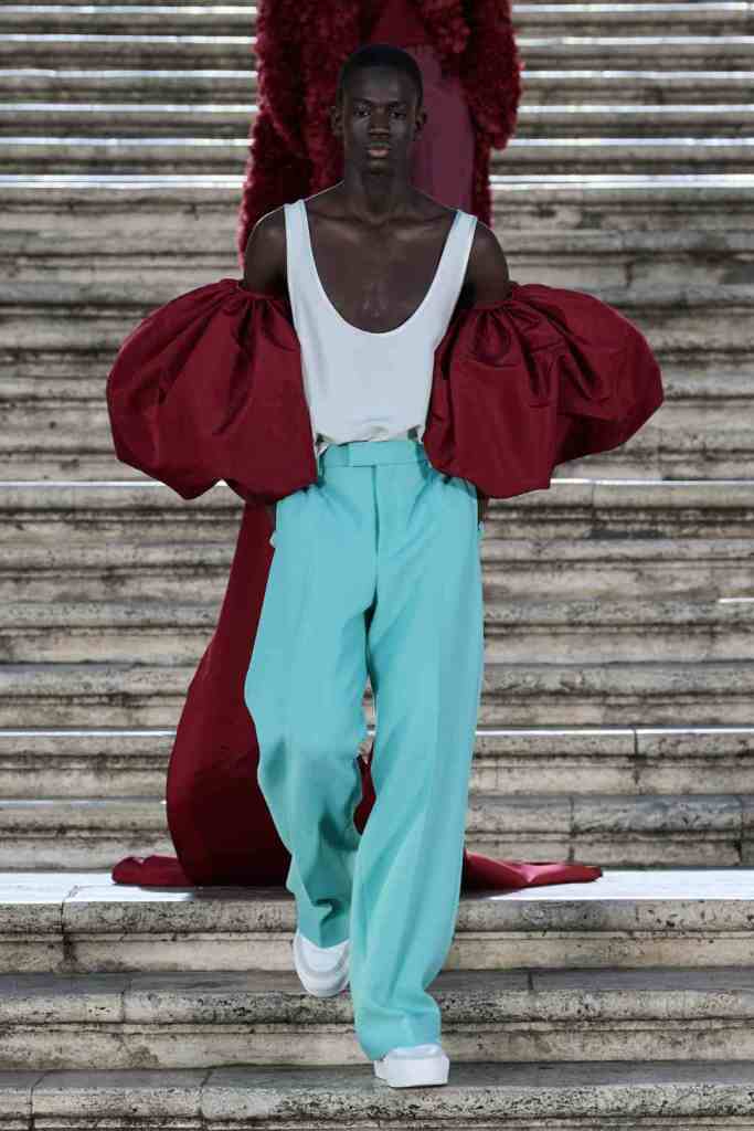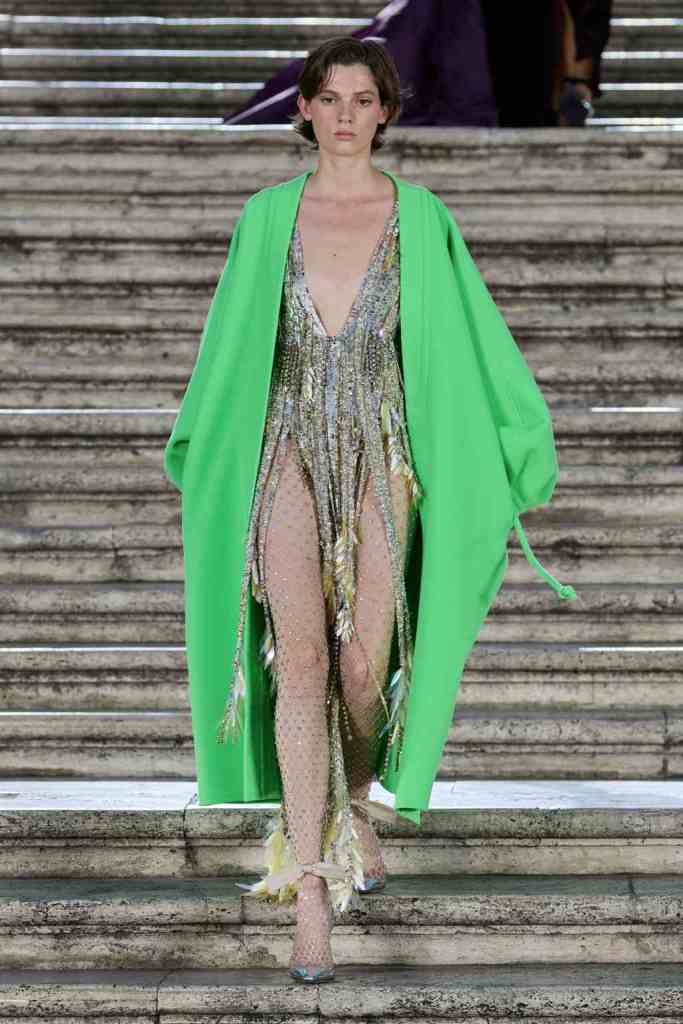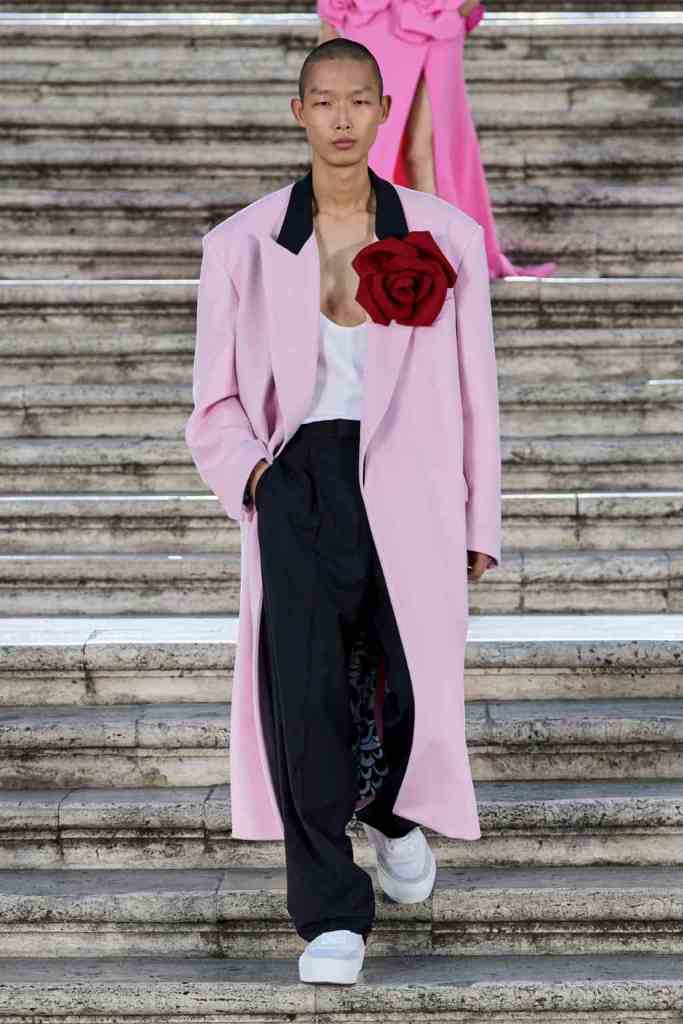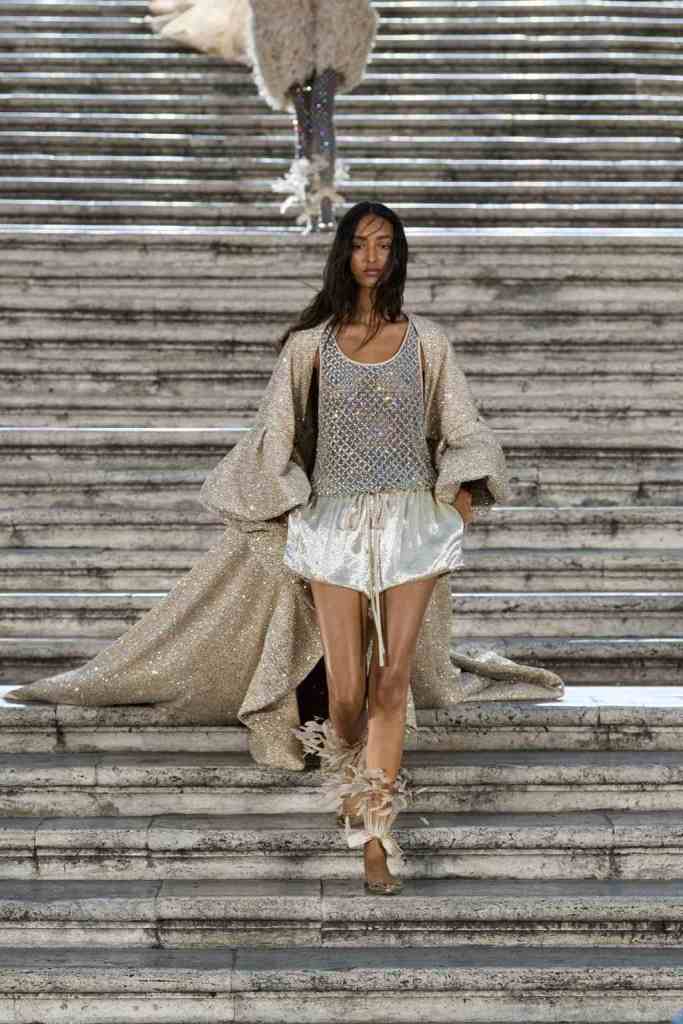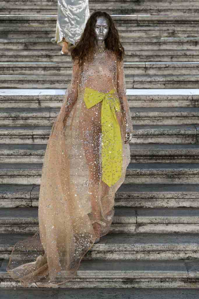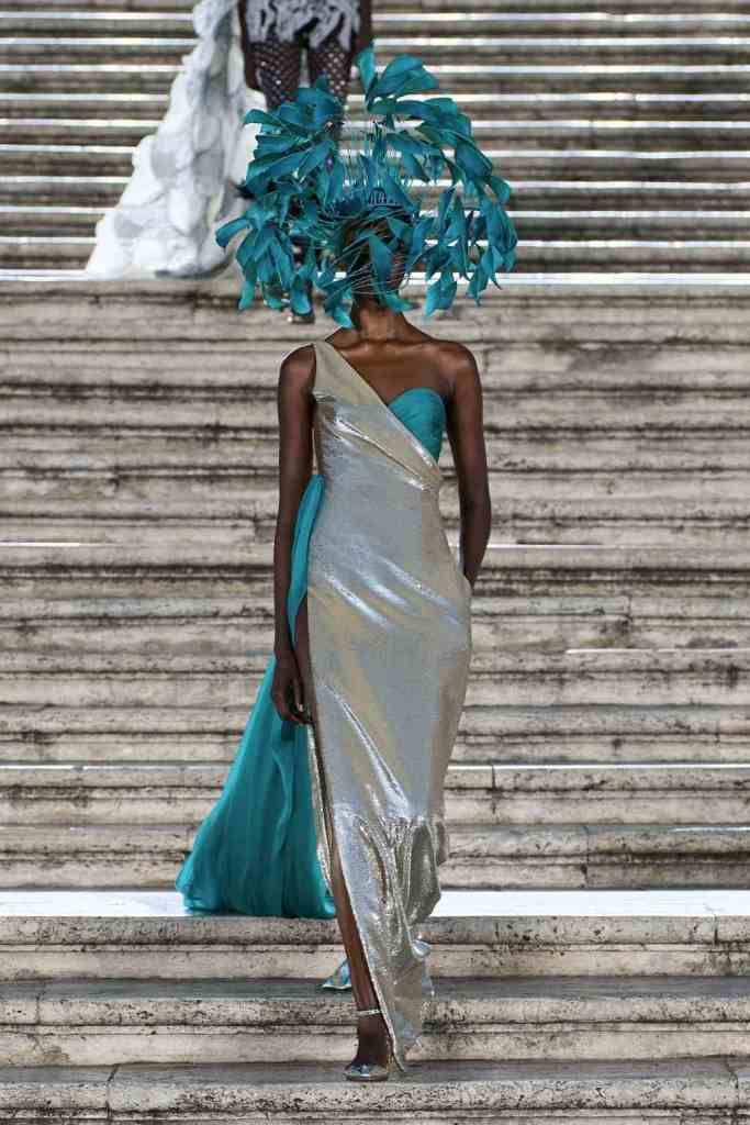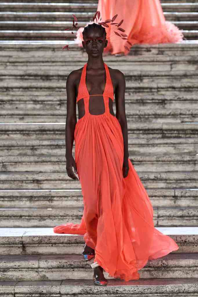 As the sun set behind the Roman landmark, models adorned in Pierpaolo Piccioli’s vivid ethereal couture descended the Spanish Steps while Labrinth performed. Pierpaolo Piccioli paid homage to the brand’s 63-year history with a sprawling 103-look collection titled “Valentino The Beginning,” presented on the Spanish Steps. The Italian sunsets and the beautiful Spanish architecture served as the perfect backdrop.