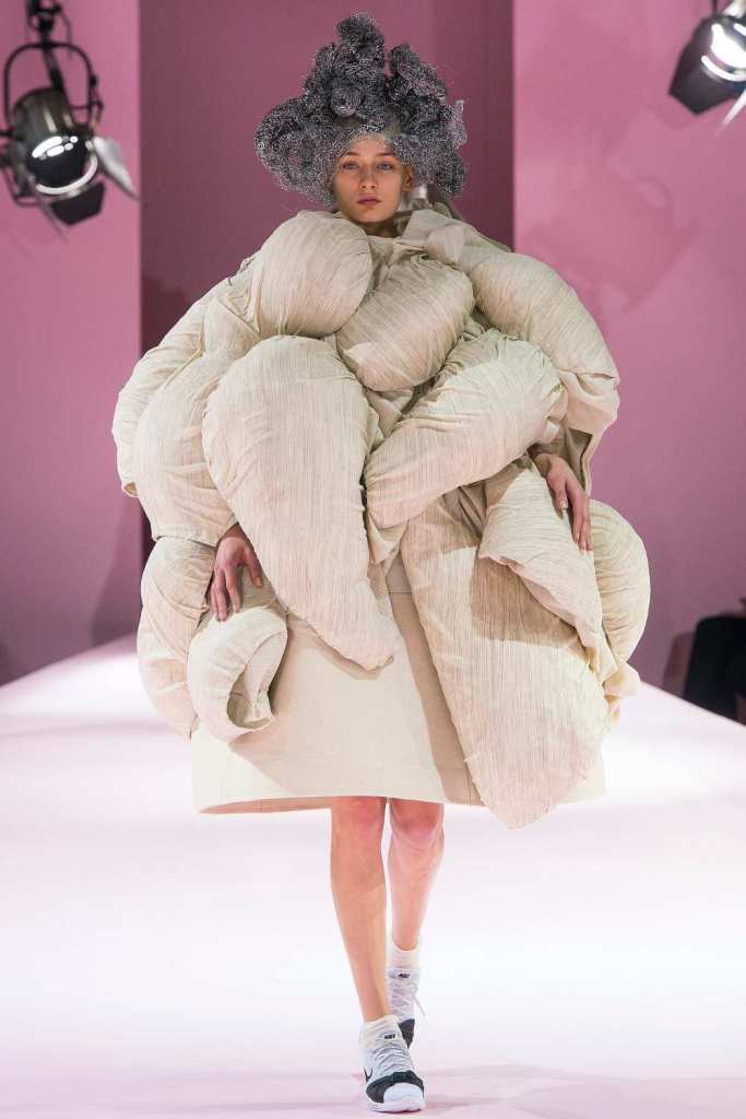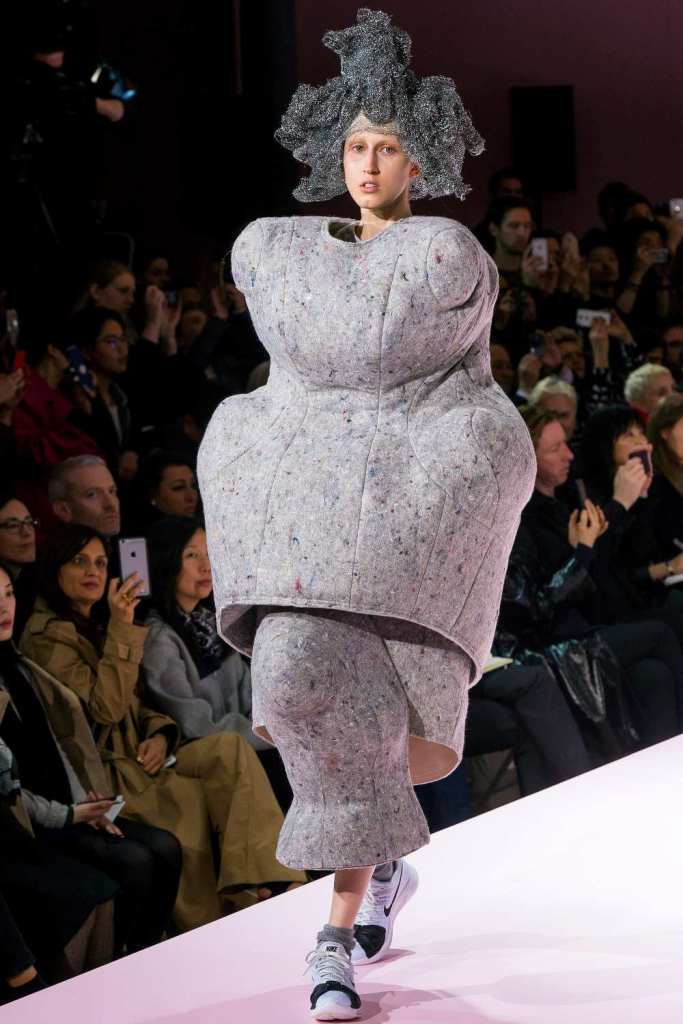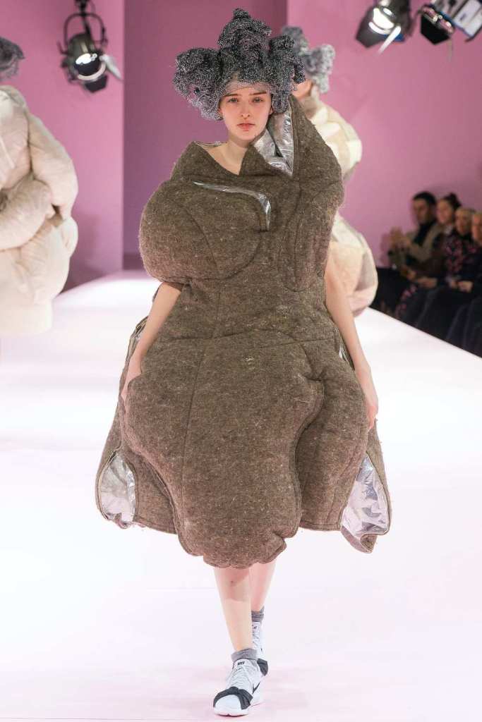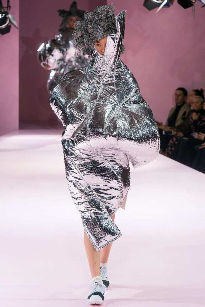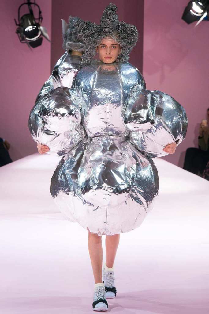 The collection was an explosion of creativity, featuring out-of-the-box shapes and textures, with no boundaries. The garments featured diverse materials including recycled fabrics, lace, furnishing fabrics, brown paper bags and silver insulation material. Models walked in a seemingly disoriented manner, emphasizing the avant-garde nature of the collection.