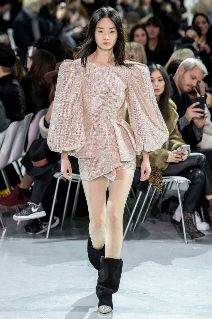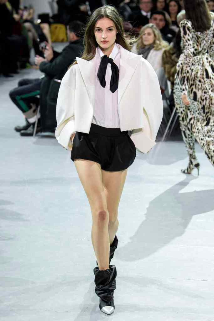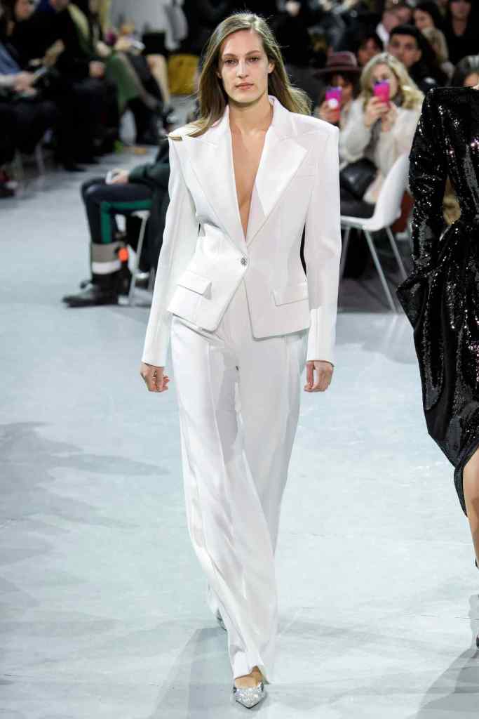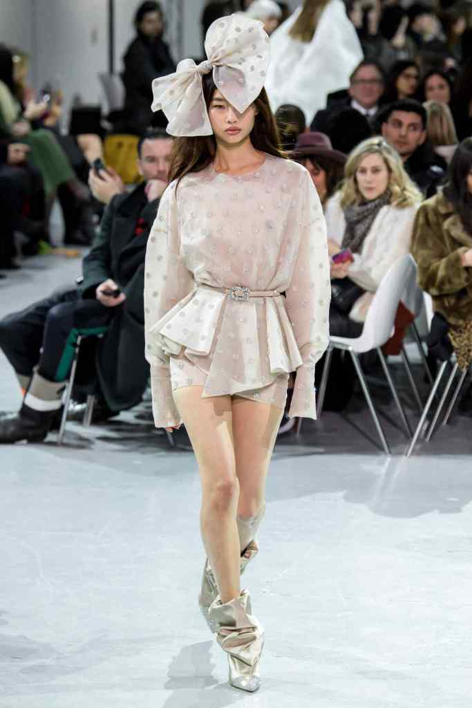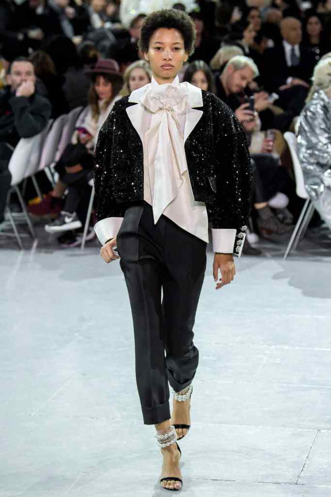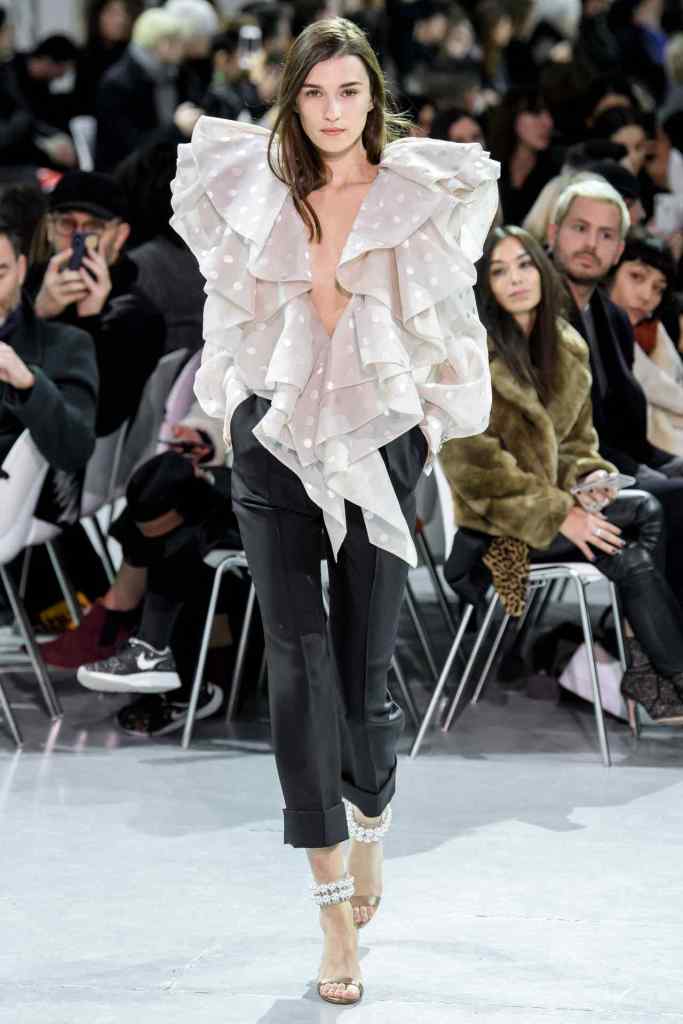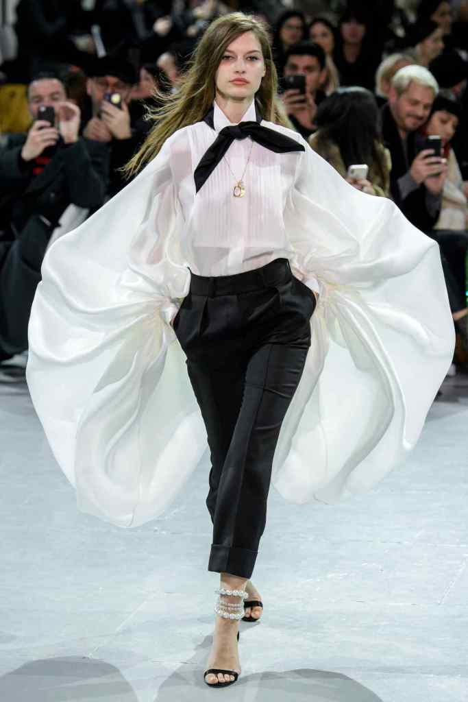 Vauthier’s collection embodies French glamour with a focus on allure, tailoring and balance between restraint and glamour. The silhouettes range from 60s-inspired styles balancing masculine and feminine accents. Ruffles, bows and scarfs were used for detailing throughout the collection. The collection also features a more fluid and sensual silhouette inspired by Françoise Hardy, with sharply tailored pantsuits. Dramatic glamour bodysuits also make their mark in this collection. A white satin button-down with massively billowing sleeves remains one of my favorite pieces to date along with a striking green shimmery dress with coordinated boots. For me, this collection was a turning point in Vauthier’s trajectory; this collection solidified his contemporary unique take on traditional French glam.