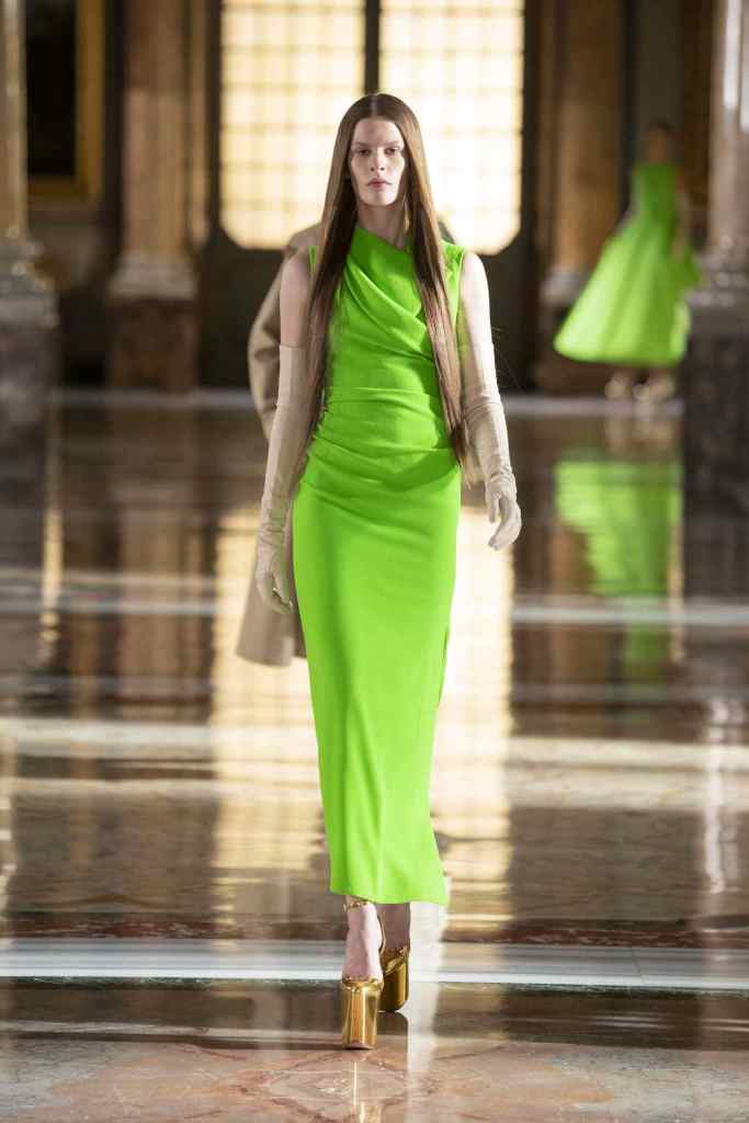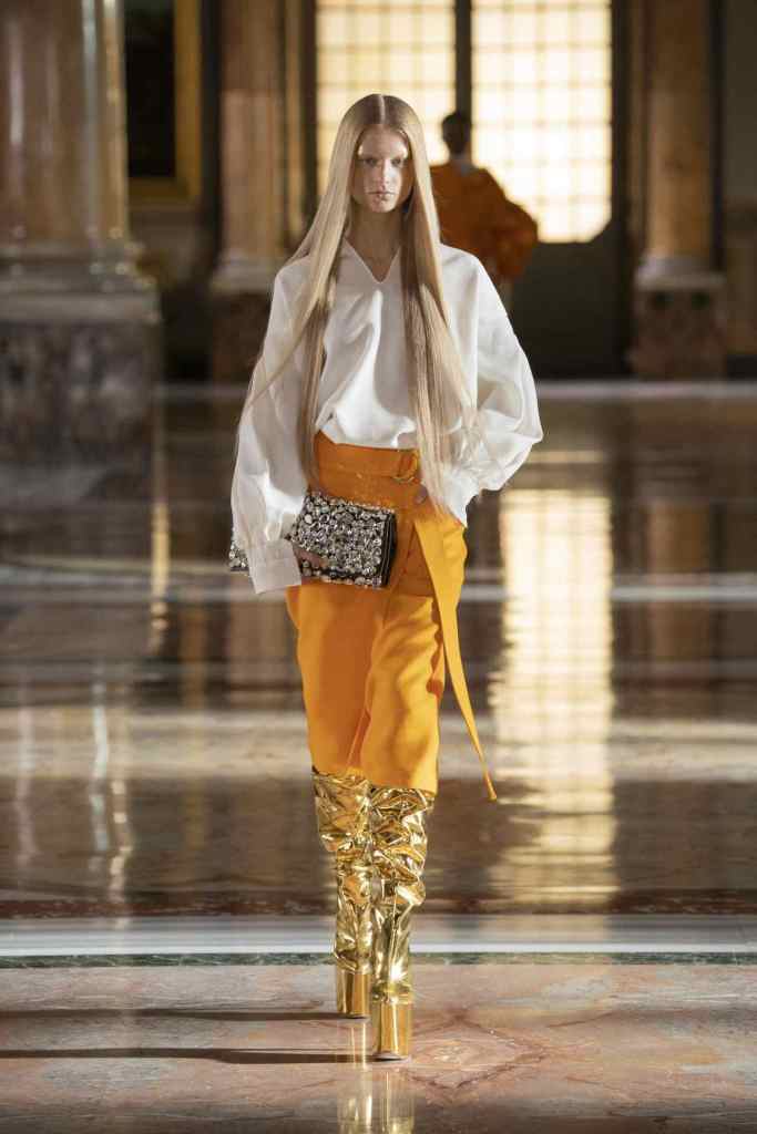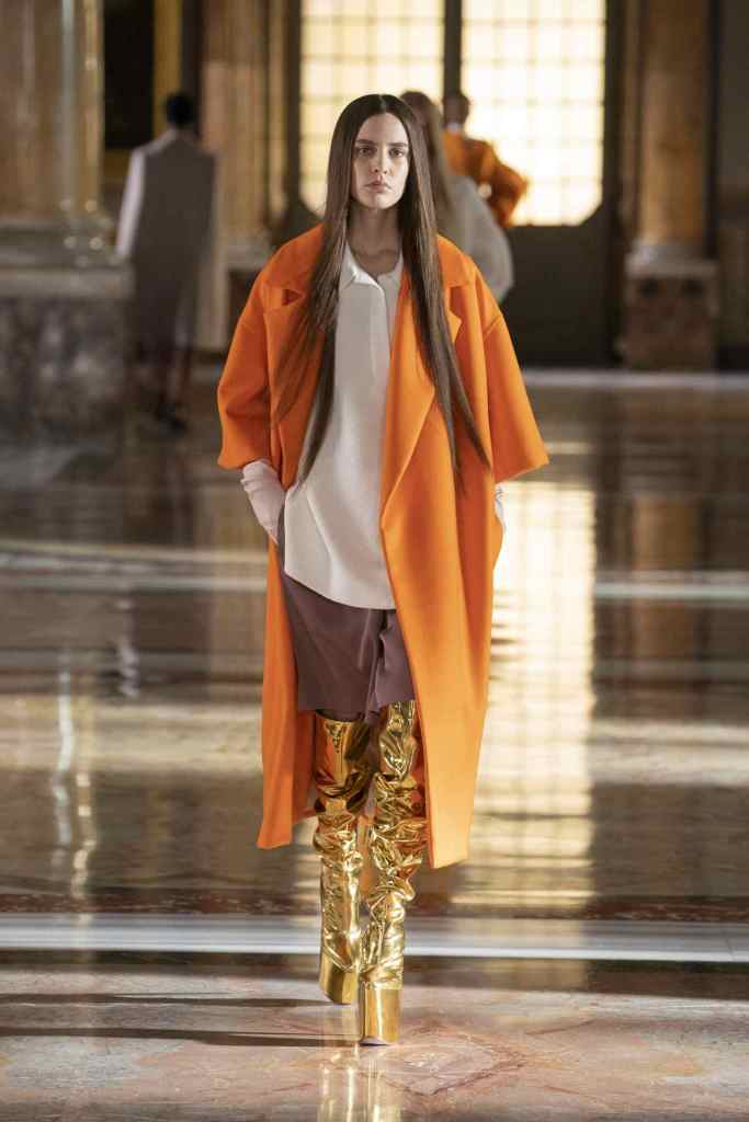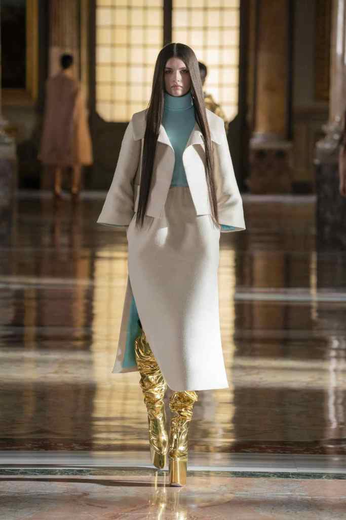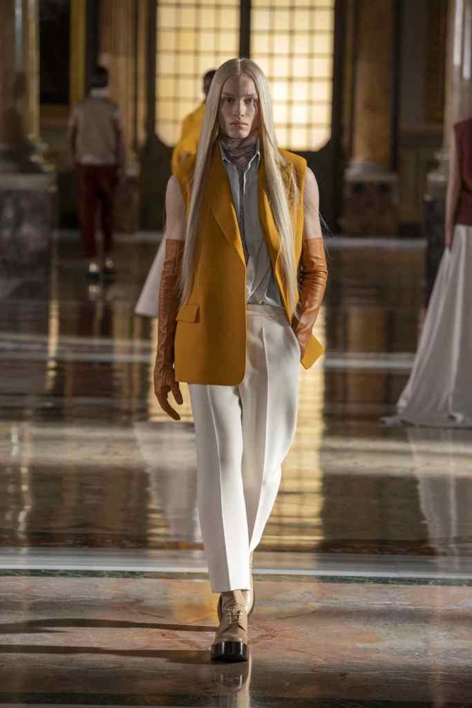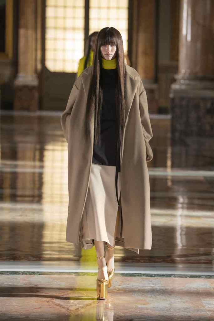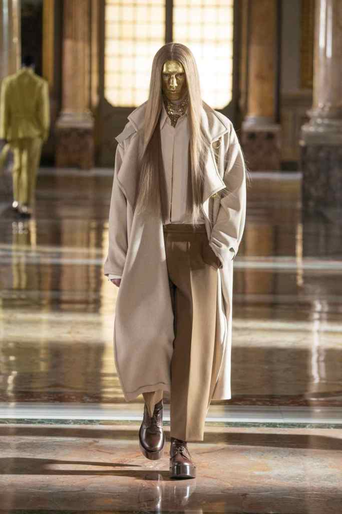 The clothes showcased emphasized big, boxy outer layers that contrasted with softer pieces, giving a couture feel to everyday wear. The collection featured muted beige and brown tones with pops of neon – vivid colors shielded by neutrals. The tailored trenches, jackets, and tailored trenches flowed together seamlessly, creating chic silhouettes completed with gold faces by Pat McGrath and towering metallic platform heels. The garments used gentle and luxurious fabrics and designed in spacious shapes. The collection also marked the first time Valentino has showcased couture for men – it was delicious!