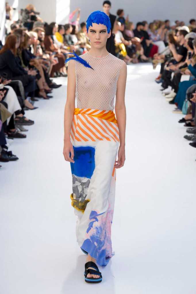 Dries Van Noten captures the delicate balance between minimalism and fantasy – vibrant colors and abstract florals take center stage, complemented by an off-duty tailoring foundation. Neutral bases create a canvas for bold colors – From vibrant yellow to deep purple, the colors were electrifying. Dries brings practicality without sacrificing style with gentle cottons and opulent silks. With a foundation of neutrals, he adds b delicate florals and striking stripes reminiscent of couture, creating contemporary everyday classics. Exquisite embellishments played with western fringing and micro-beading, while prints disrupted commercial florals with hand-painted strokes. The Dries woman envisions a future full of hope and embraces the quiet revolution it brings