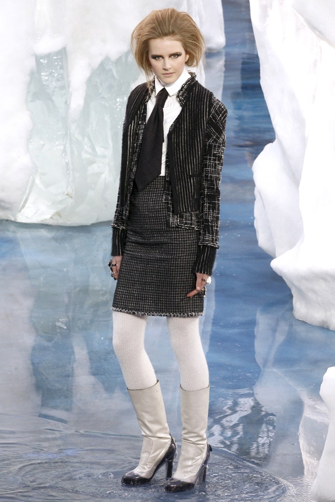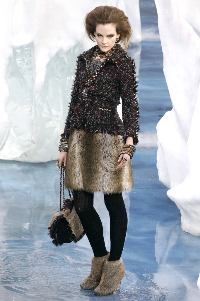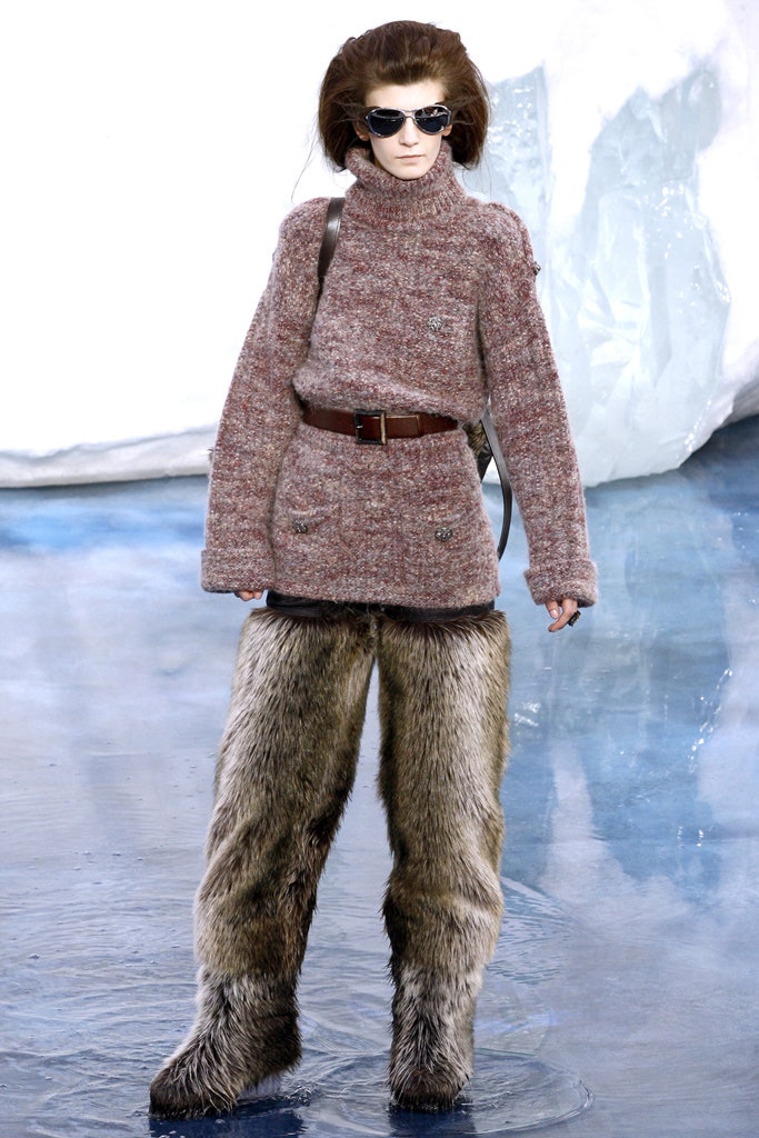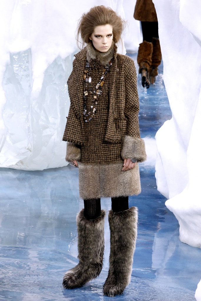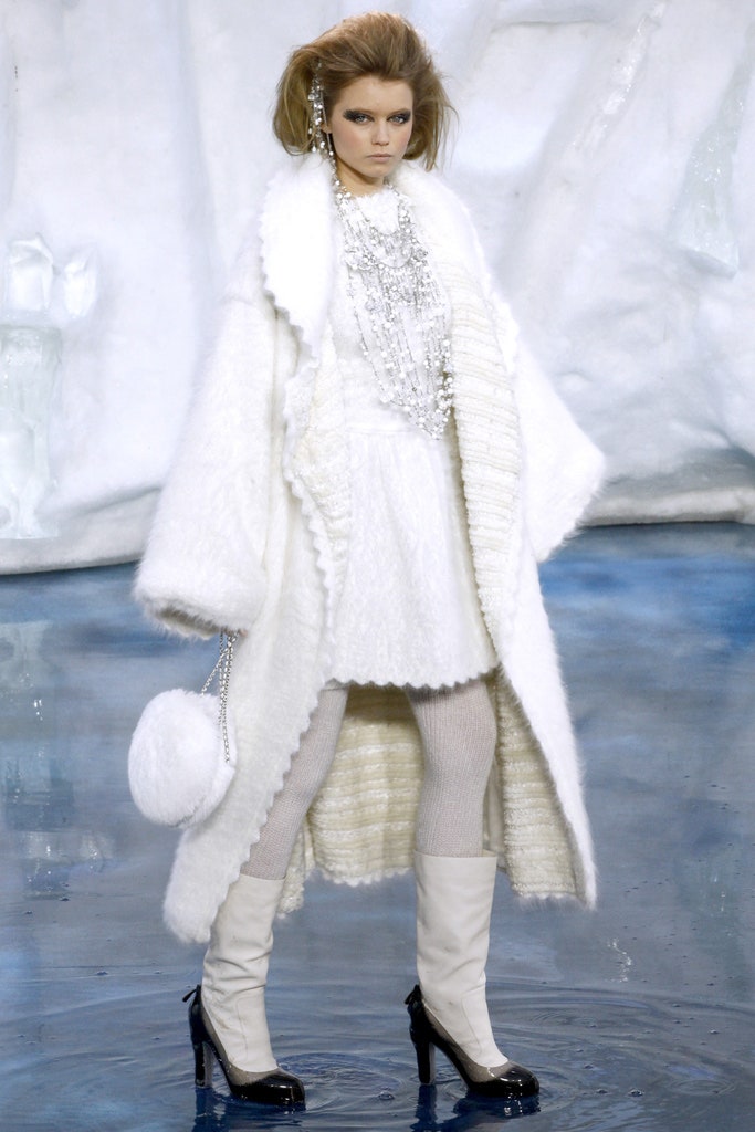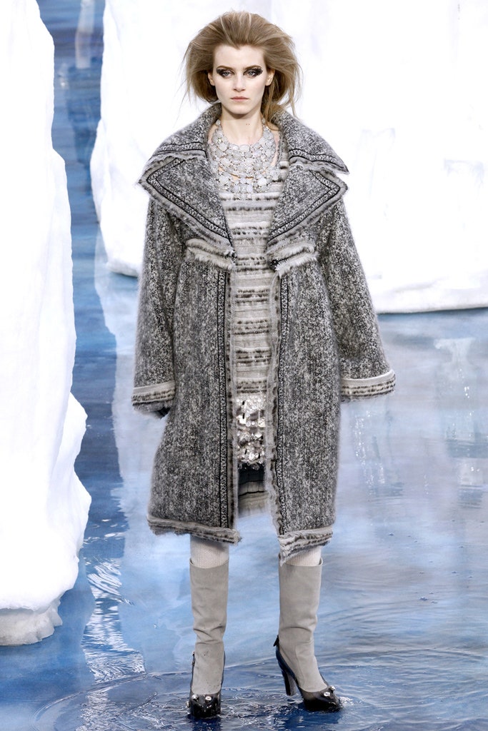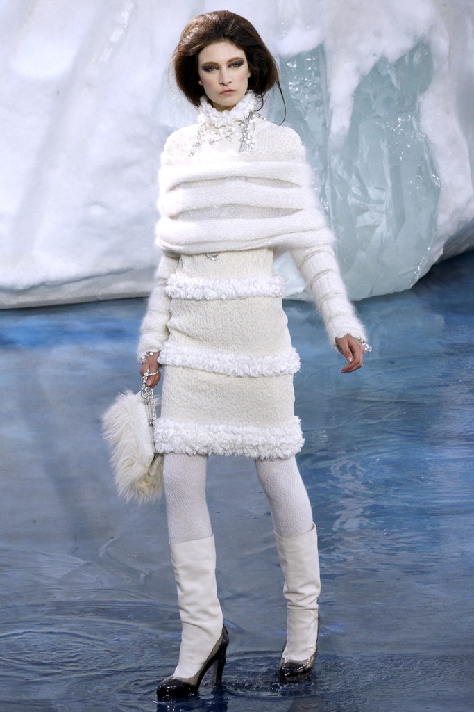 The clothes were pure Snowtastic Chic! Karl Lagerfeld spared no expense when it came to orchestrating a Chanel runway, effortlessly blurring the lines between reality and fantasy. In his signature style, he breathes life into the clothes’ with a mesmerizing set; this time it’s a colossal 28-foot-tall, 265-ton iceberg from Sweden standing resolute in the centre.