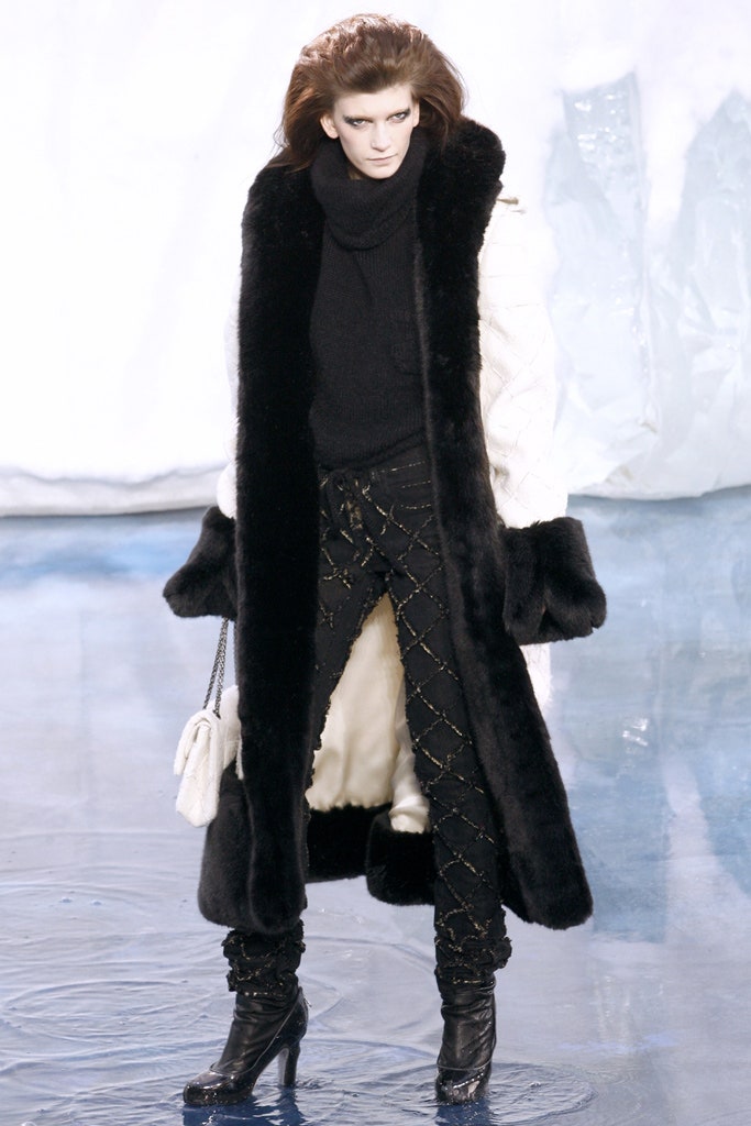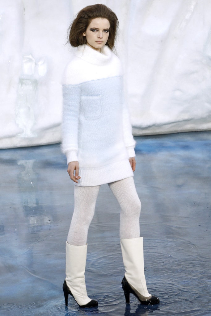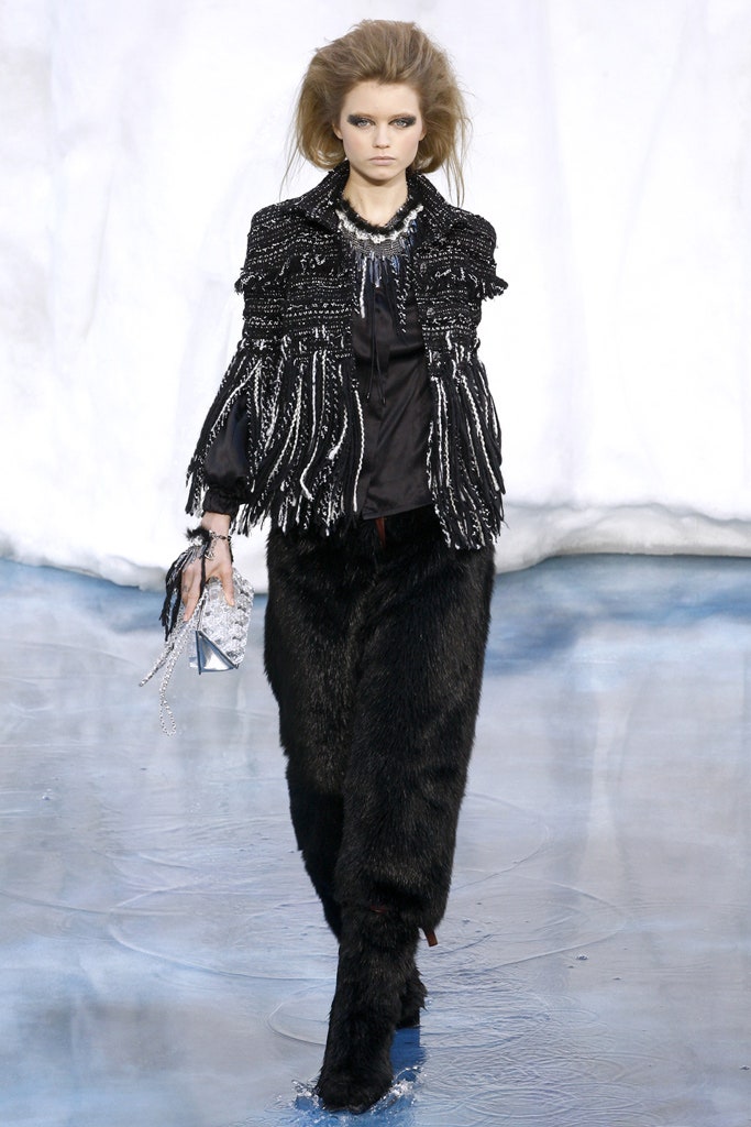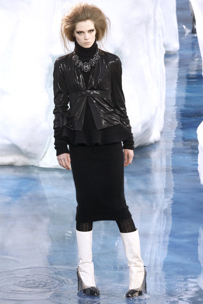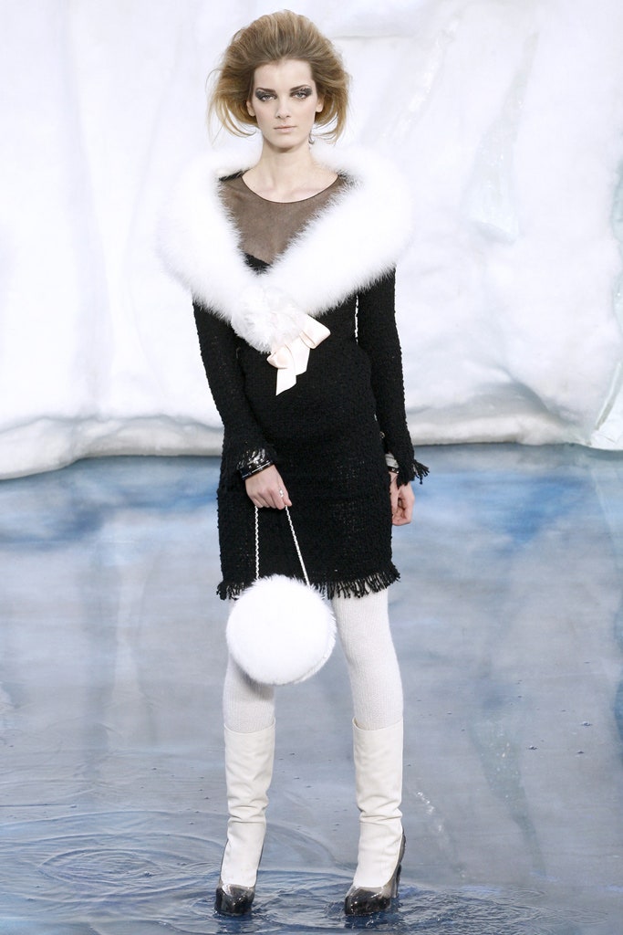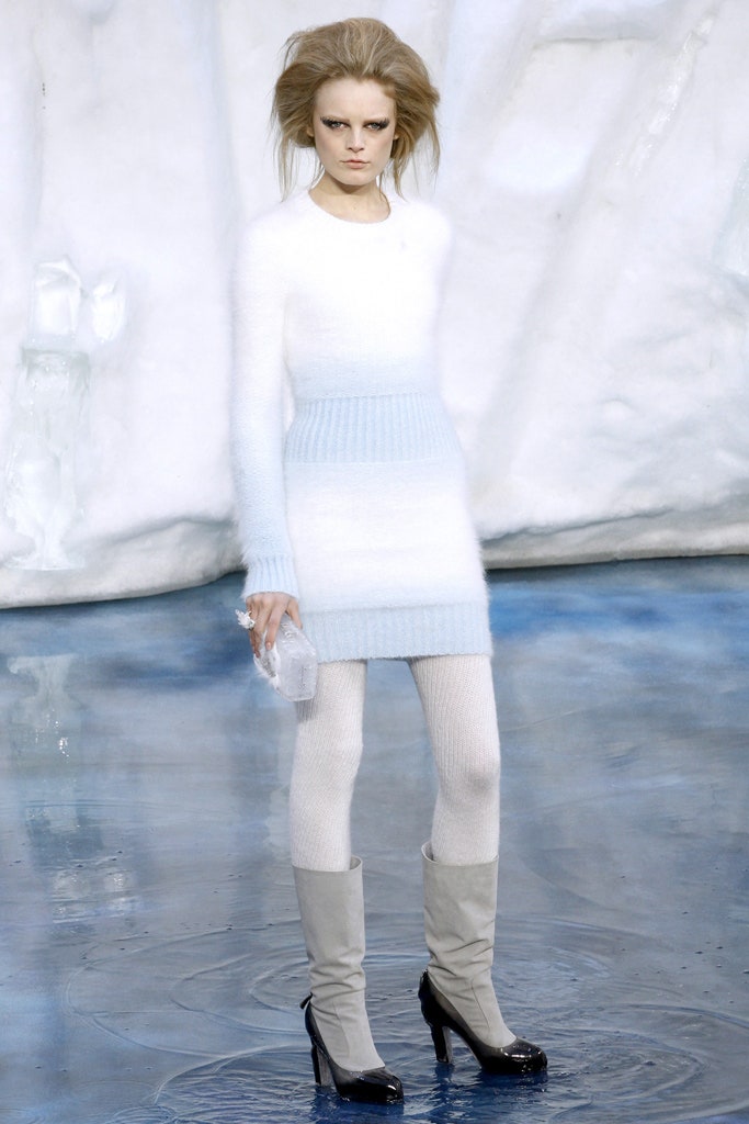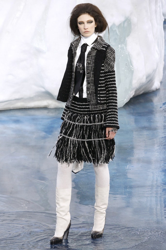 The clothes were pure Snowtastic Chic! Karl Lagerfeld spared no expense when it came to orchestrating a Chanel runway, effortlessly blurring the lines between reality and fantasy. In his signature style, he breathes life into the clothes’ with a mesmerizing set; this time it’s a colossal 28-foot-tall, 265-ton iceberg from Sweden standing resolute in the centre.