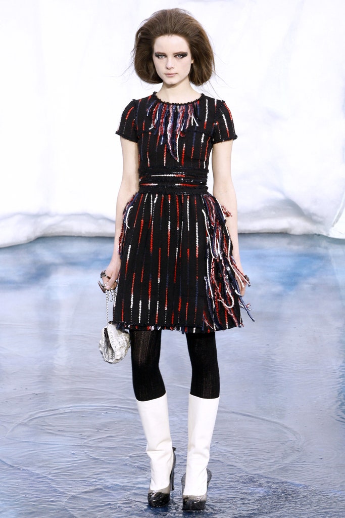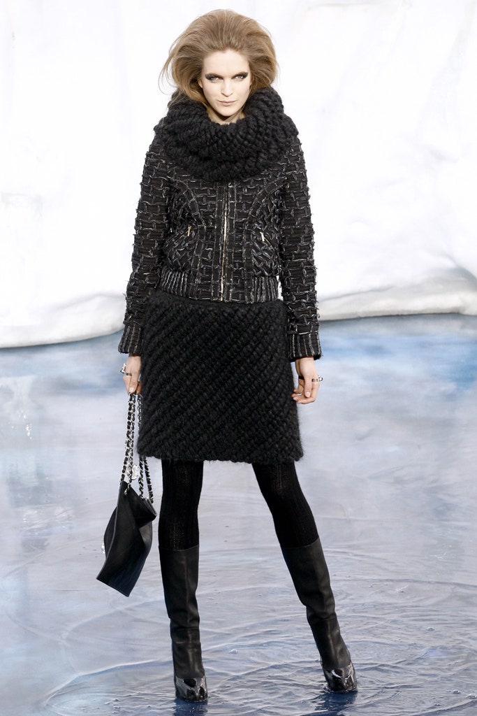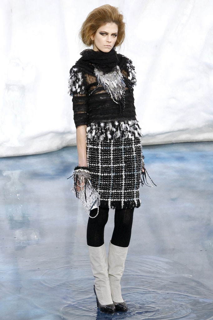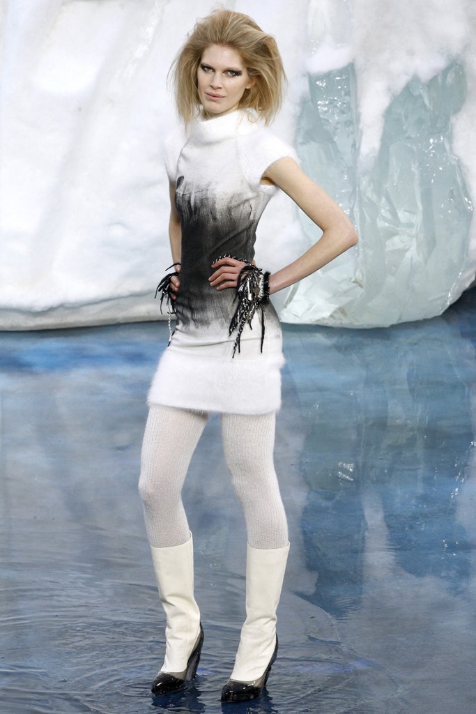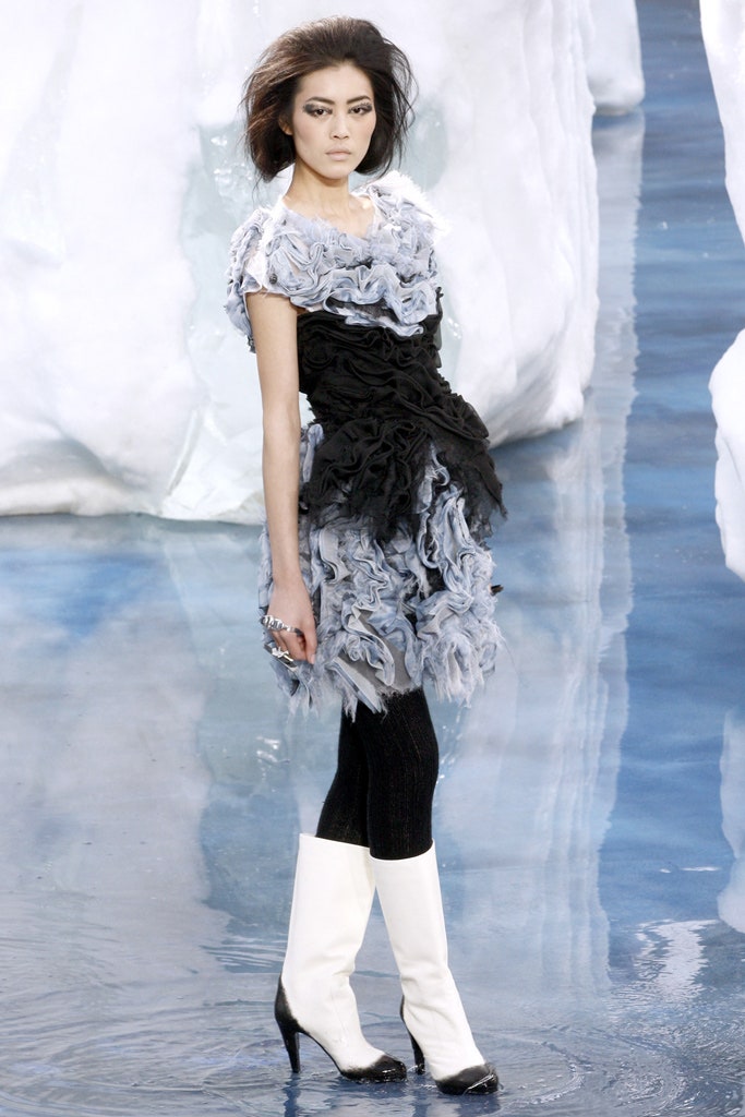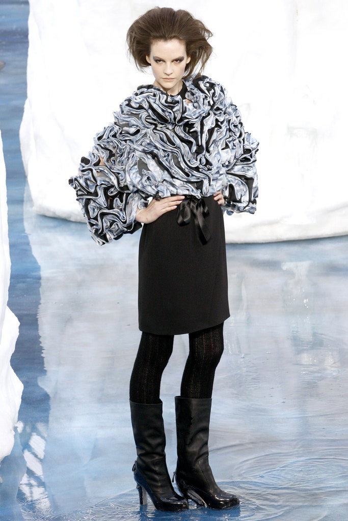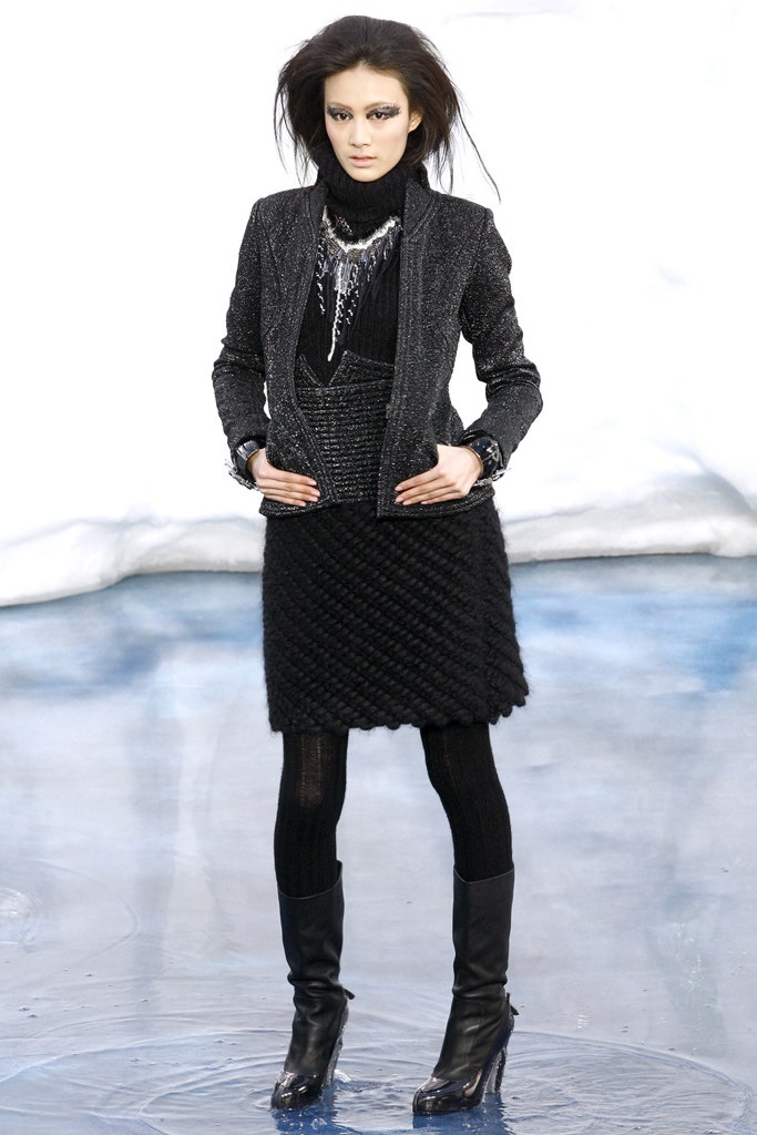 The clothes were pure Snowtastic Chic! Karl Lagerfeld spared no expense when it came to orchestrating a Chanel runway, effortlessly blurring the lines between reality and fantasy. In his signature style, he breathes life into the clothes’ with a mesmerizing set; this time it’s a colossal 28-foot-tall, 265-ton iceberg from Sweden standing resolute in the centre.