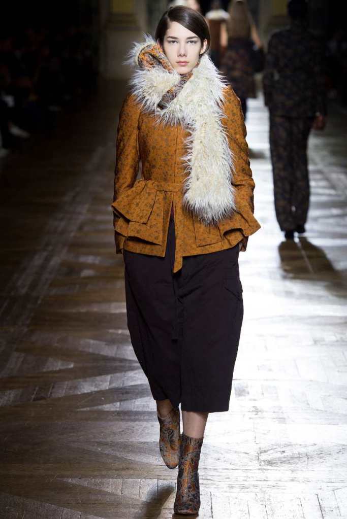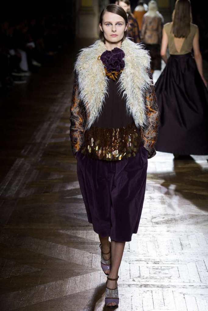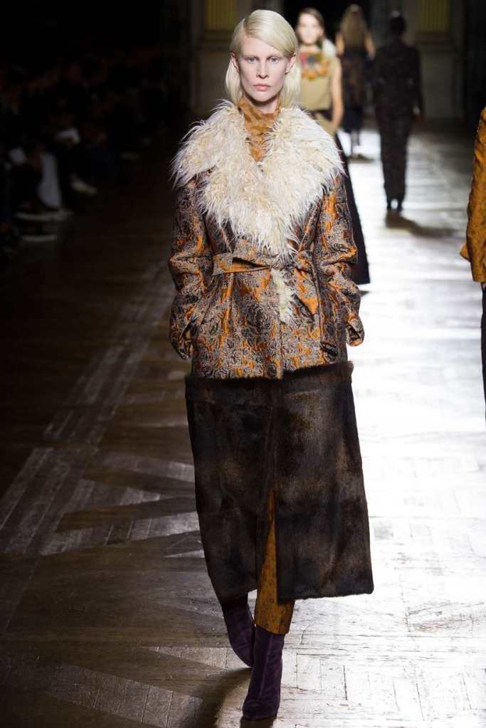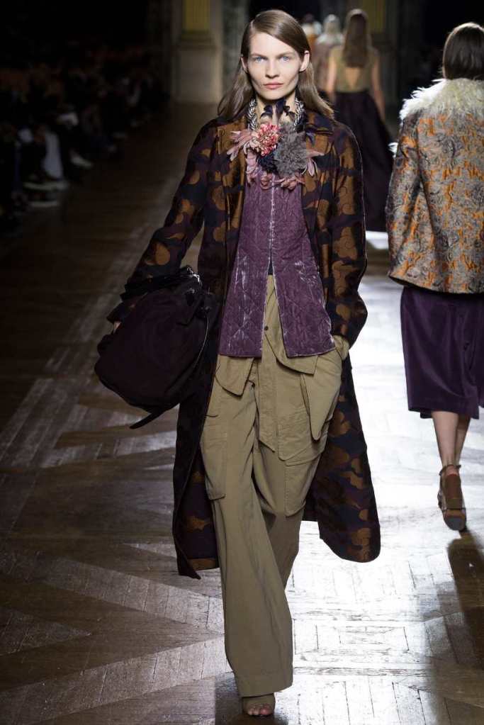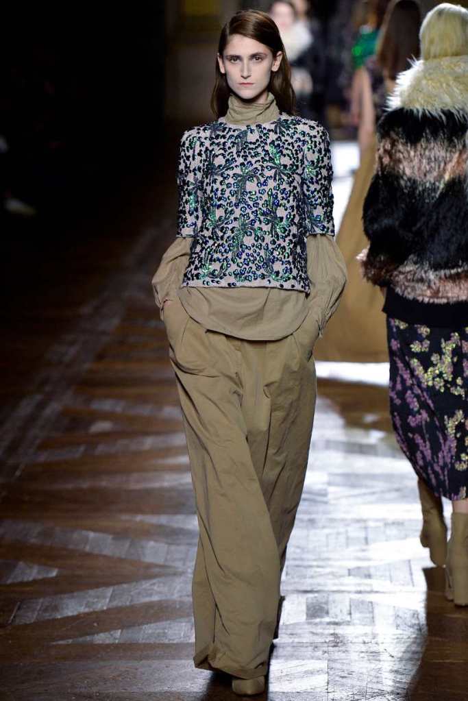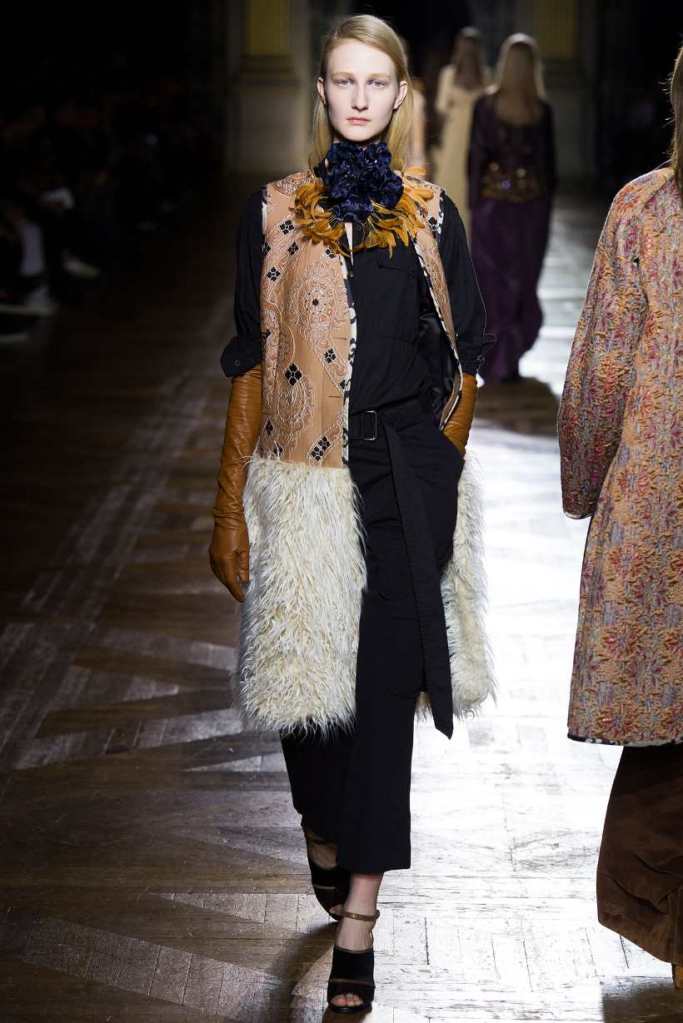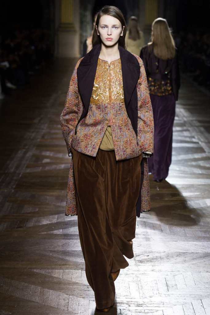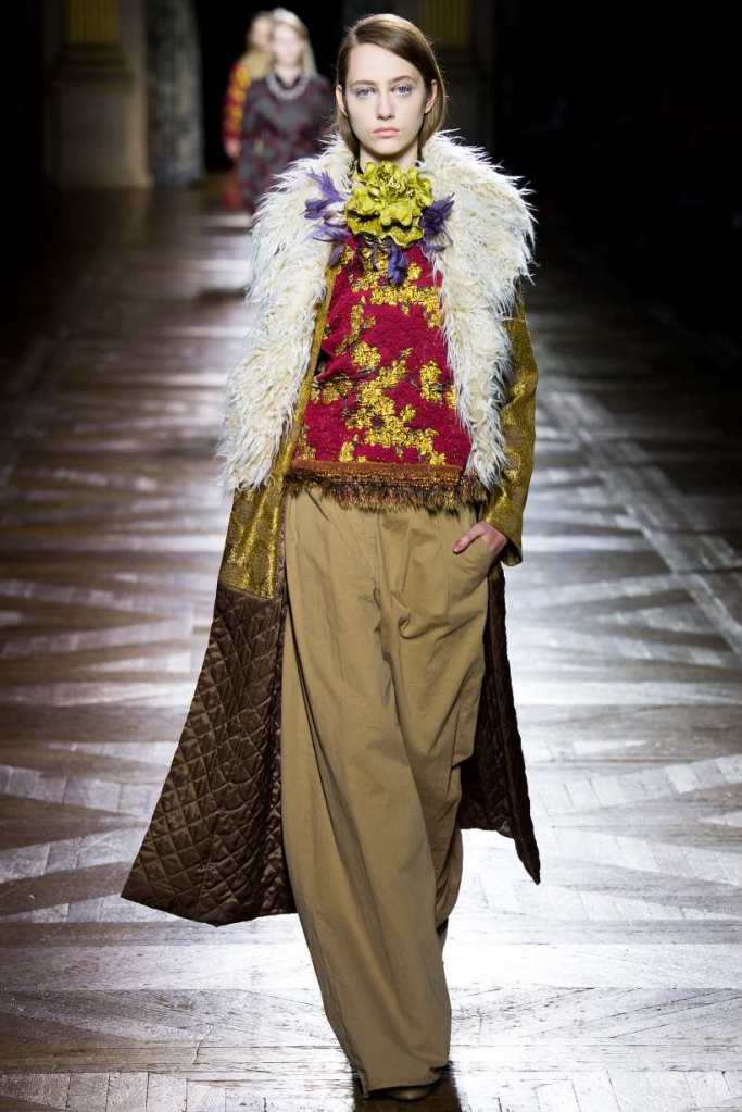 Luxe Bohemia at its finest, with gilding, brocade, and sequins elevating glamour while chinos and baggy shorts grounded the looks. The rich brocades, khakis, and faux furs created an opulent ambiance, while roomy silhouettes comforted the feminine form. With grounded glamour as its motto, the collection exuded eclectic warmth, layering surprising elements in signature style. The Orientalia influence harkened back to Van Noten’s early triumphs, yet he deftly remodeled the past with sheer power and empowerment.