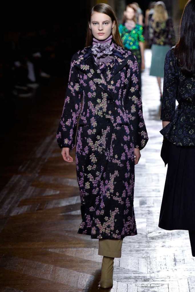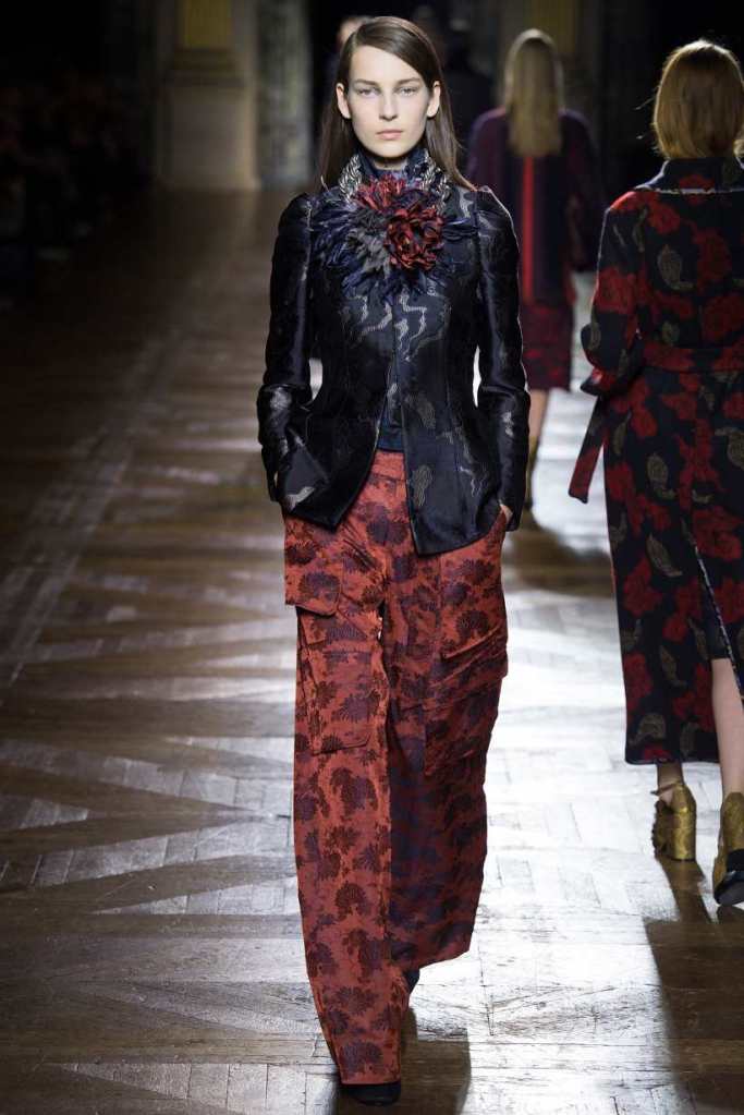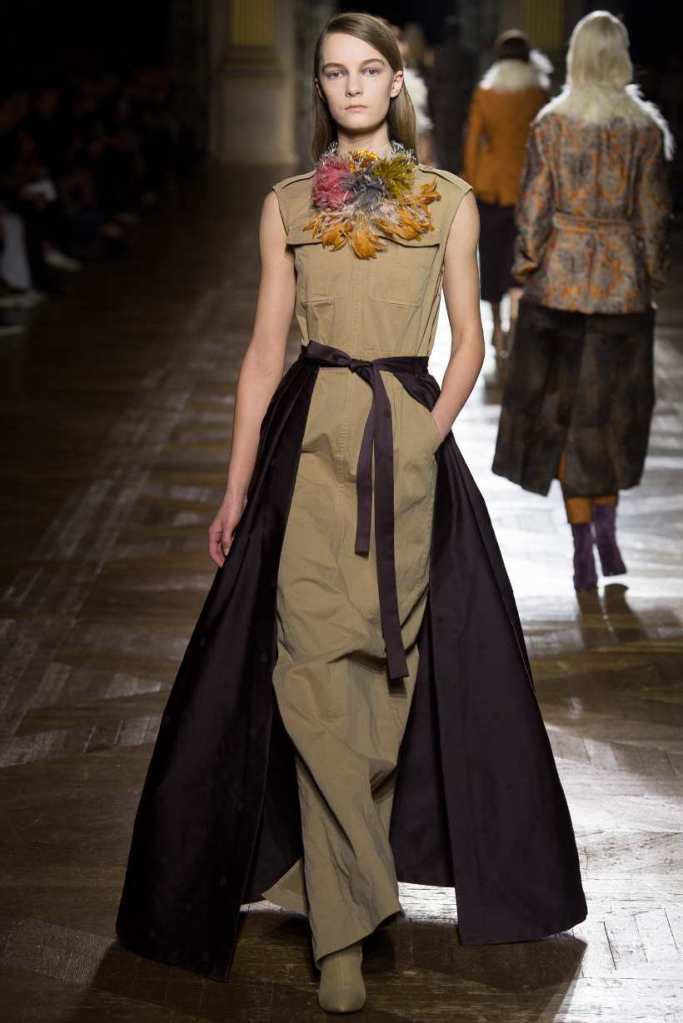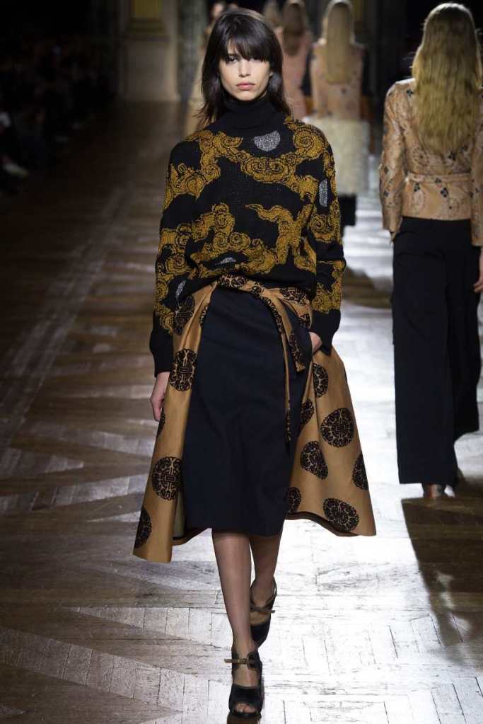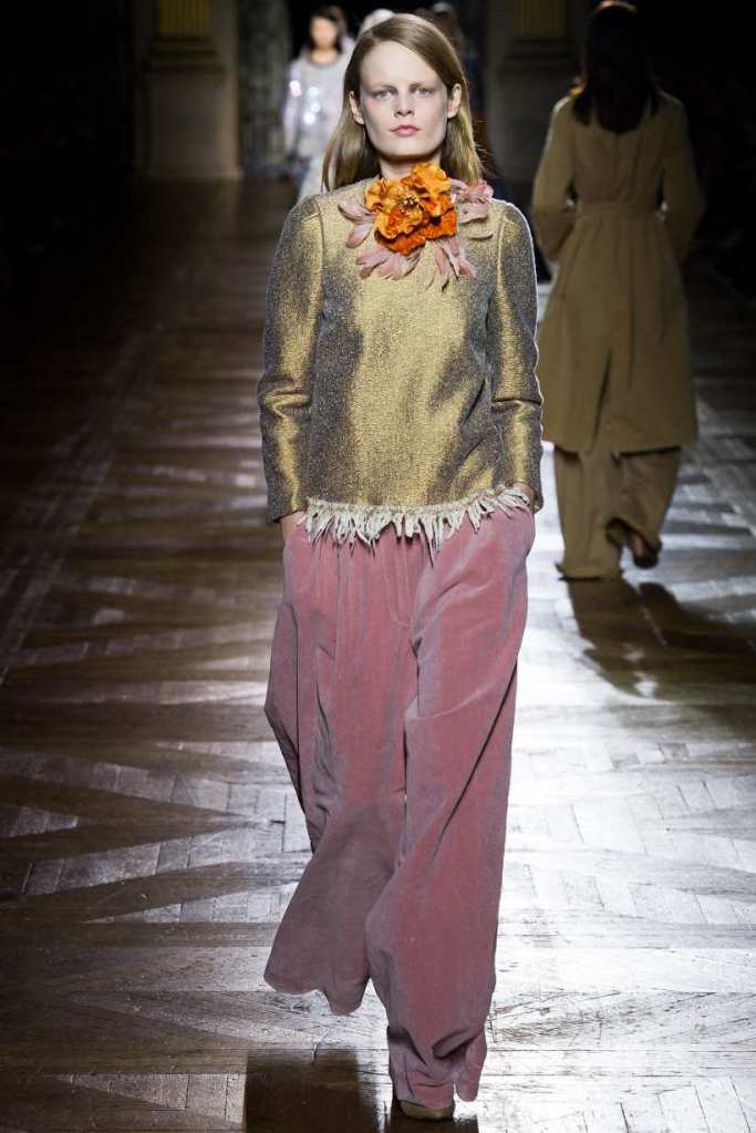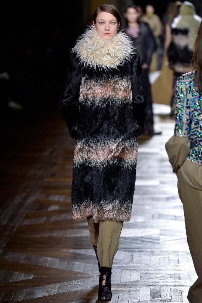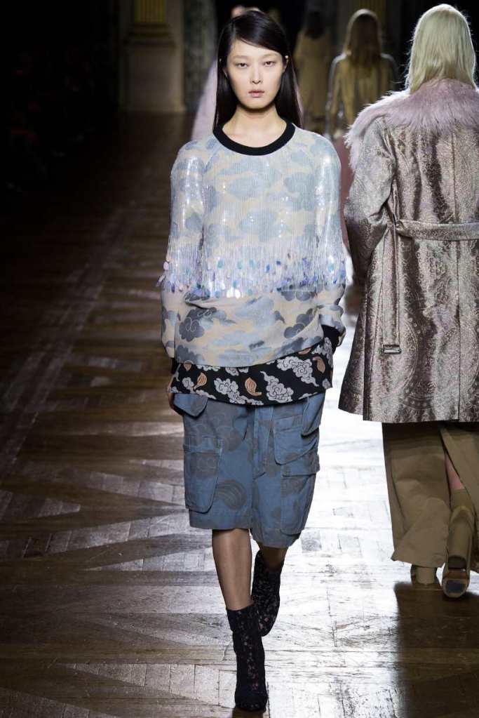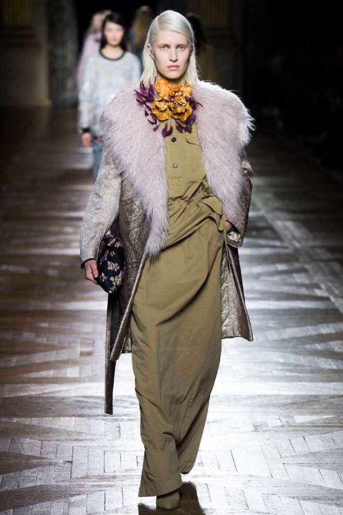 Luxe Bohemia at its finest, with gilding, brocade, and sequins elevating glamour while chinos and baggy shorts grounded the looks. The rich brocades, khakis, and faux furs created an opulent ambiance, while roomy silhouettes comforted the feminine form. With grounded glamour as its motto, the collection exuded eclectic warmth, layering surprising elements in signature style. The Orientalia influence harkened back to Van Noten’s early triumphs, yet he deftly remodeled the past with sheer power and empowerment.