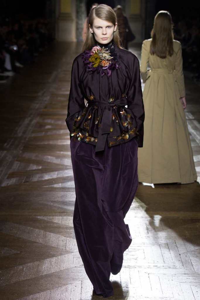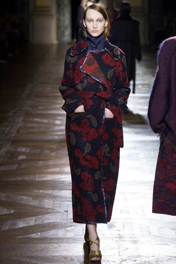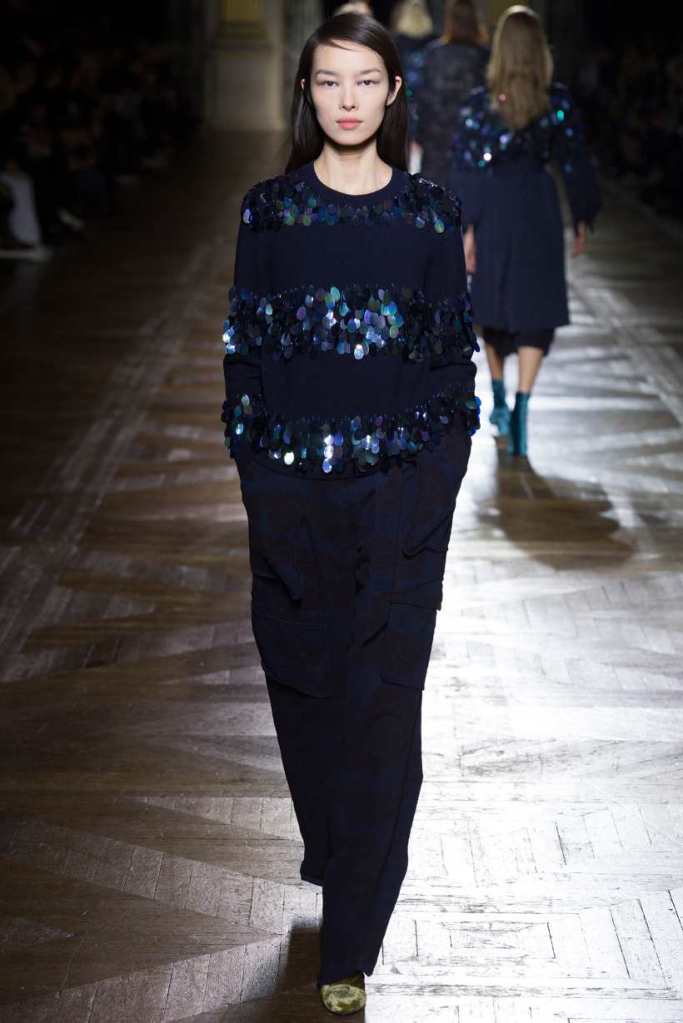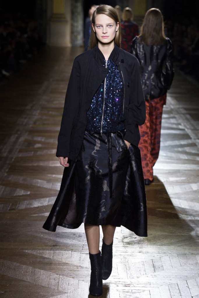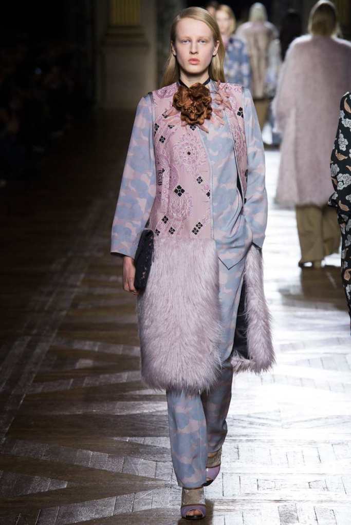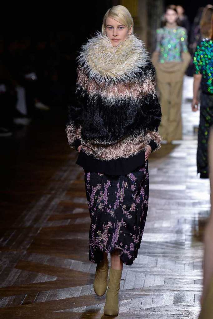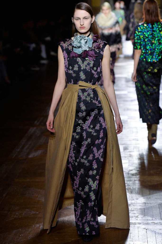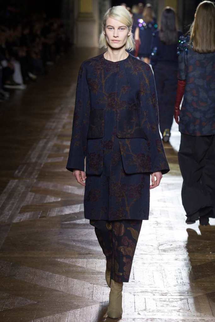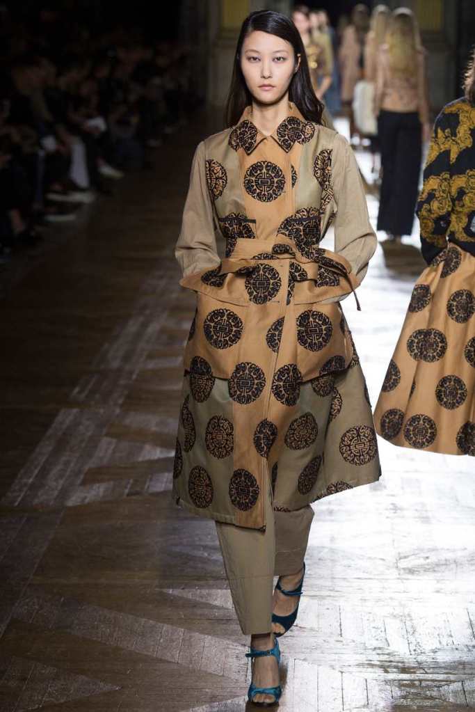 Luxe Bohemia at its finest, with gilding, brocade, and sequins elevating glamour while chinos and baggy shorts grounded the looks. The rich brocades, khakis, and faux furs created an opulent ambiance, while roomy silhouettes comforted the feminine form. With grounded glamour as its motto, the collection exuded eclectic warmth, layering surprising elements in signature style. The Orientalia influence harkened back to Van Noten’s early triumphs, yet he deftly remodeled the past with sheer power and empowerment.